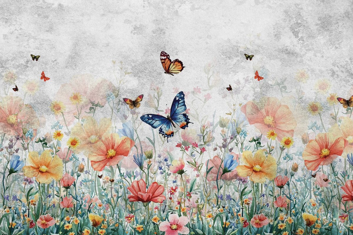 Papier peint : Papillons au-dessus d’une prairie fleurie colorée sur fond texturé dans des tons de gris