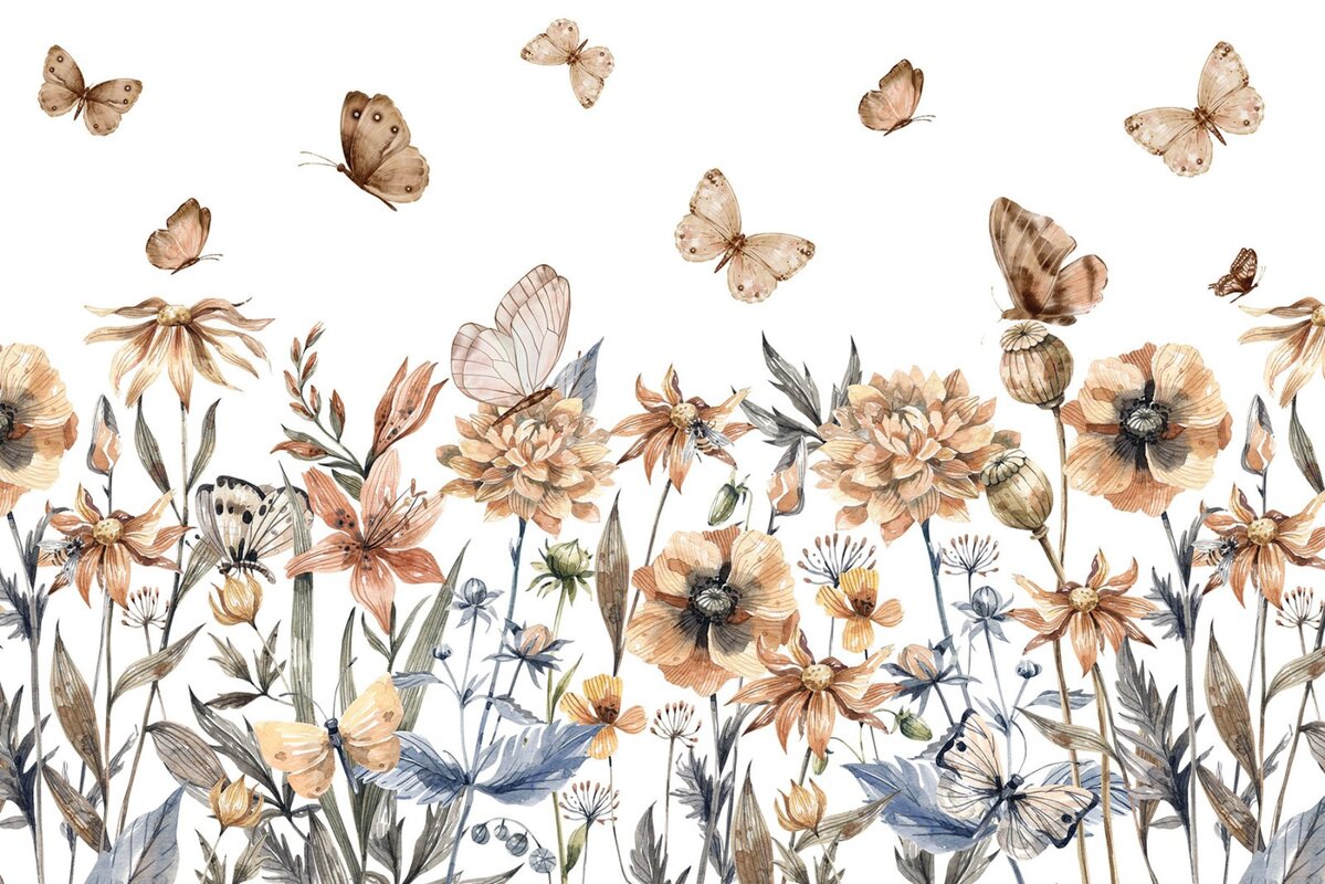 Papier peint : Papillons et fleurs des champs prairie aquarelle sur fond clair