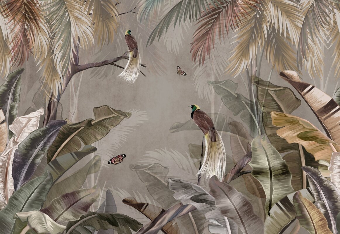 Papier peint : Papillons et oiseaux parmi des feuilles colorées