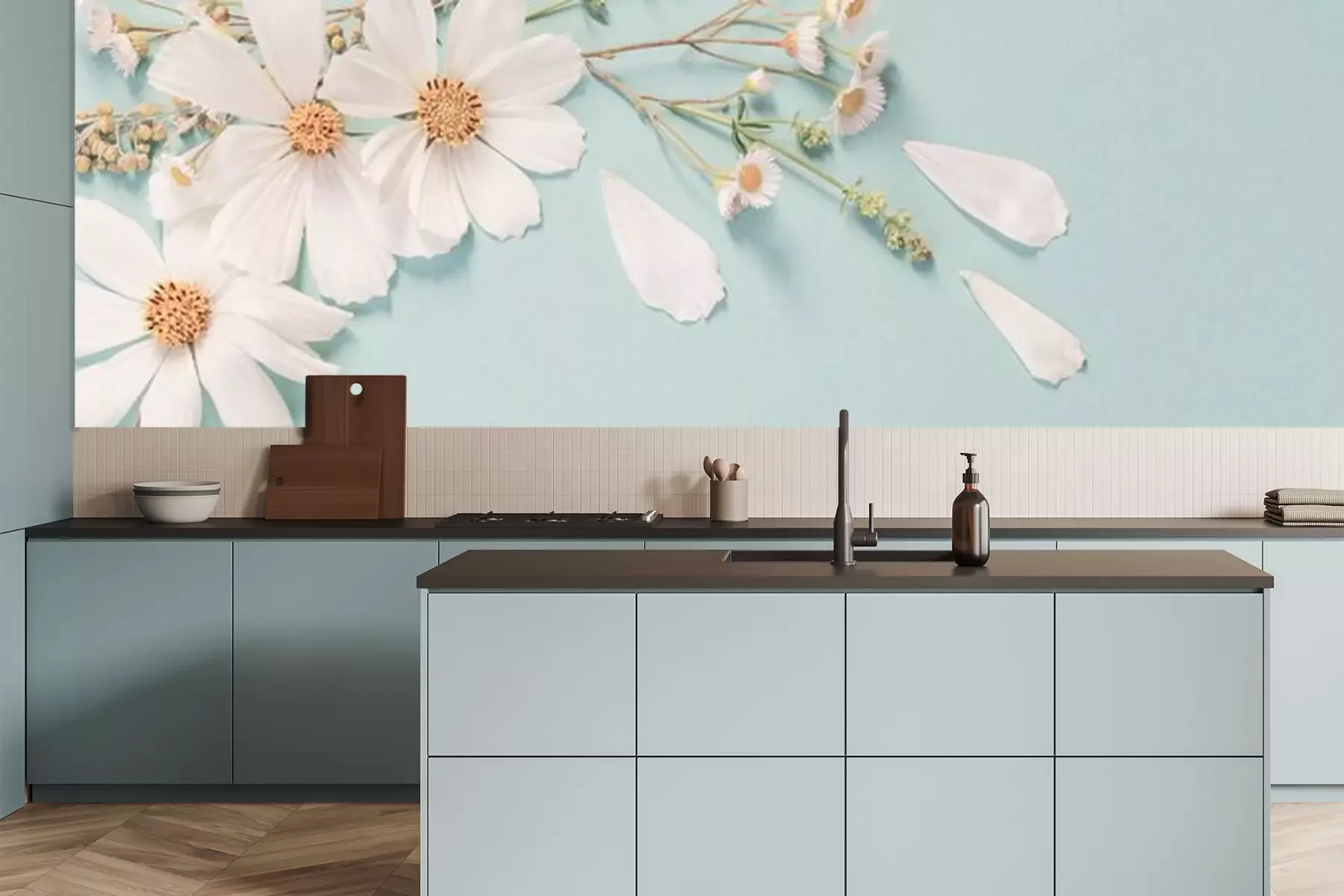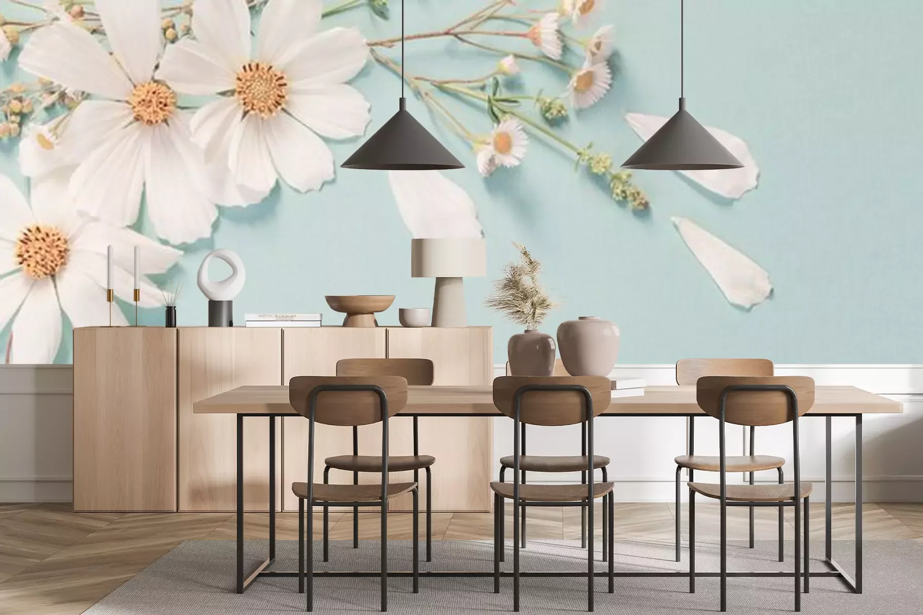 Papier peint  Pâquerettes et pétales sur fond bleu