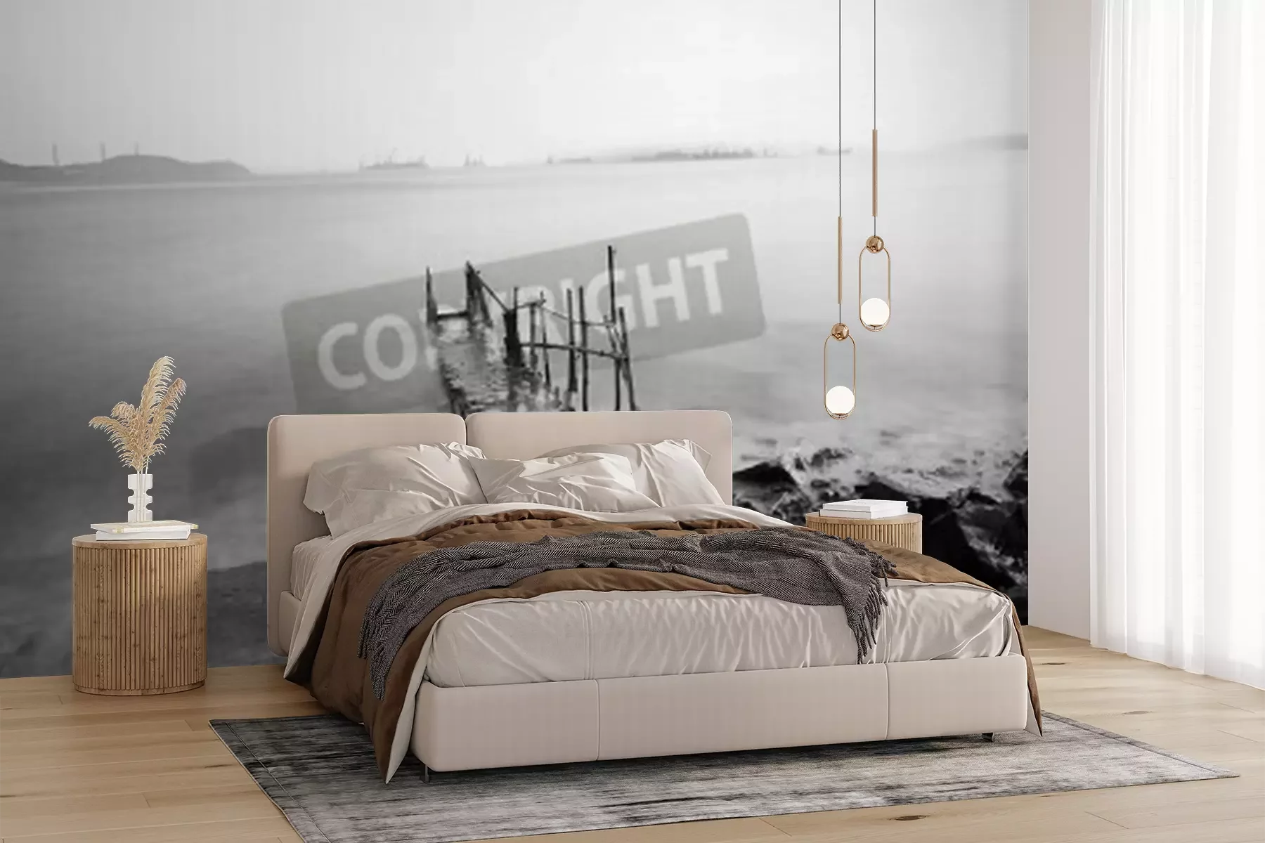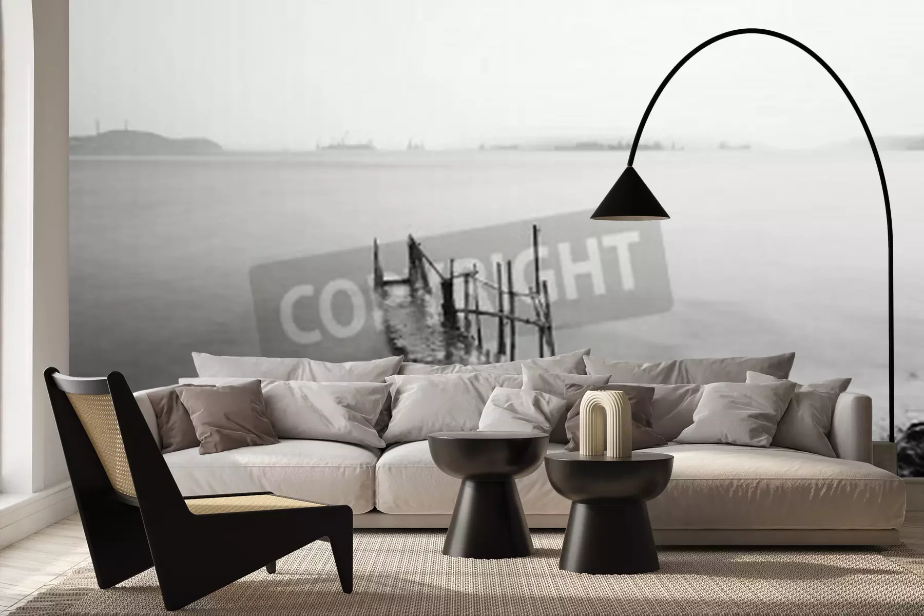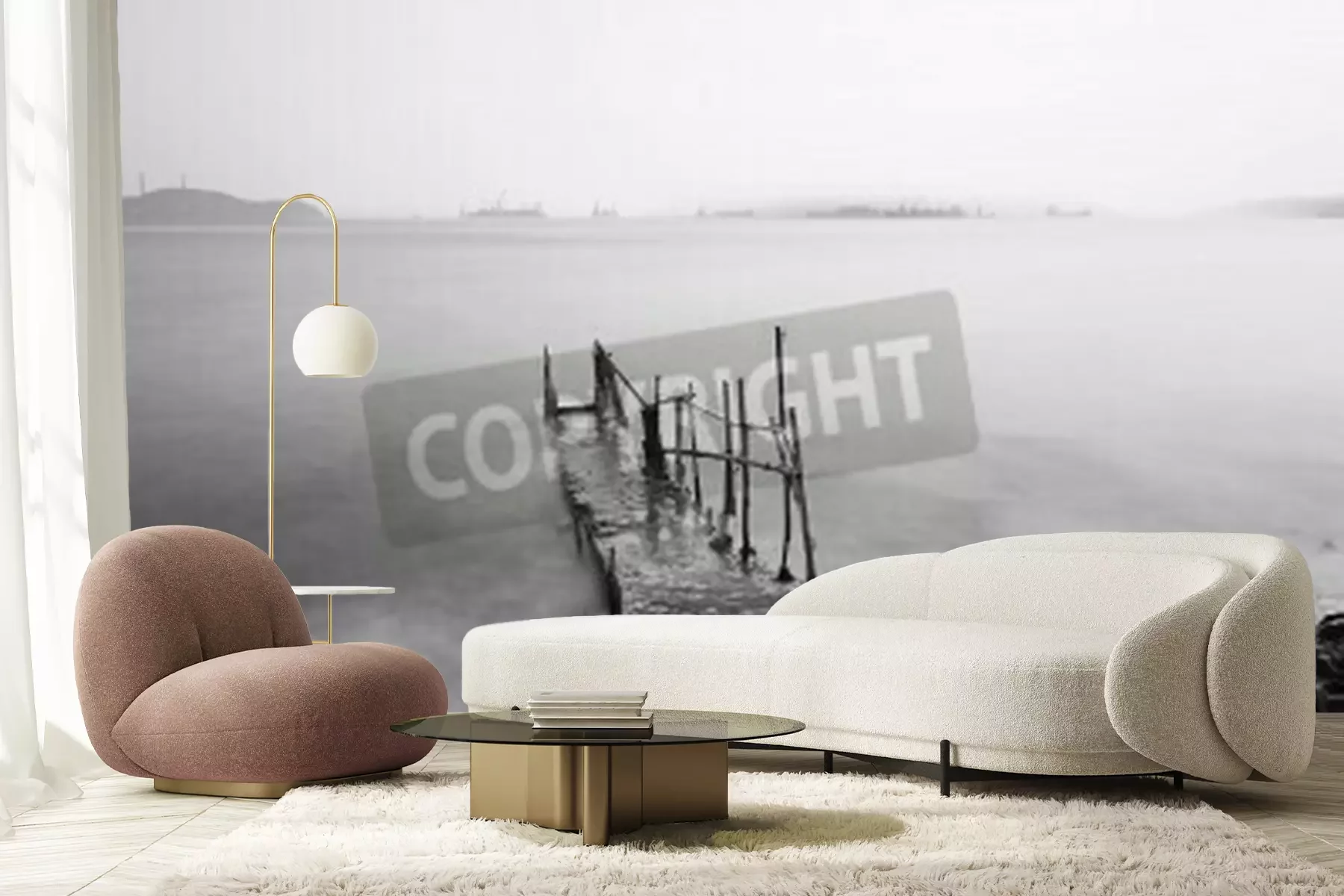 Papier peint  Passerelle abîmée noir et blanc brouillard