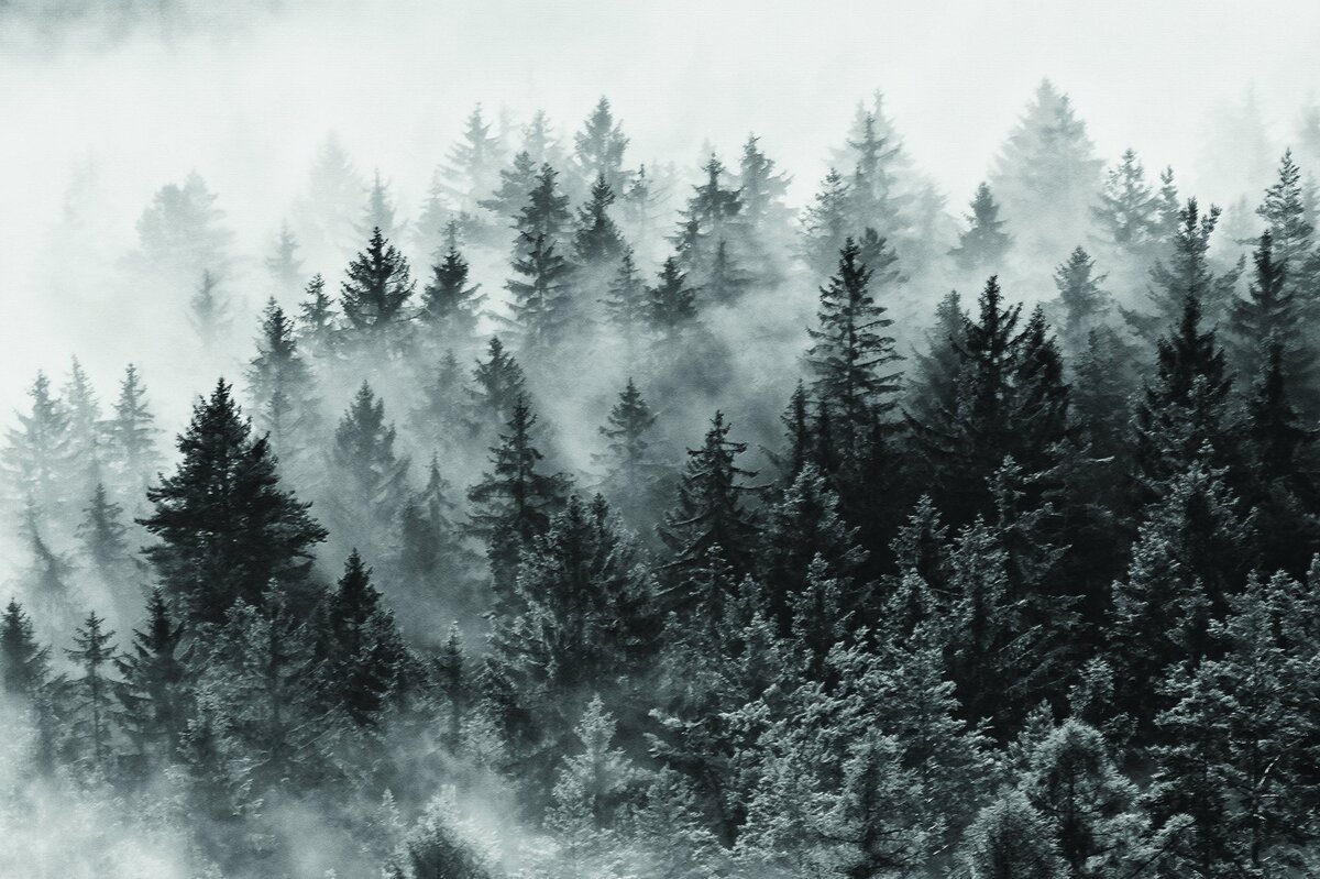 Papier peint : Paysage de forêt de conifères dans le brouillard