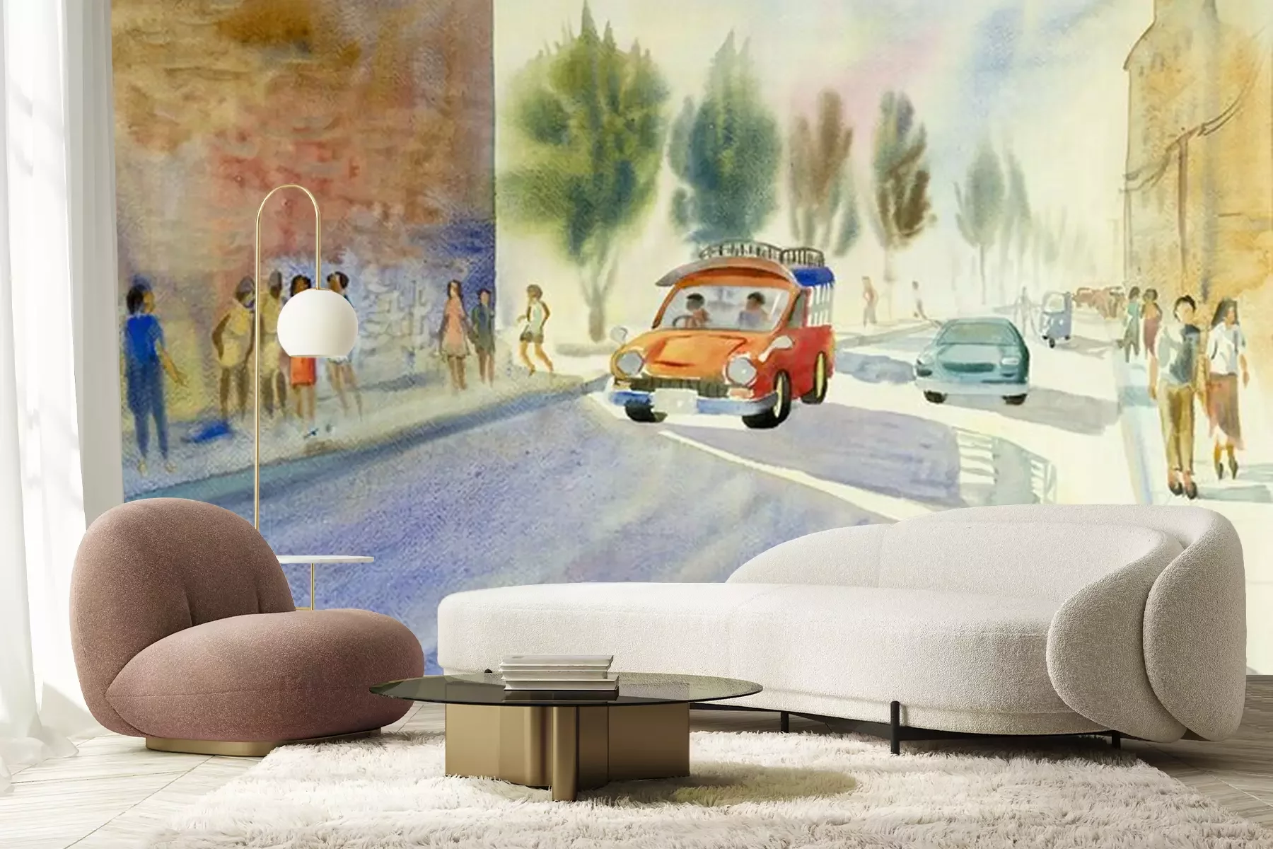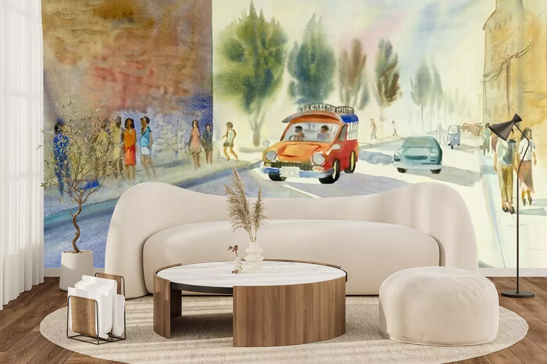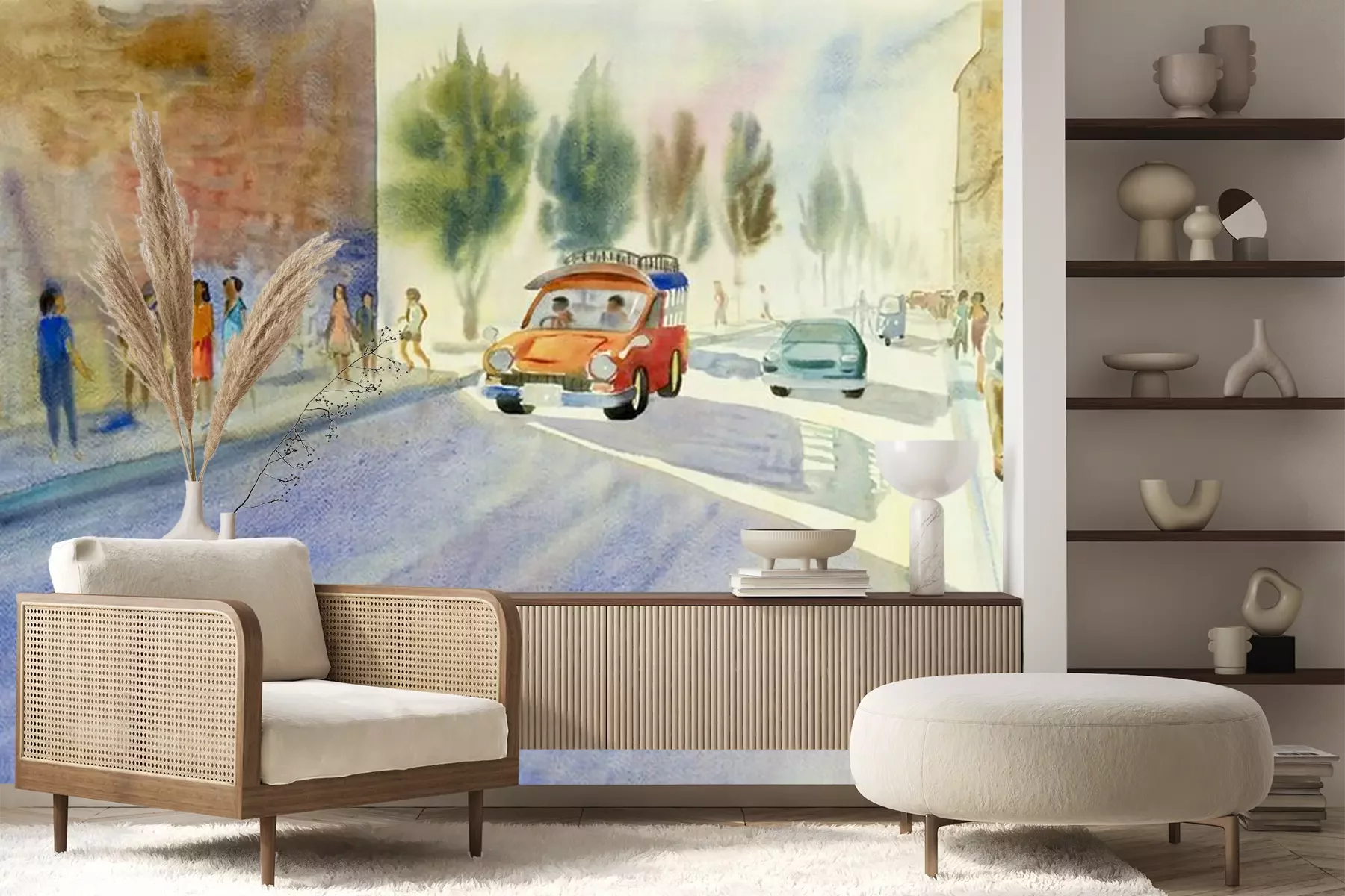 Papier peint  Peinture colorée de petit bus rouge sur la route de phare