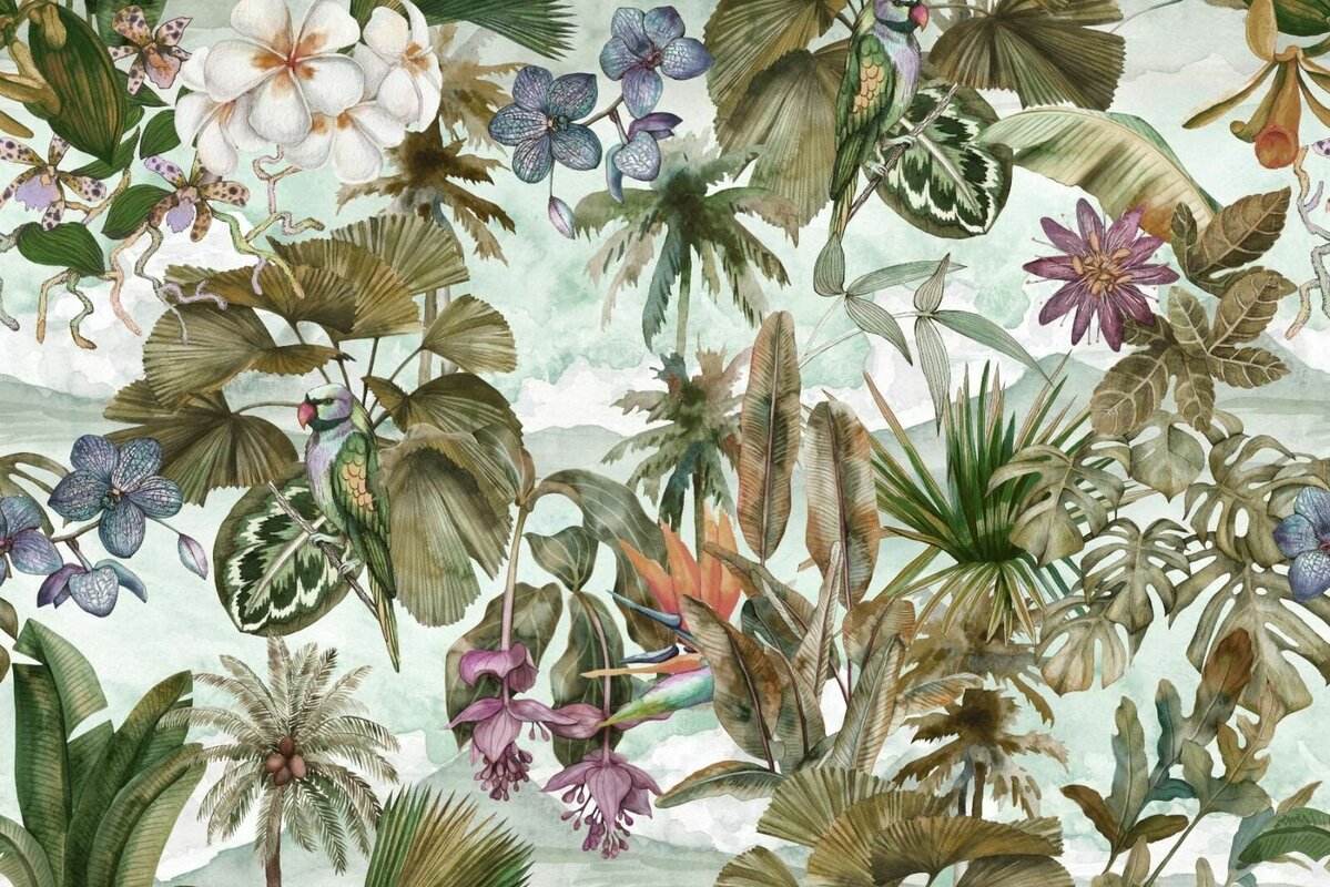 Papier peint : Perroquet coloré parmi les feuilles et les fleurs