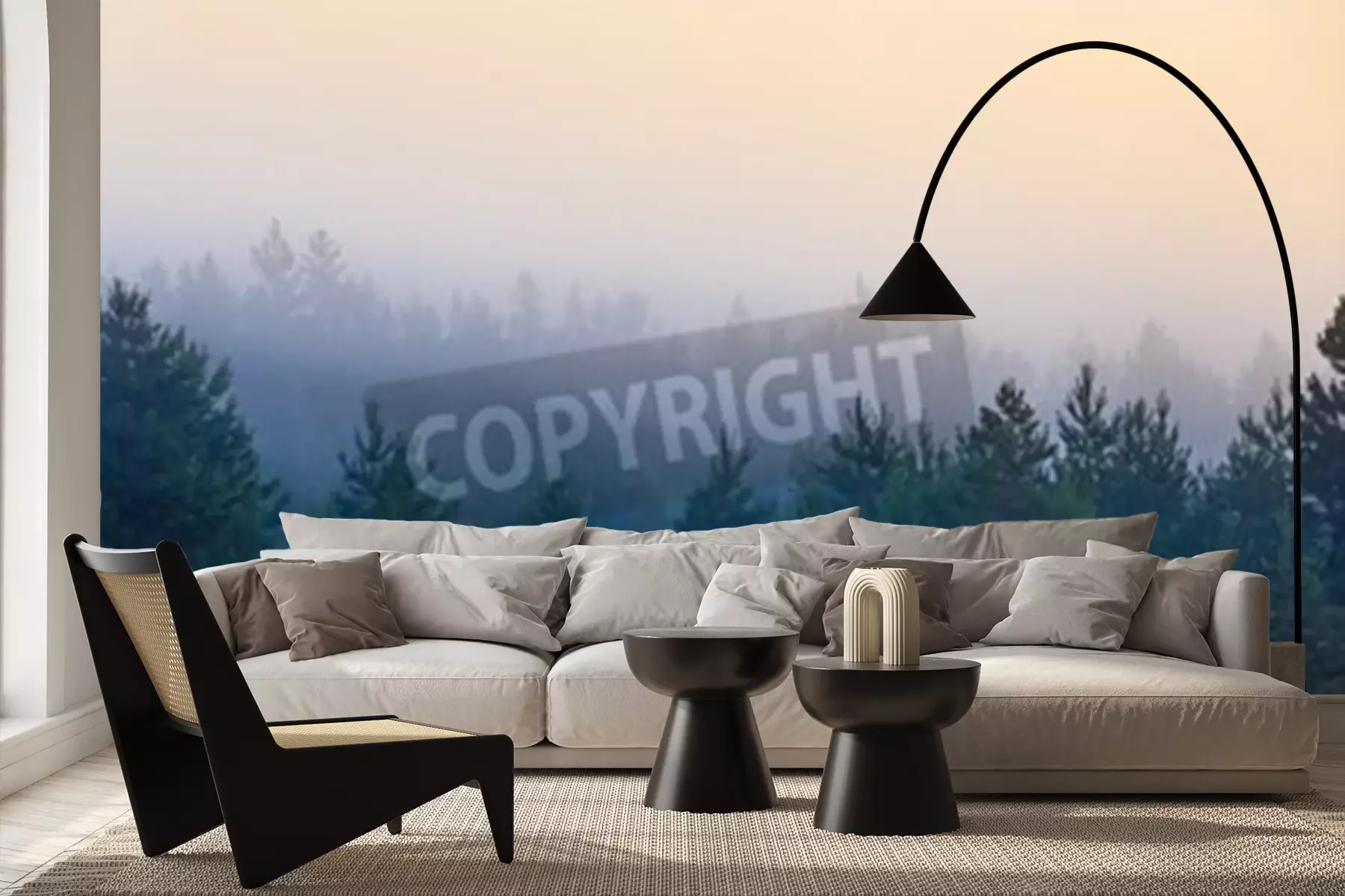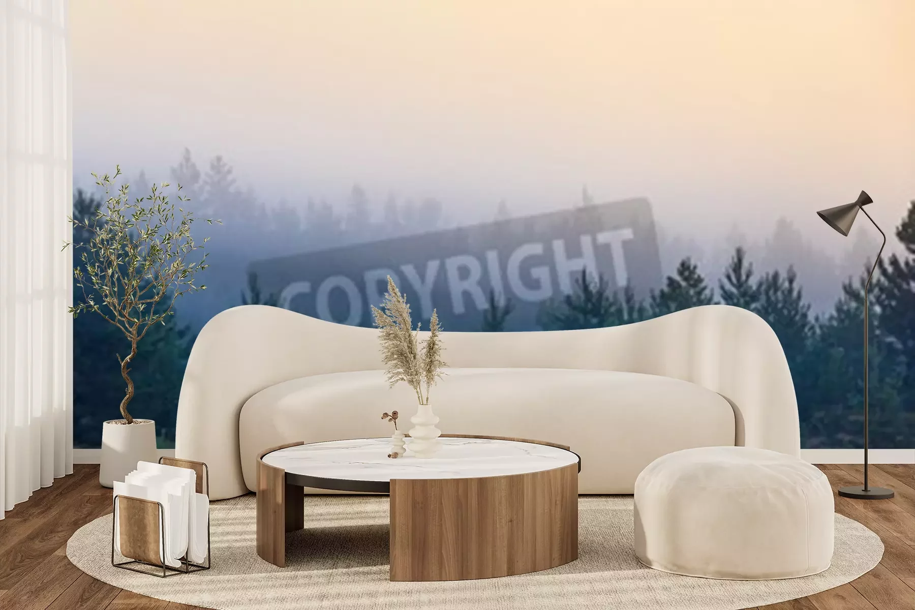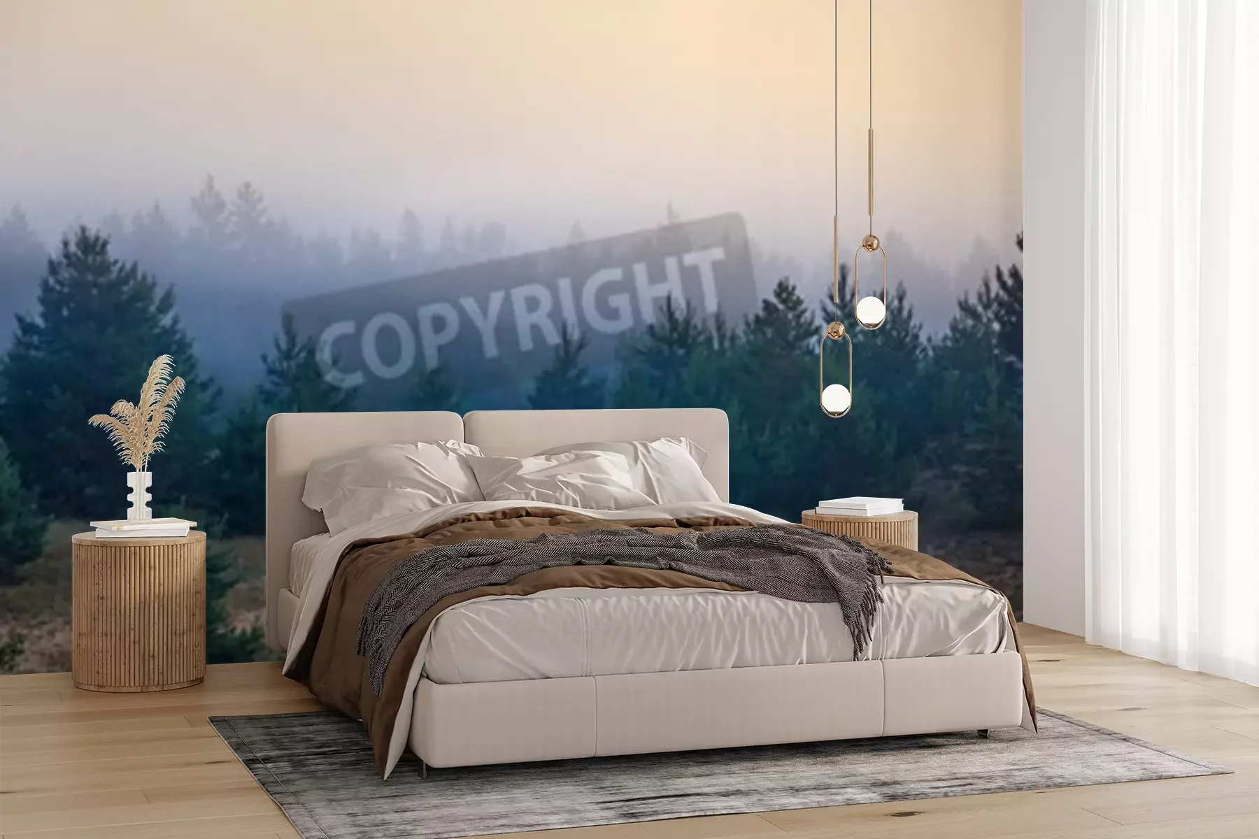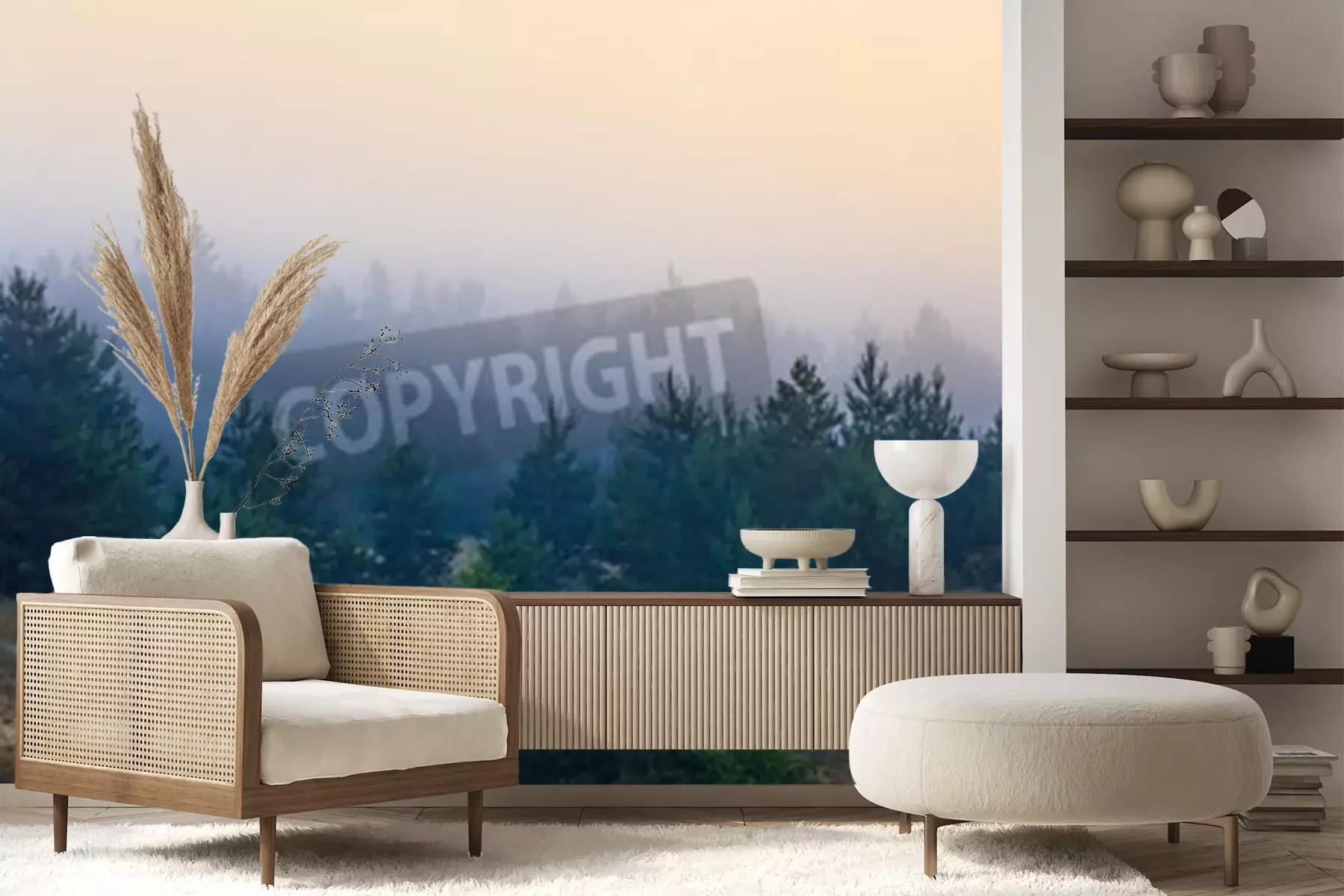 Papier peint  Petits conifères entourés de brume