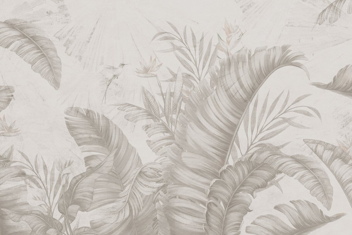 Papier peint : Plantes exotiques, strelitzia et feuilles de bananier sur fond texturé aux couleurs sobres