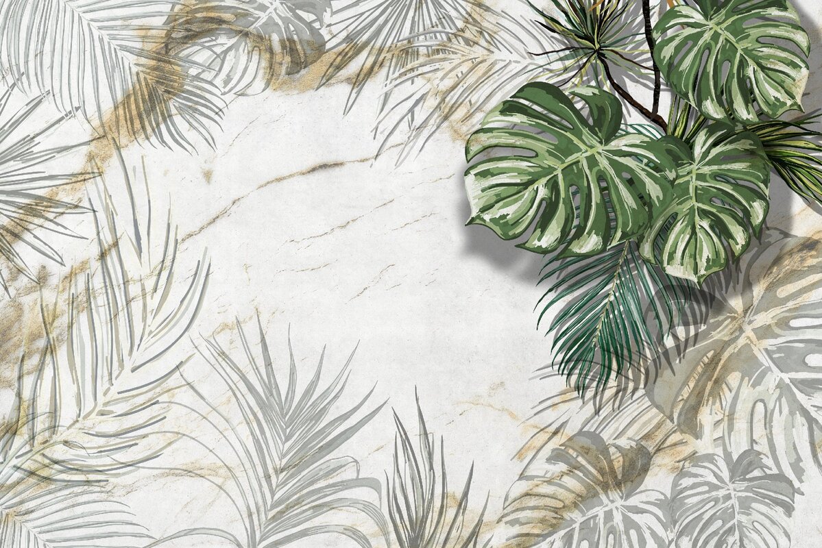 Papier peint : Plantes tropicales monstera et palmier sur fond en marbre