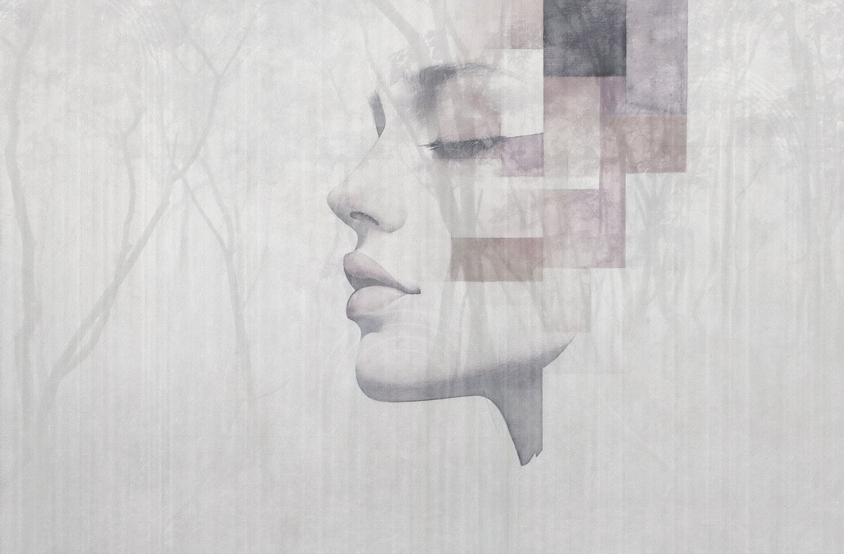 Papier peint : Portrait aquarelle d'une femme avec un paysage forestier d'arbres en arrière-plan