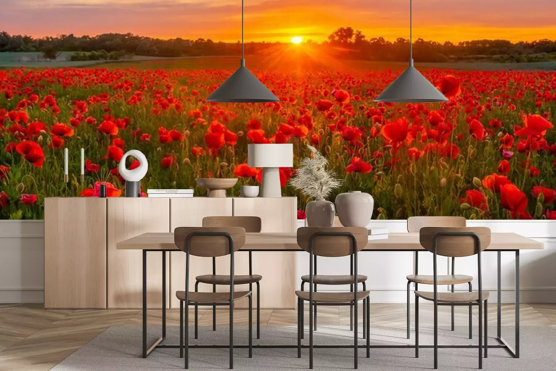 Papier peint  Prairie avec des coquelicots au coucher du soleil