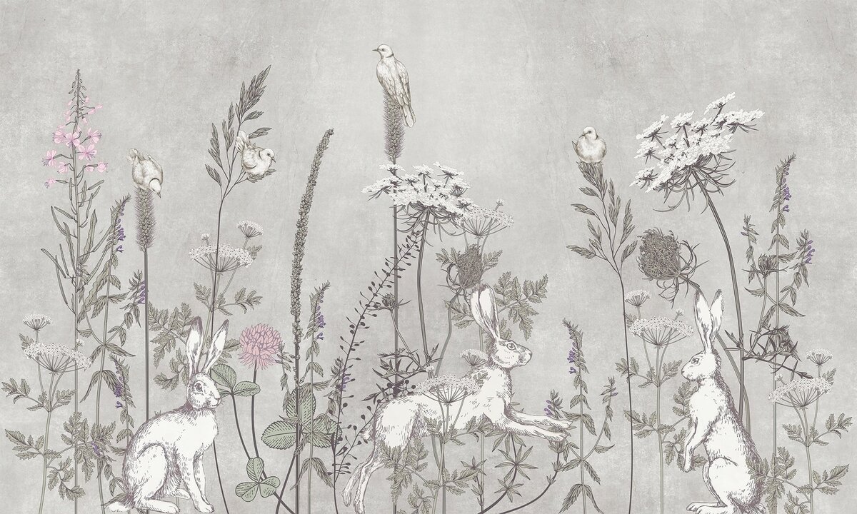Papier peint : Prairie avec des fleurs sauvages et des lièvres