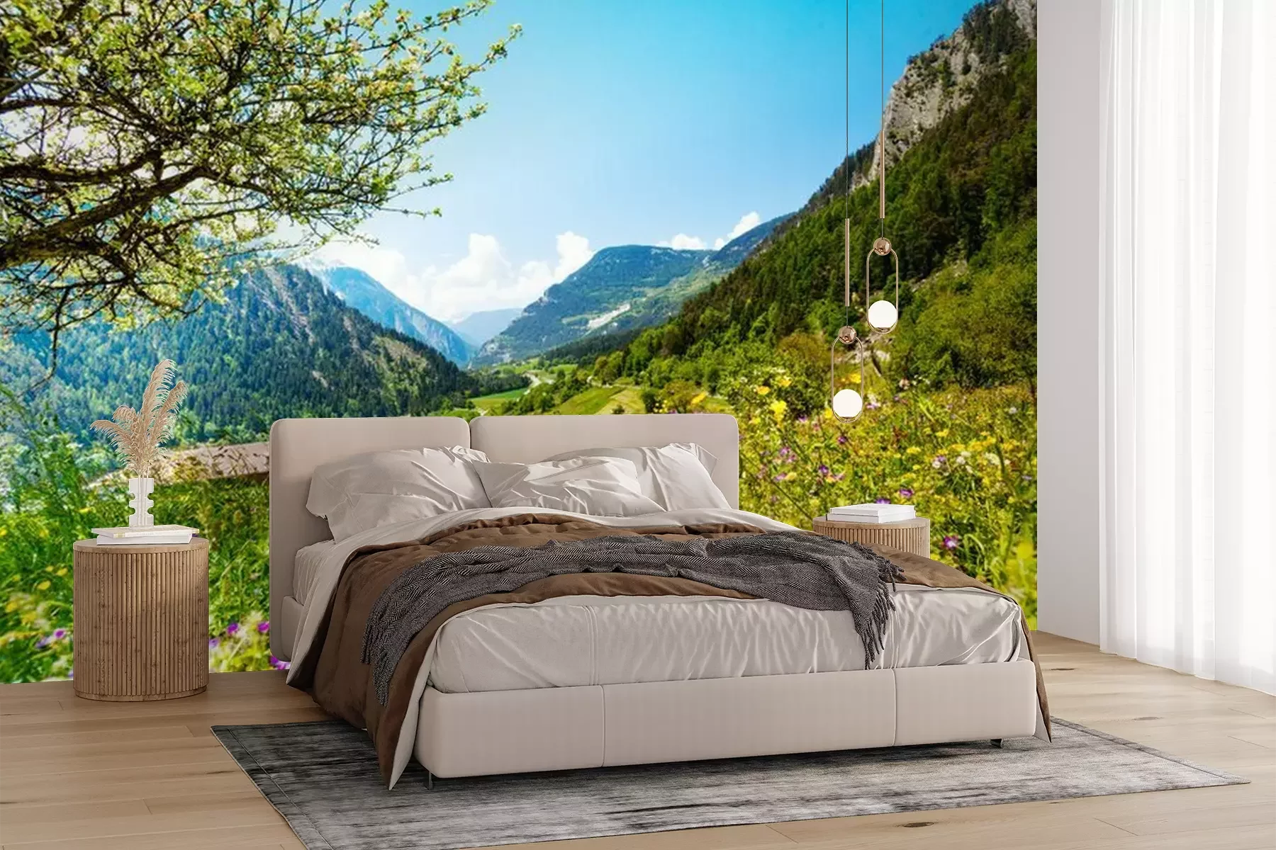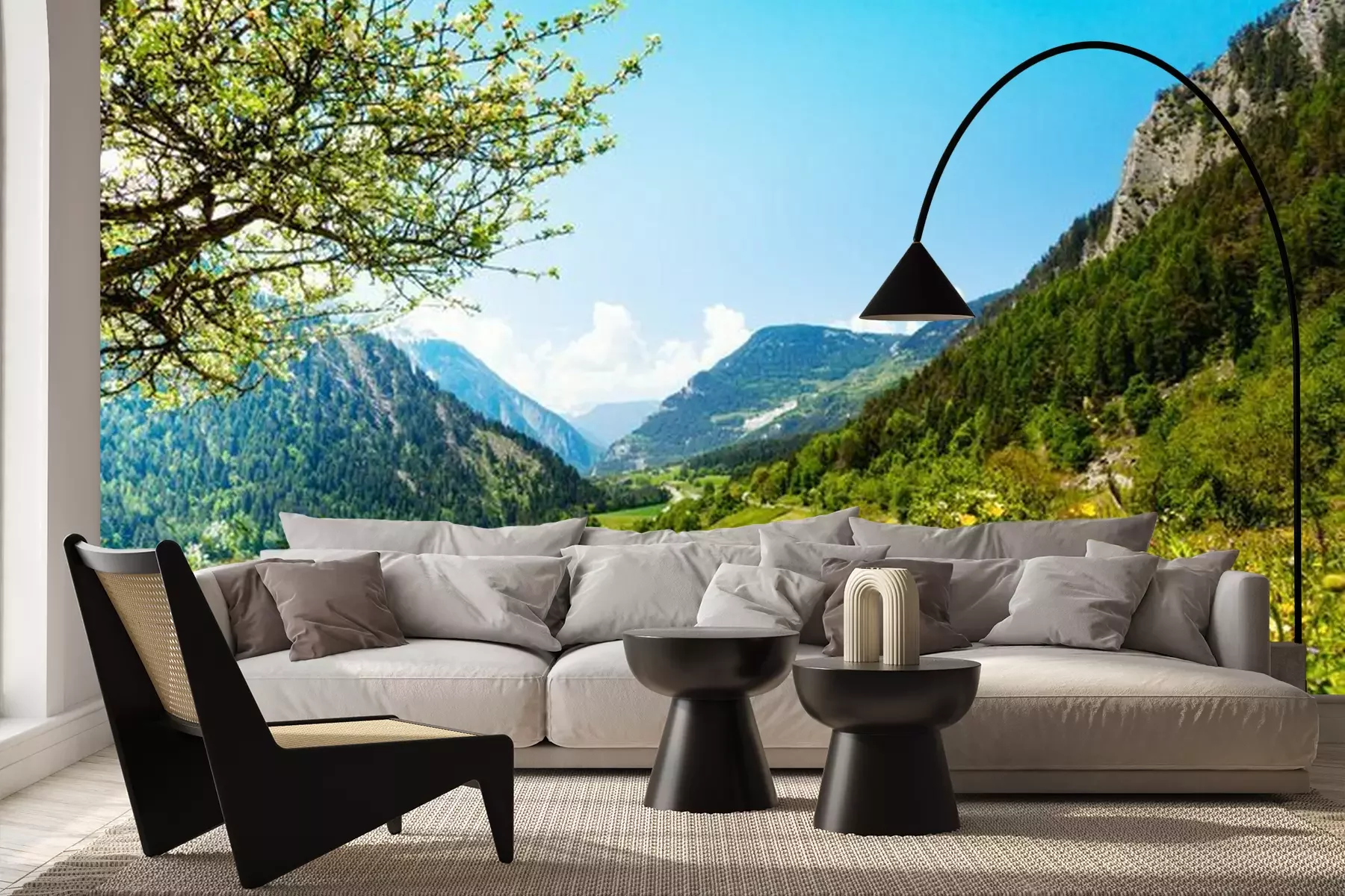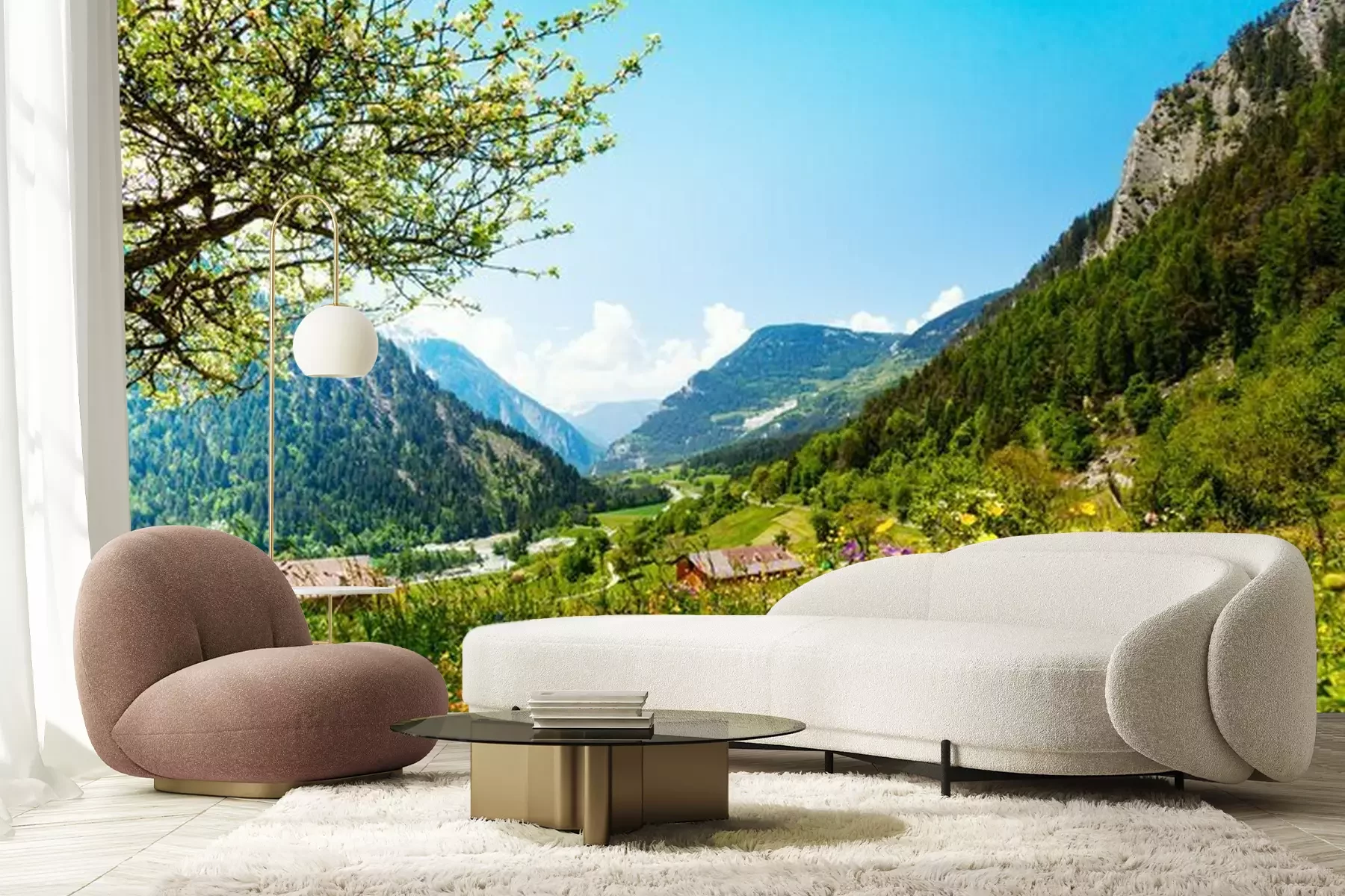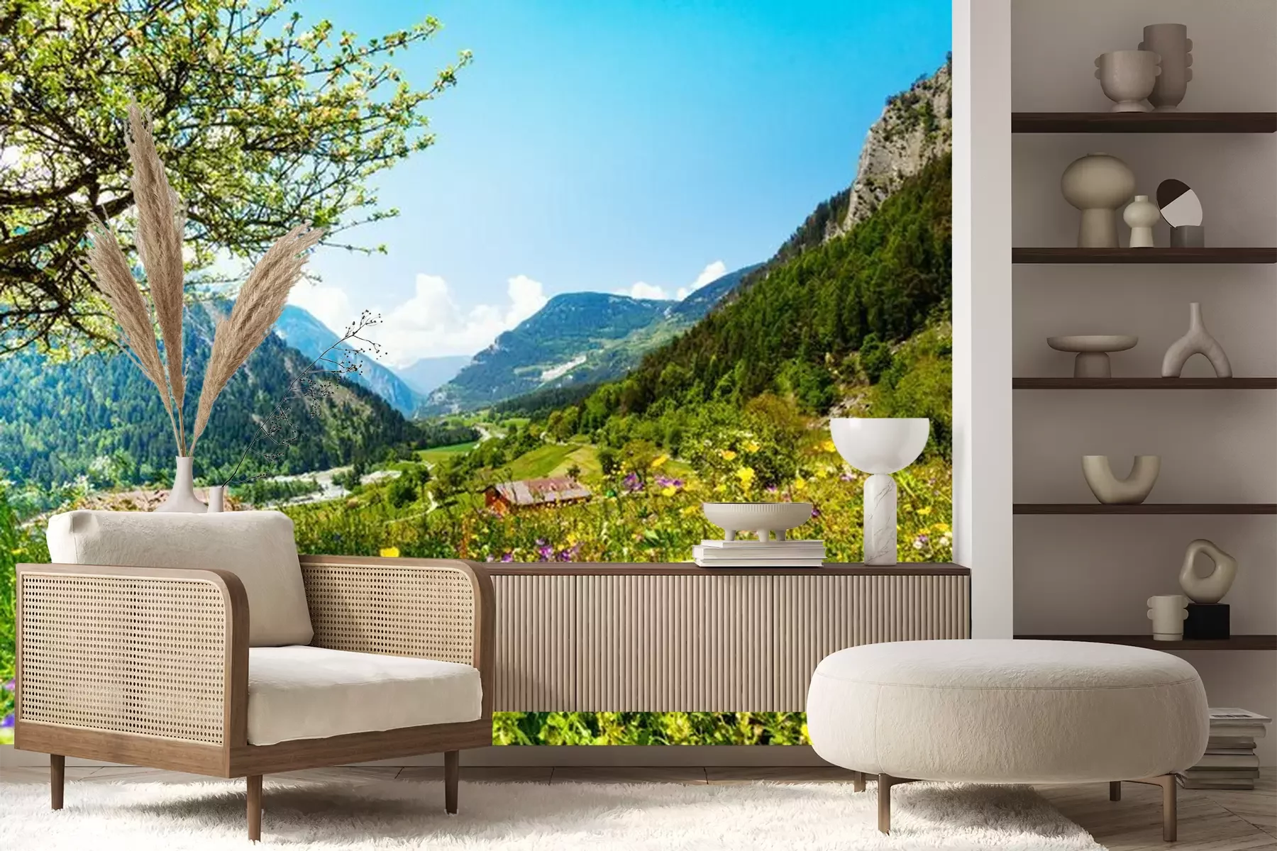 Paysage avec rivière et maisons en SuisseLivraison sans problème assurée par des transporteurs de confiance