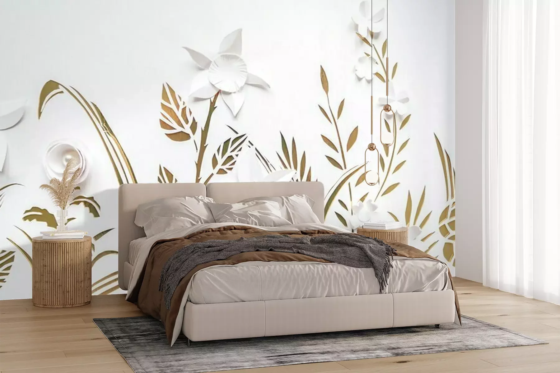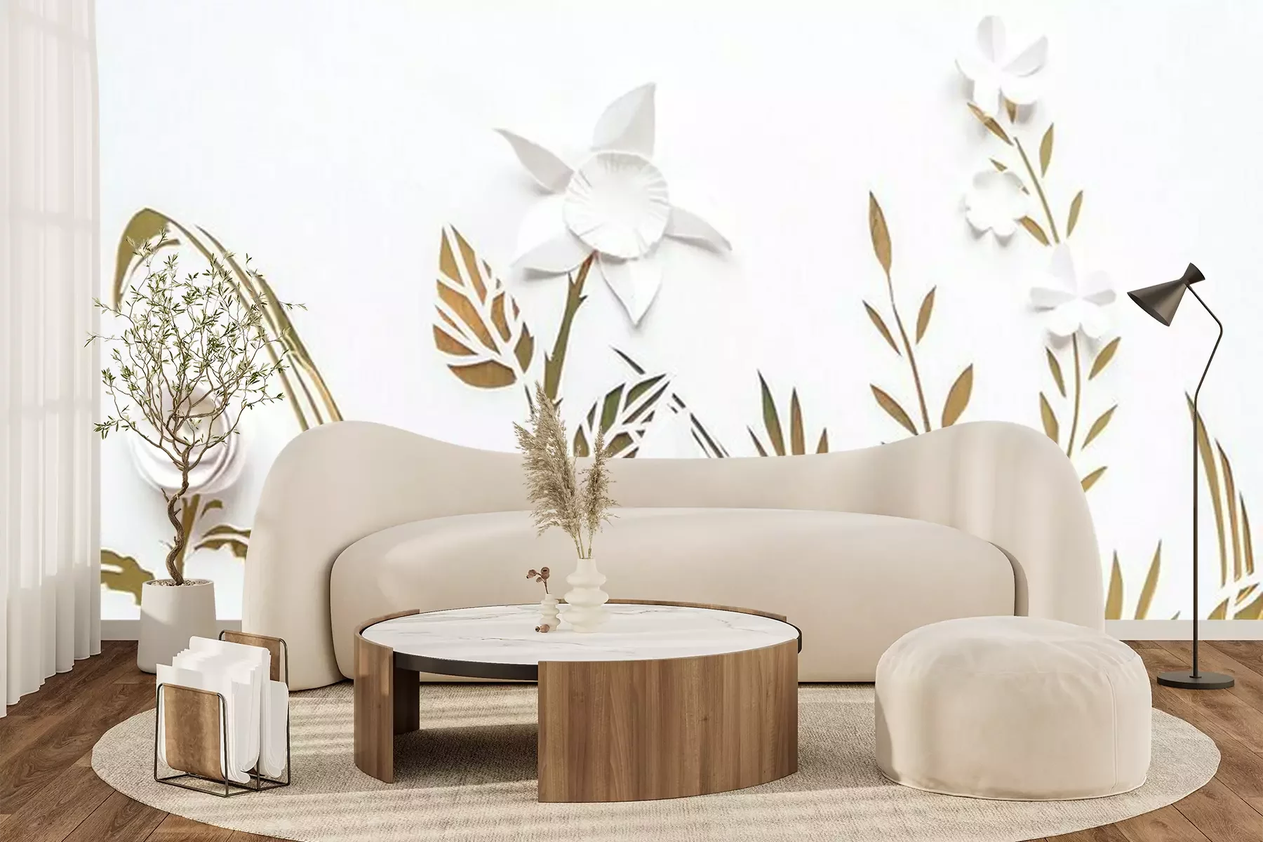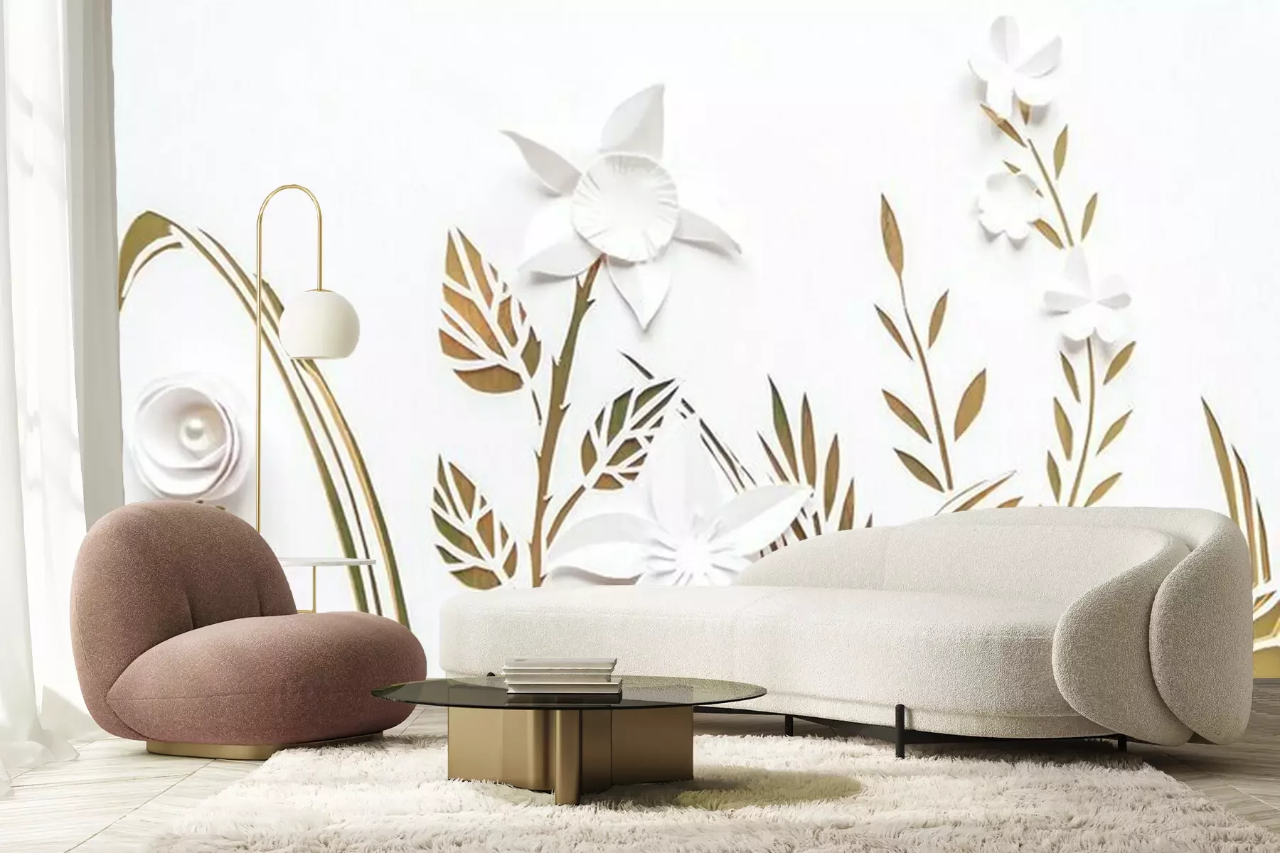 Papier peint  Prairie florissante d'été. Des fleurs blanches étirées en papier sur un fond blanc et doré.