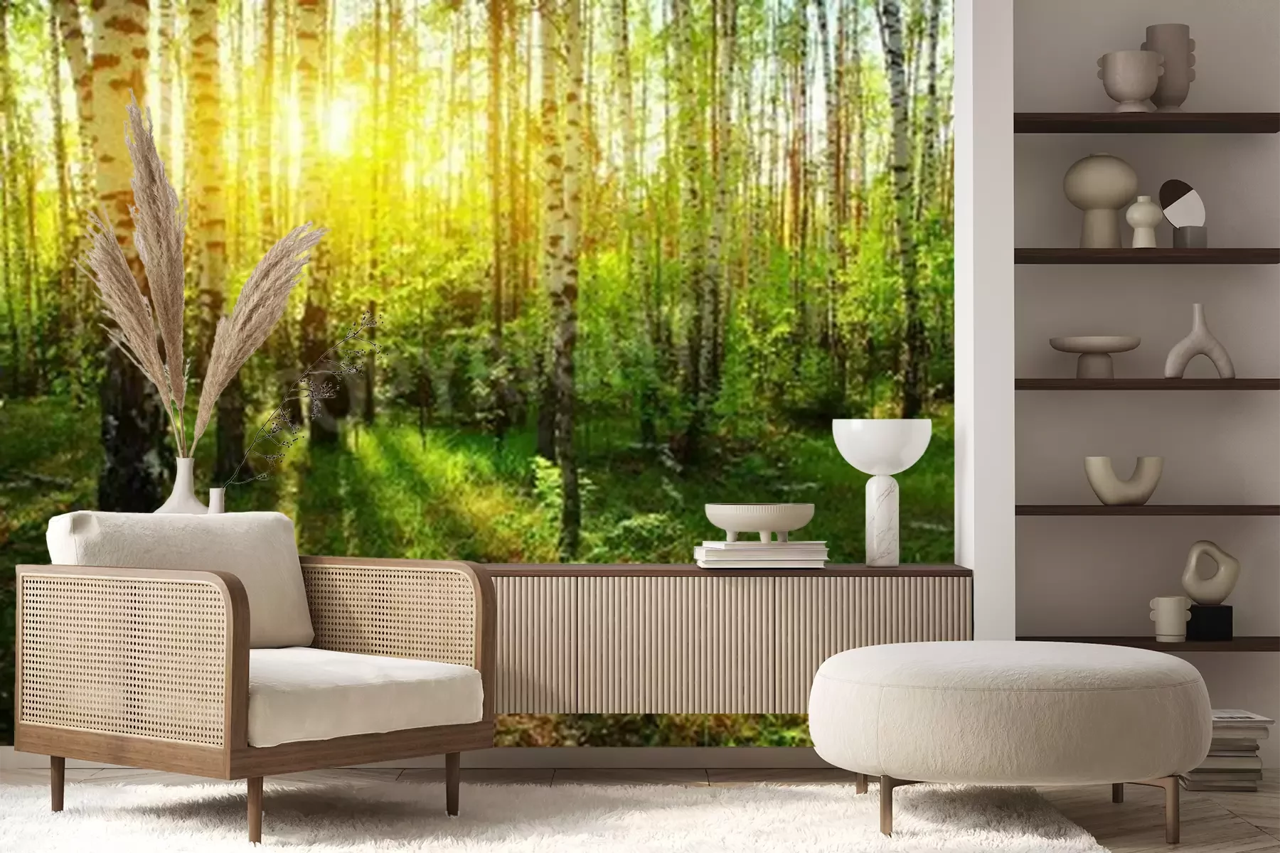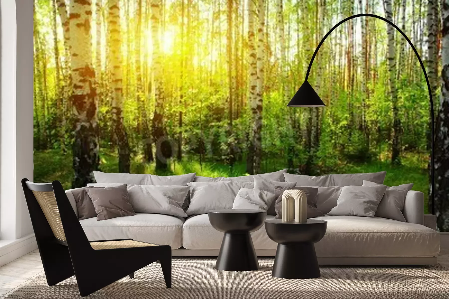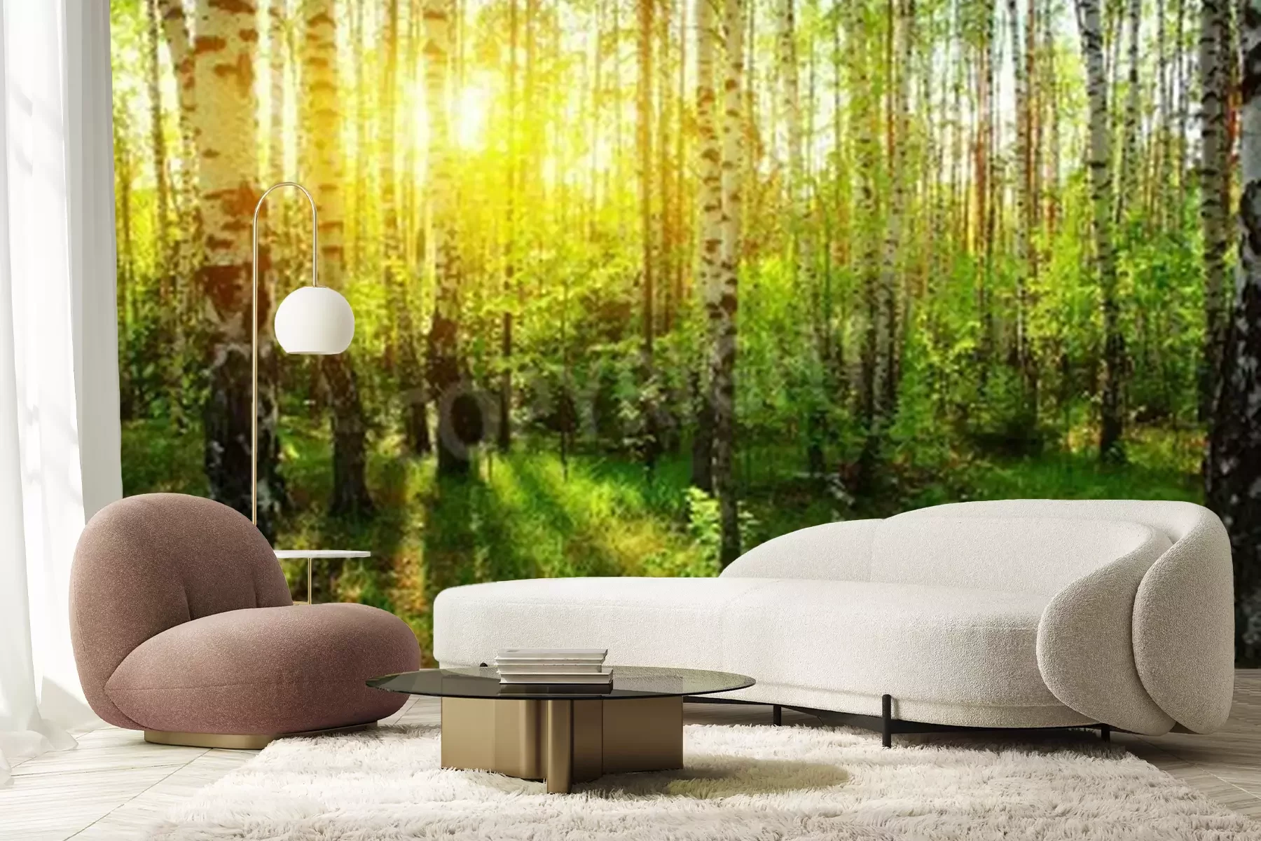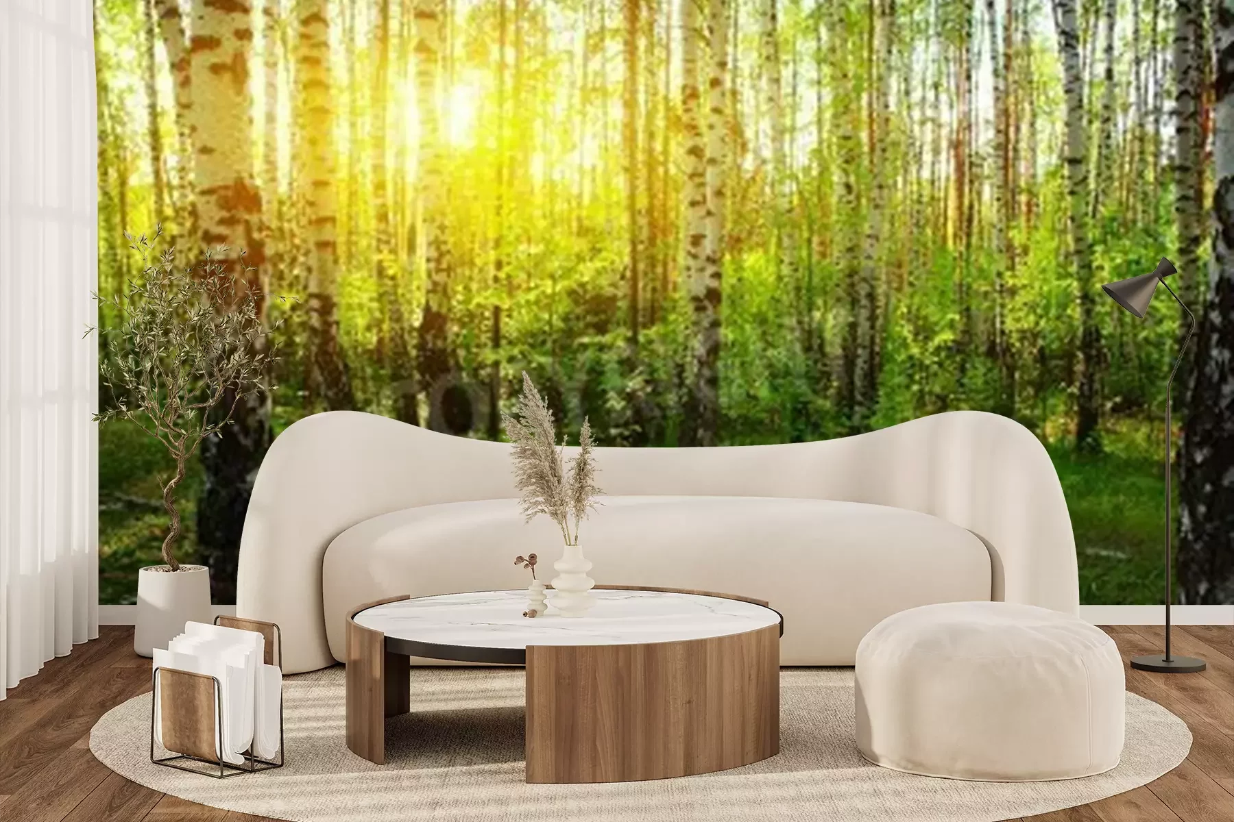 Papier peint  Rayons de soleil dans une forêt de bouleaux