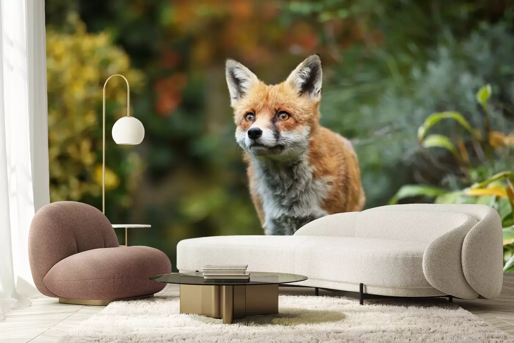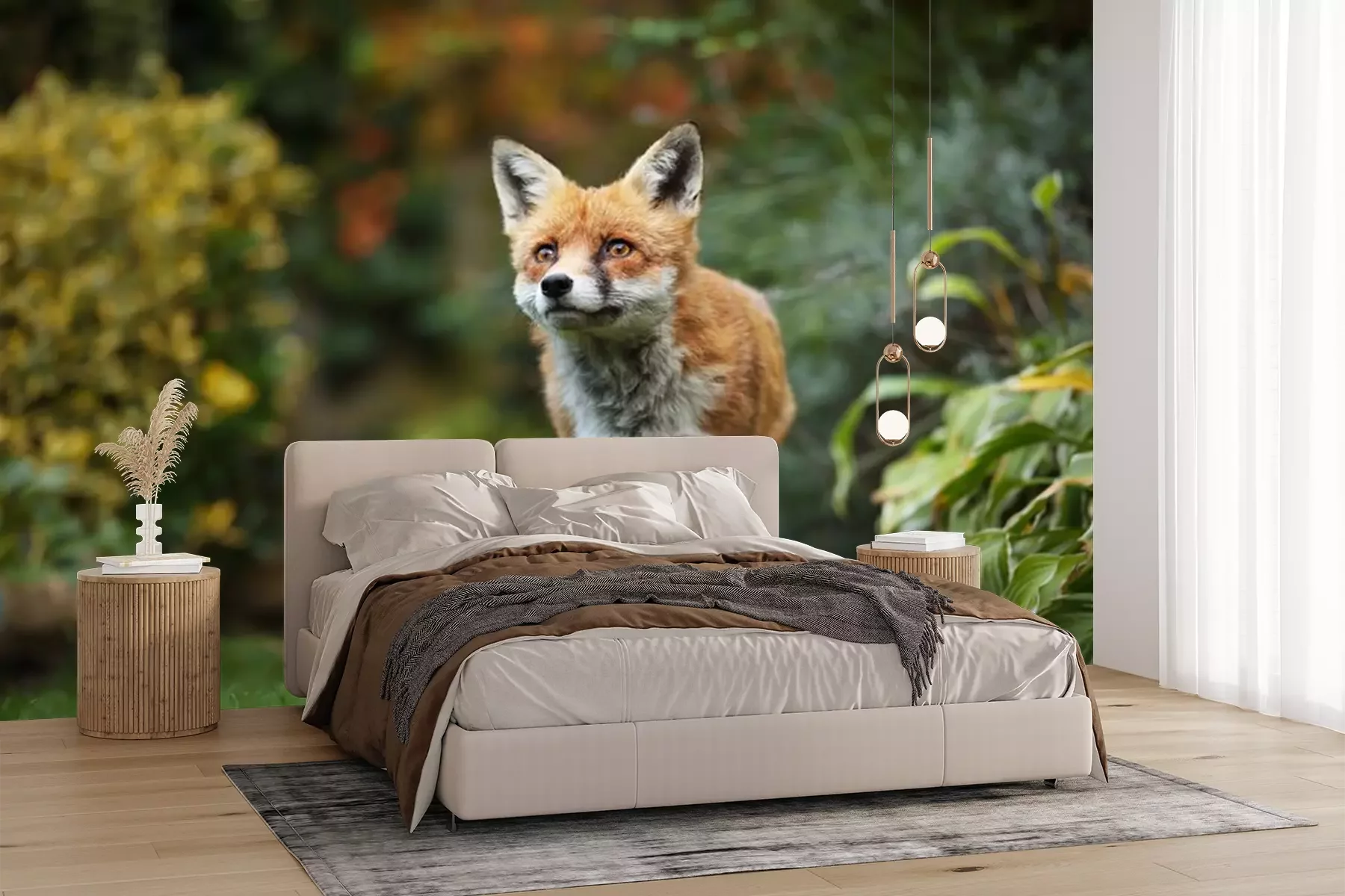 Papier peint  Red fox standing in the garden with flowers