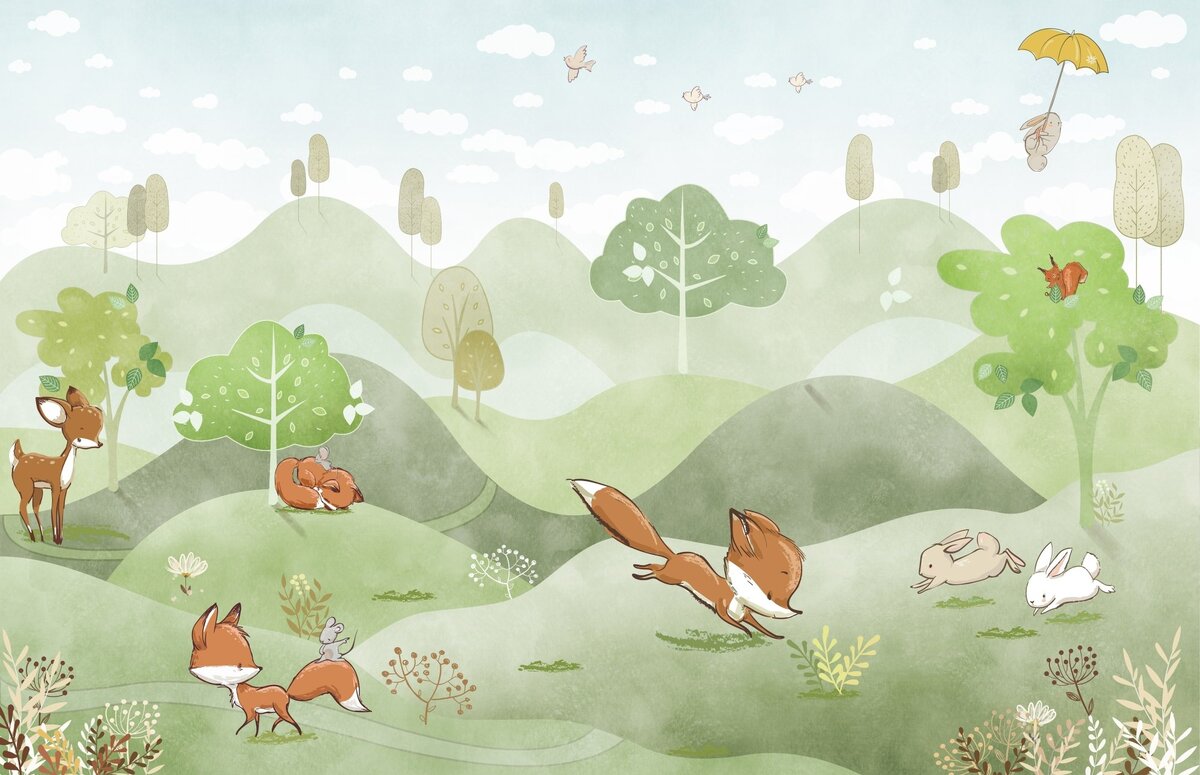Papier peint : Renards de conte de fées courant sur les collines