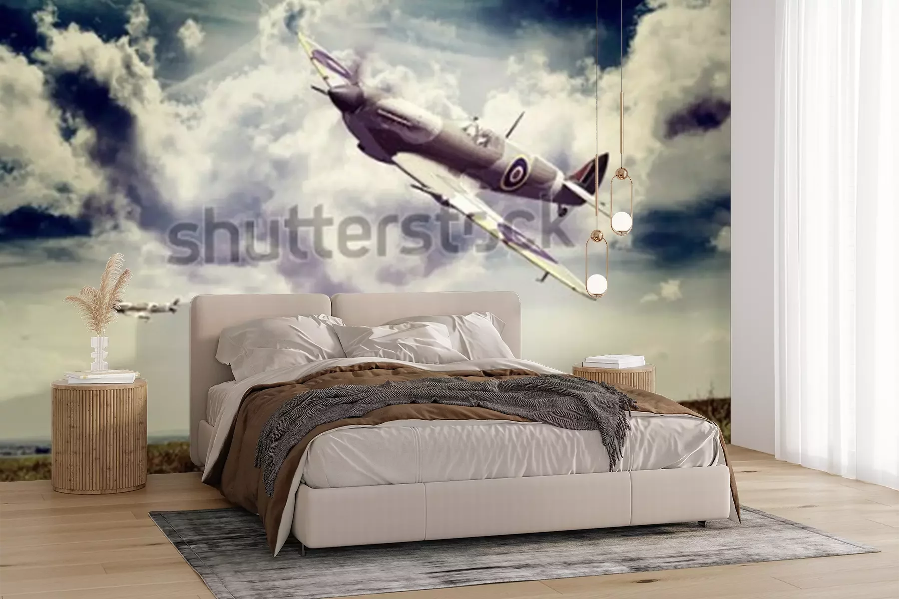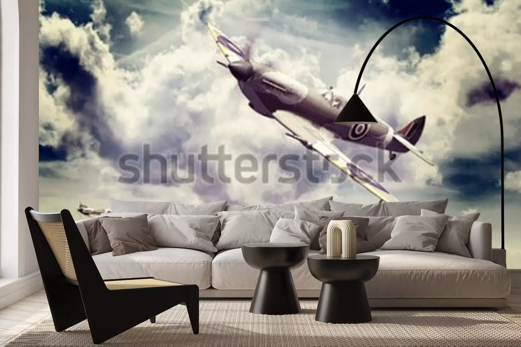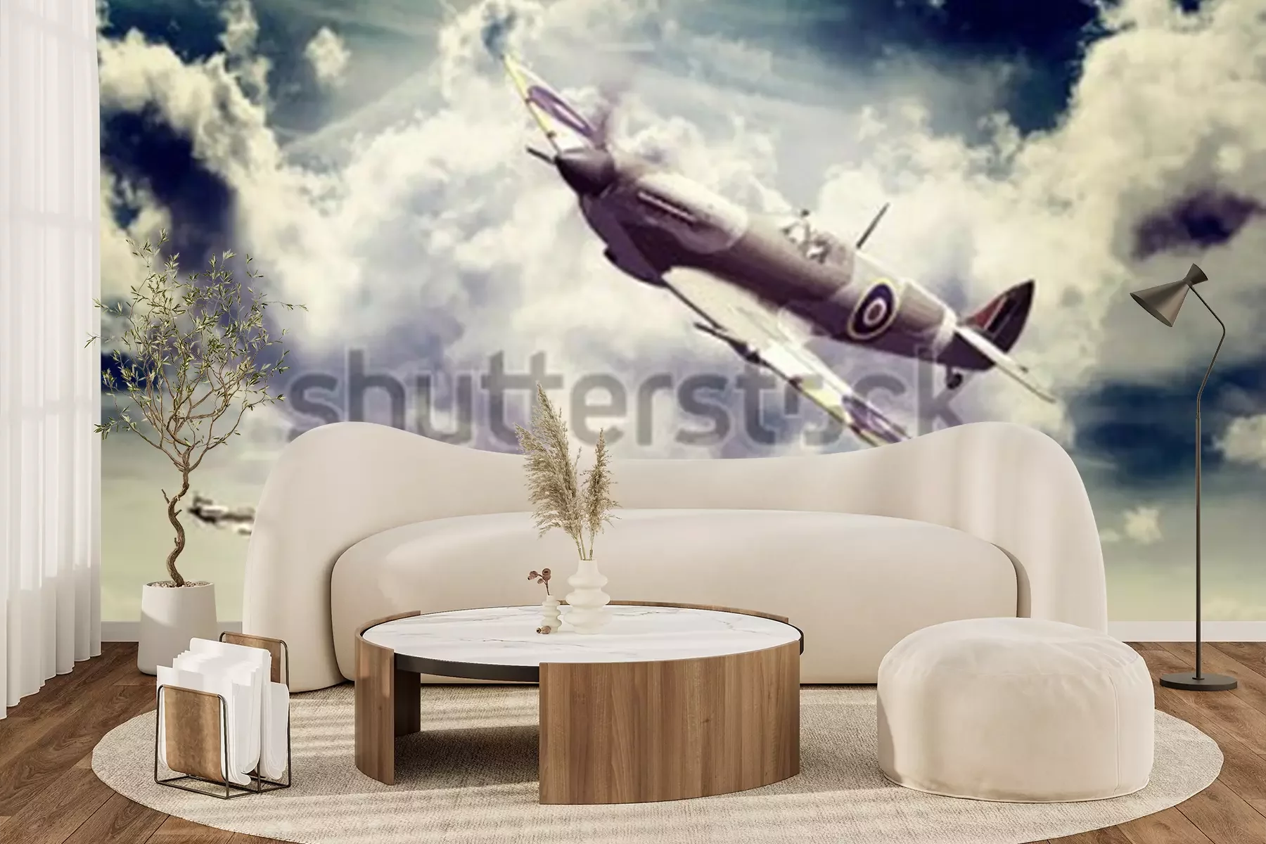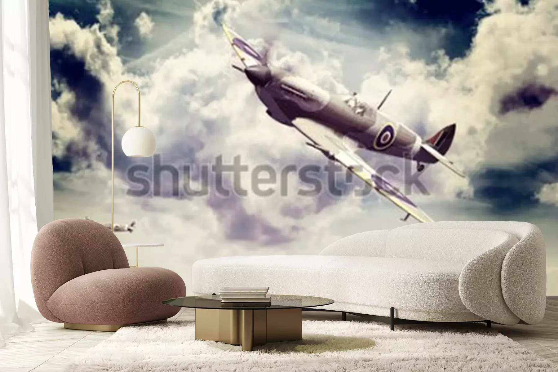 Papier peint  Rendu d'un modèle 3D ww2 Supermarine Spitfire en vol, ancien effet de nostalgie instagram