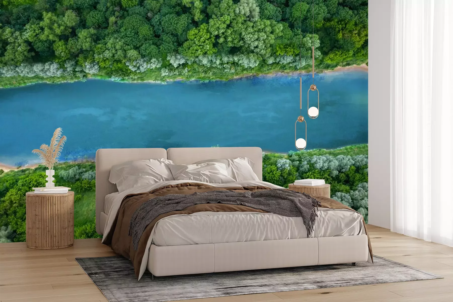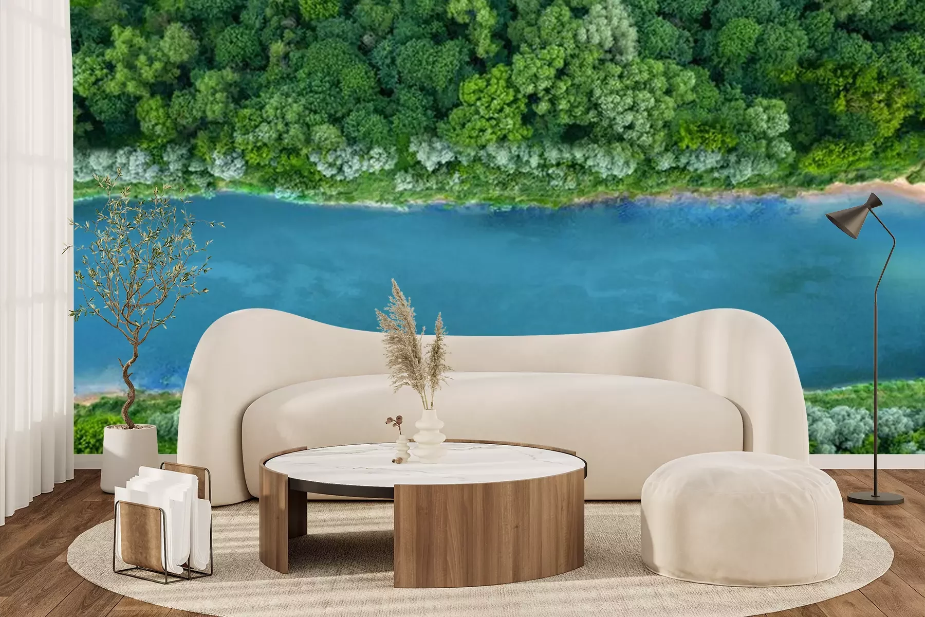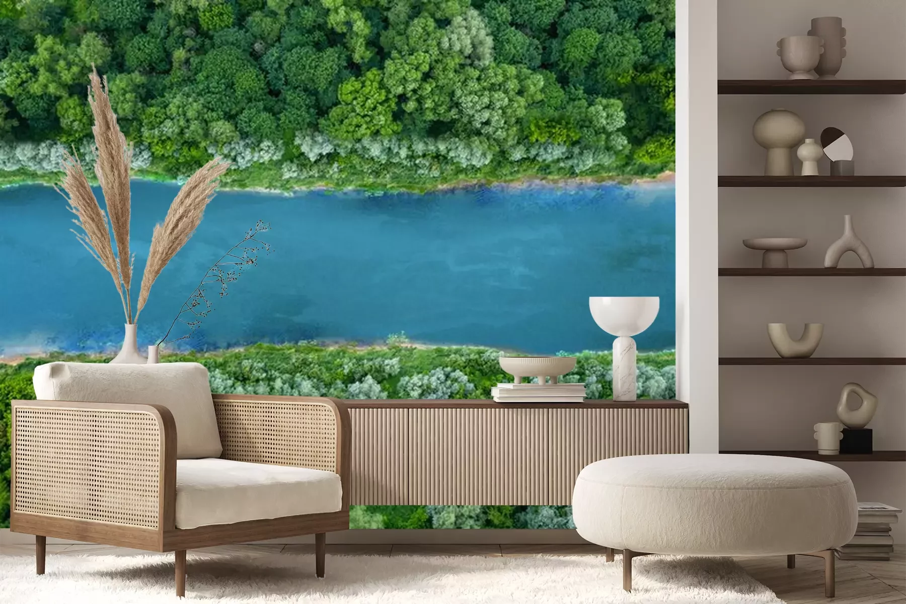 Papier peint  Rivière au milieu d'une forêt verdoyante vue du ciel