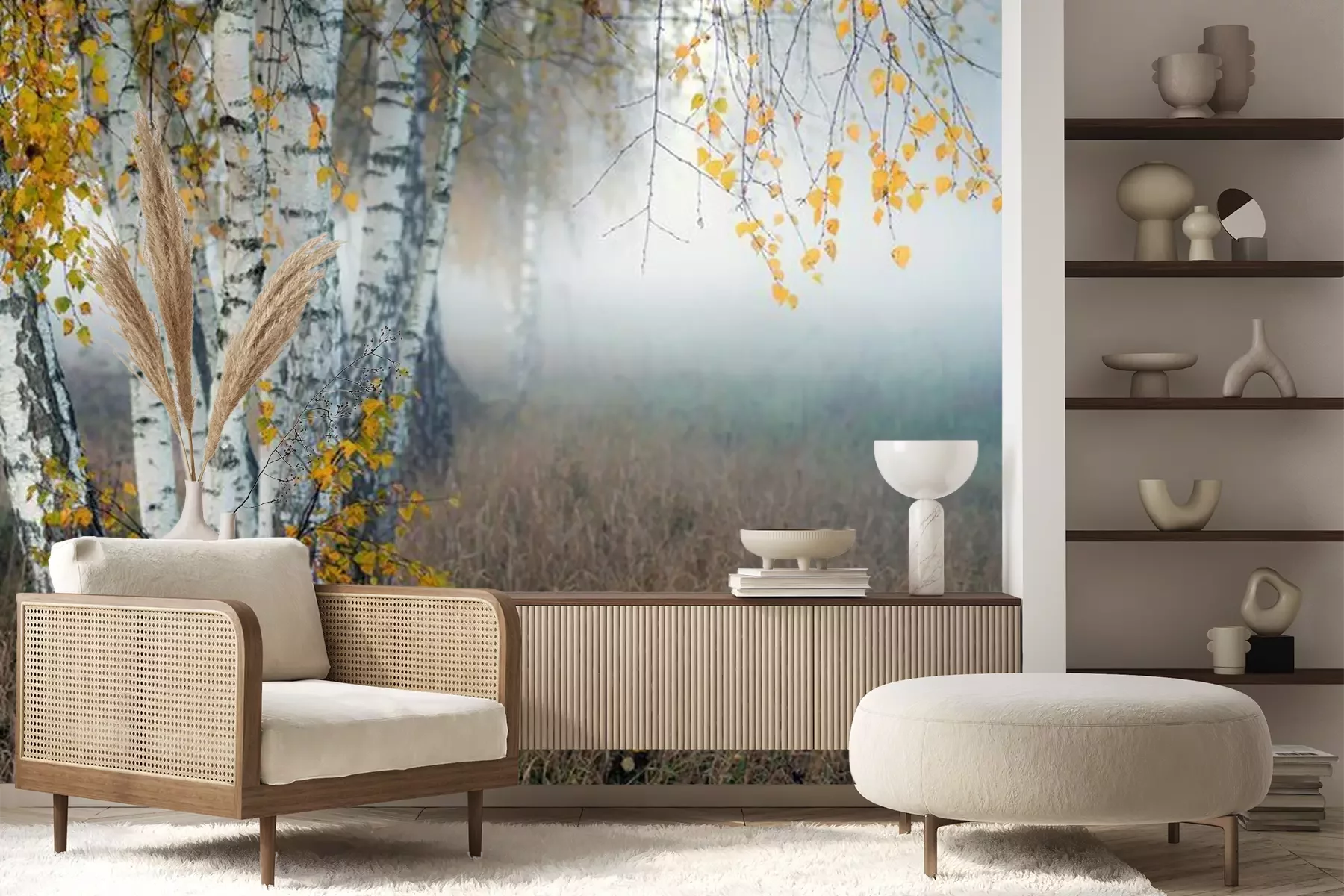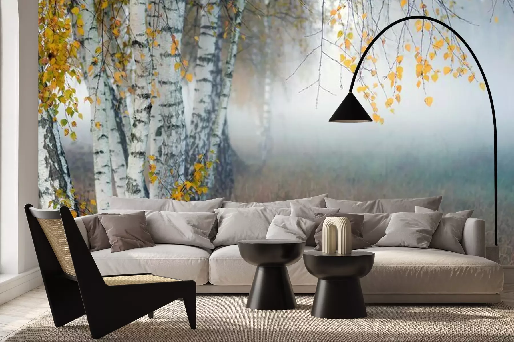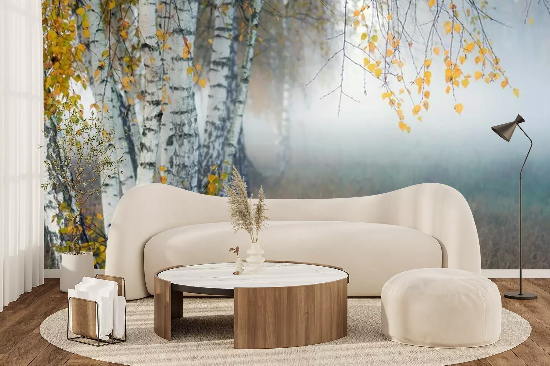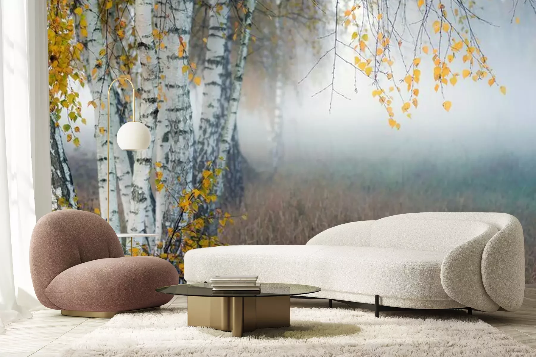 Papier peint  Row of birch trees with yellow leaves in the fog. Selective focus..