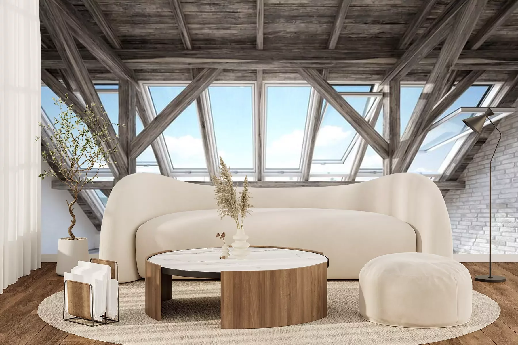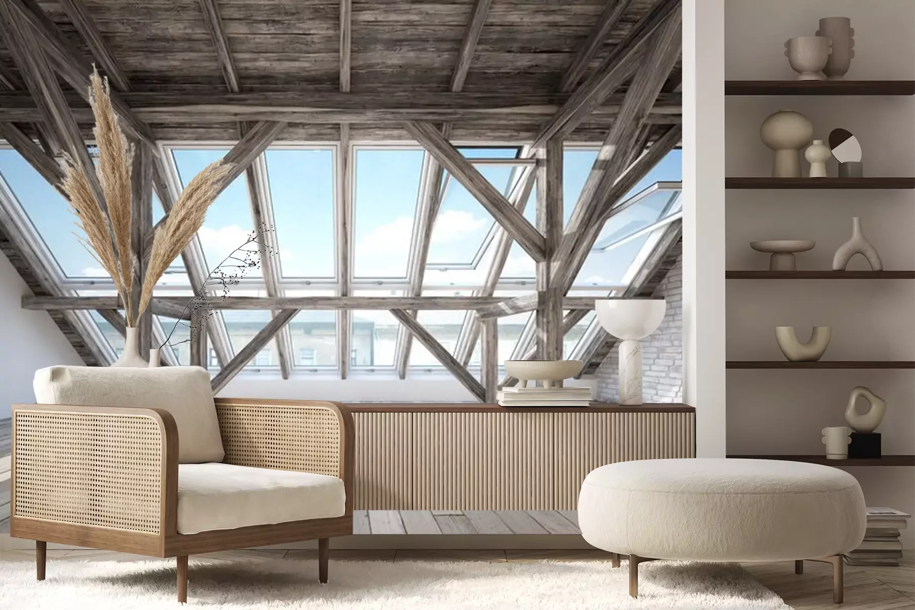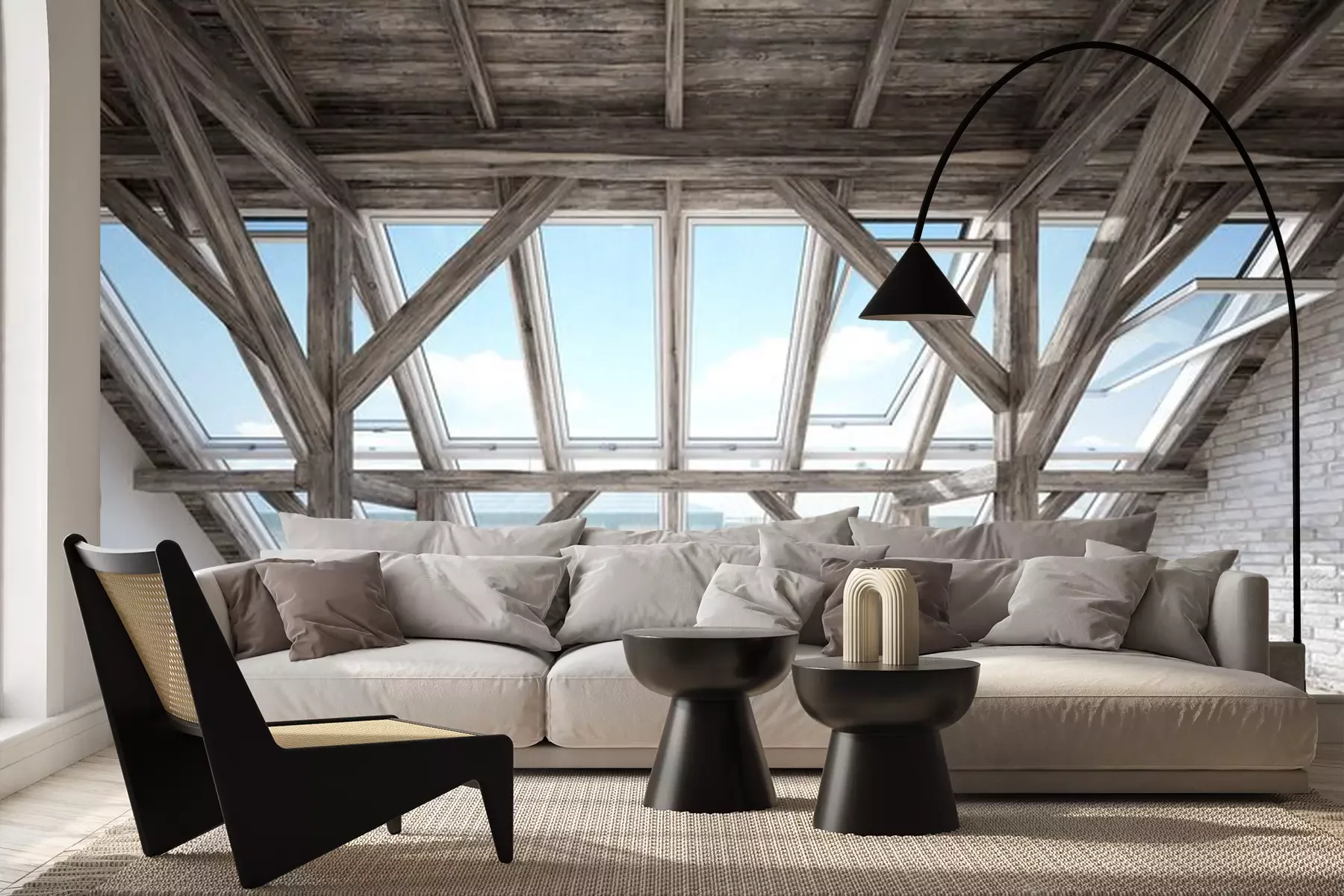 Papier peint  Scandinavian attic interior with wooden beam roof construction and wooden floor