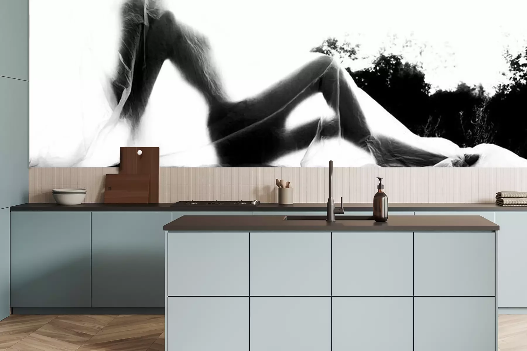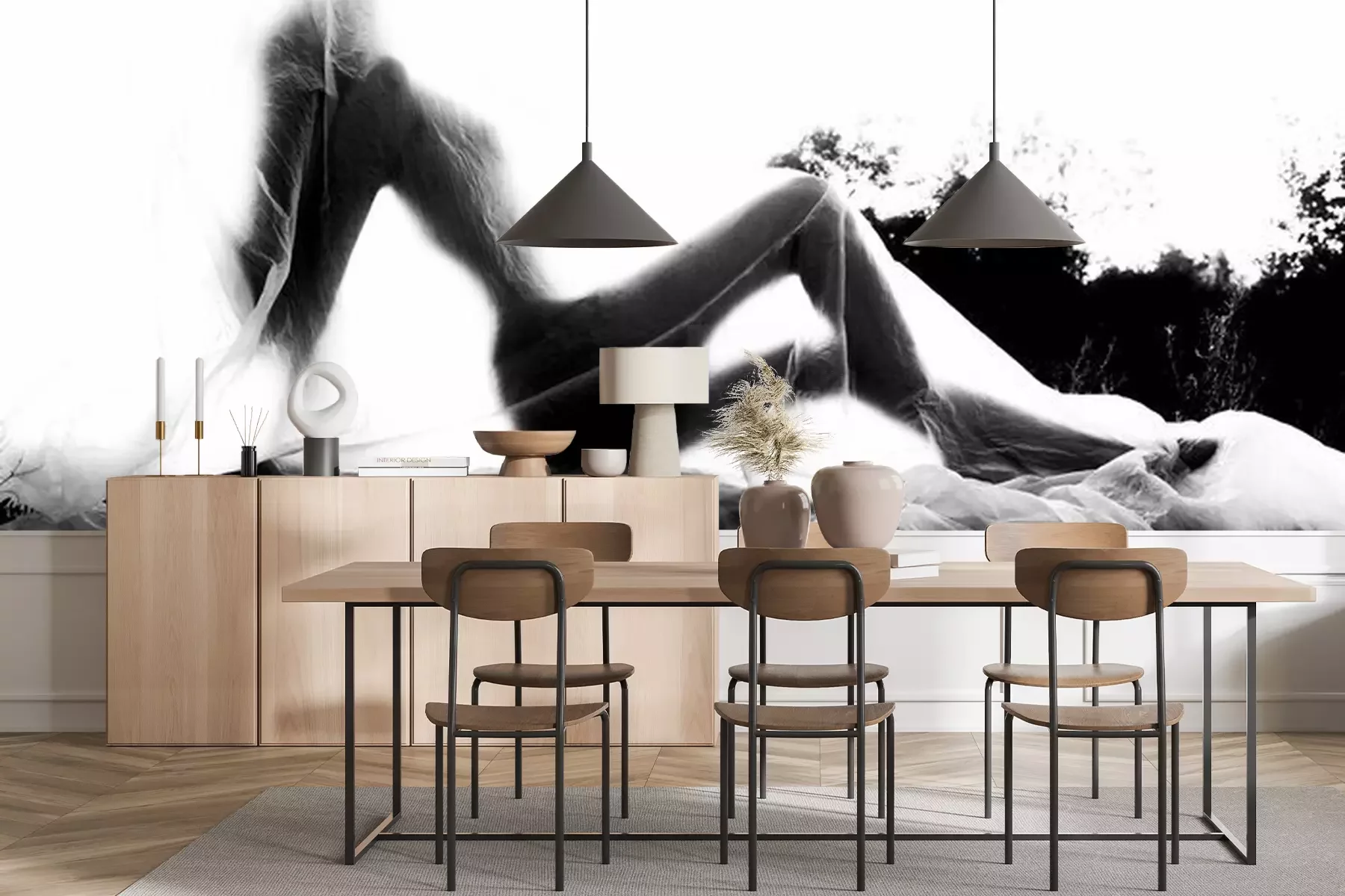 Papier peint  Slender nude girl, covered by a cellophane film, through which only her silhouette is visible and her nakedness is covered, in the ruins of a destroyed building. Conceptual, artistic, creative design.