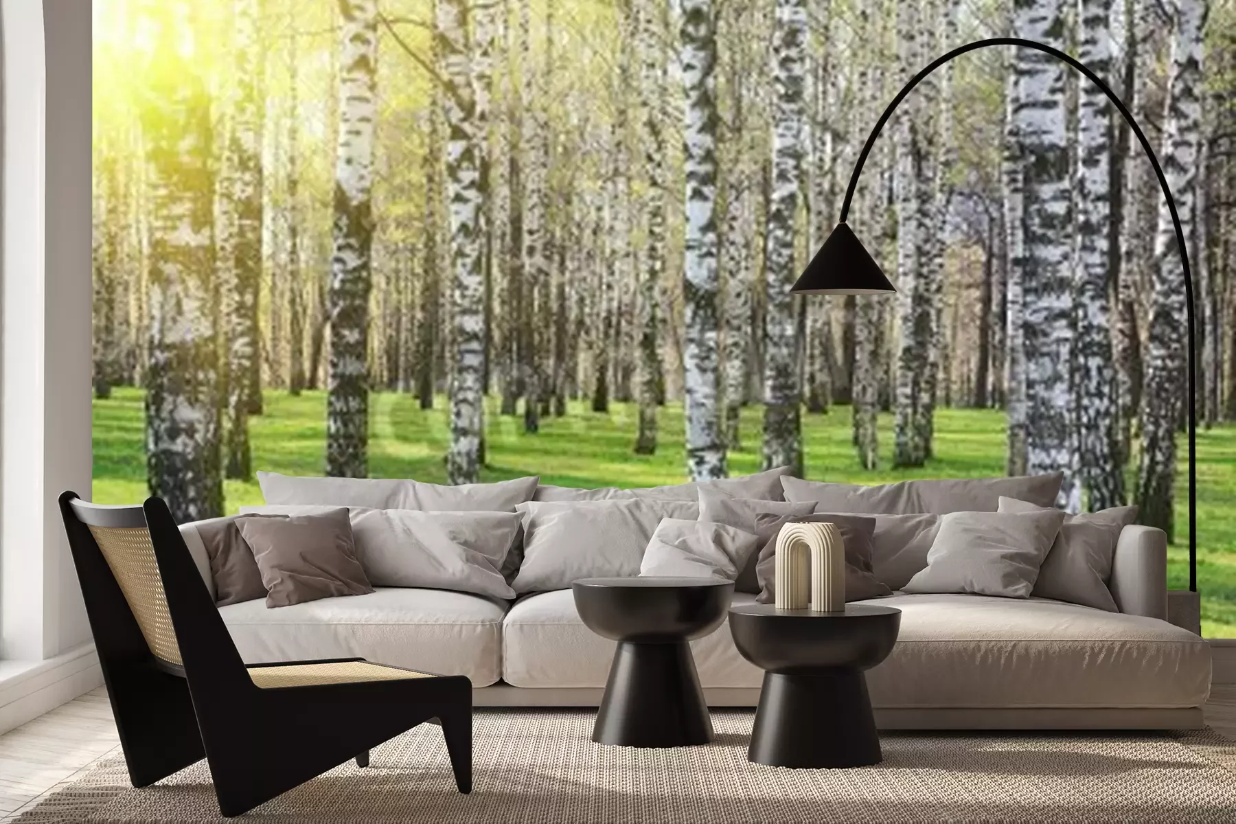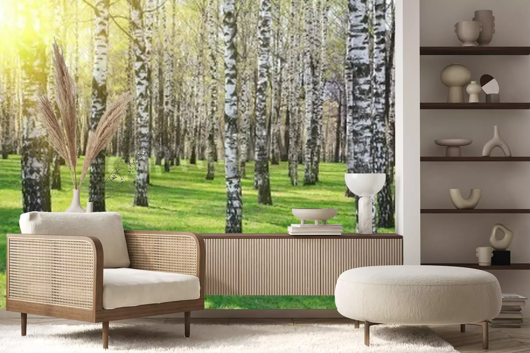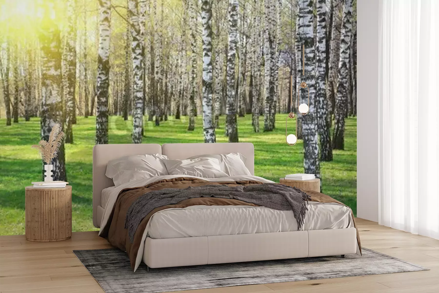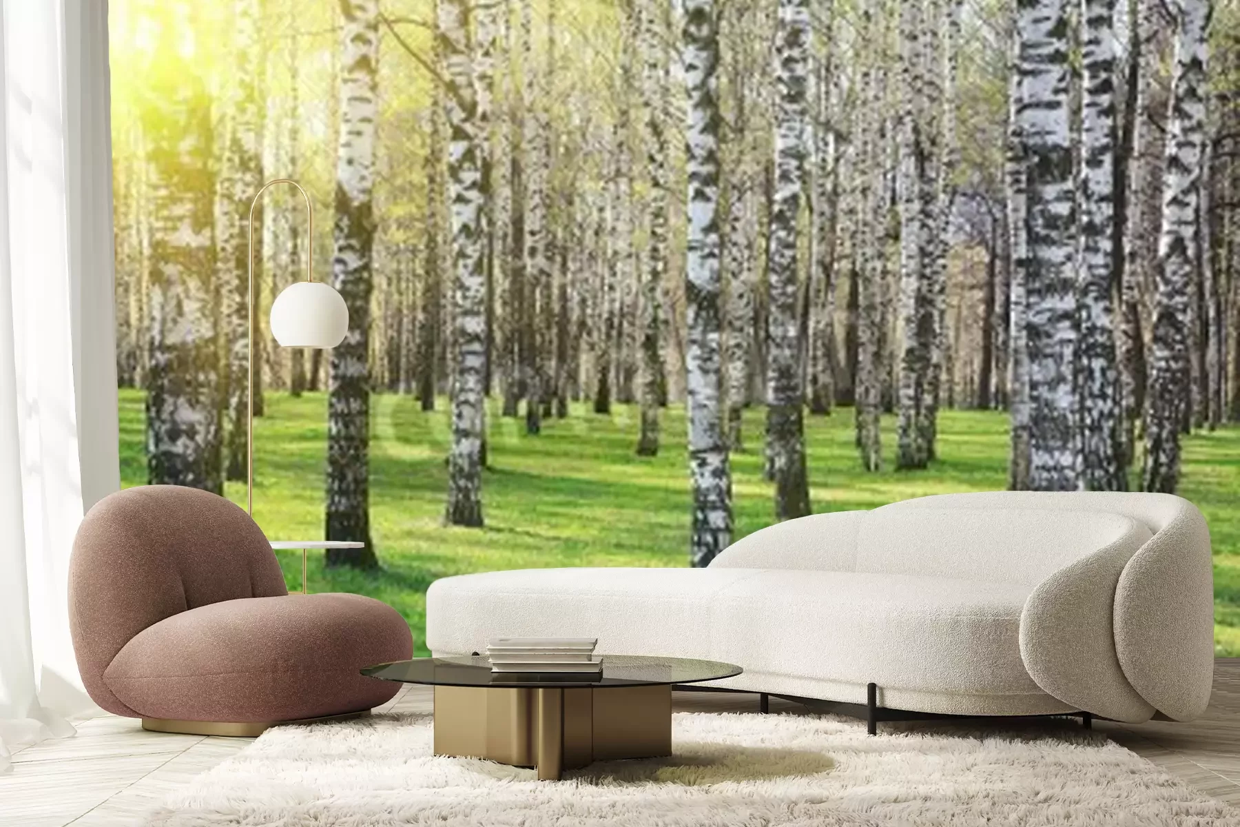 Papier peint  Soleil brillant dans une forêt de bouleaux