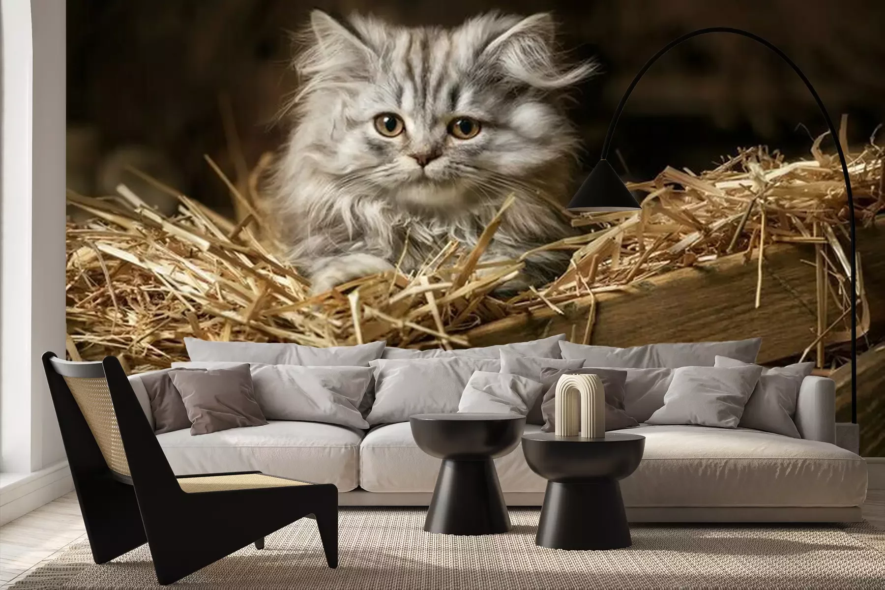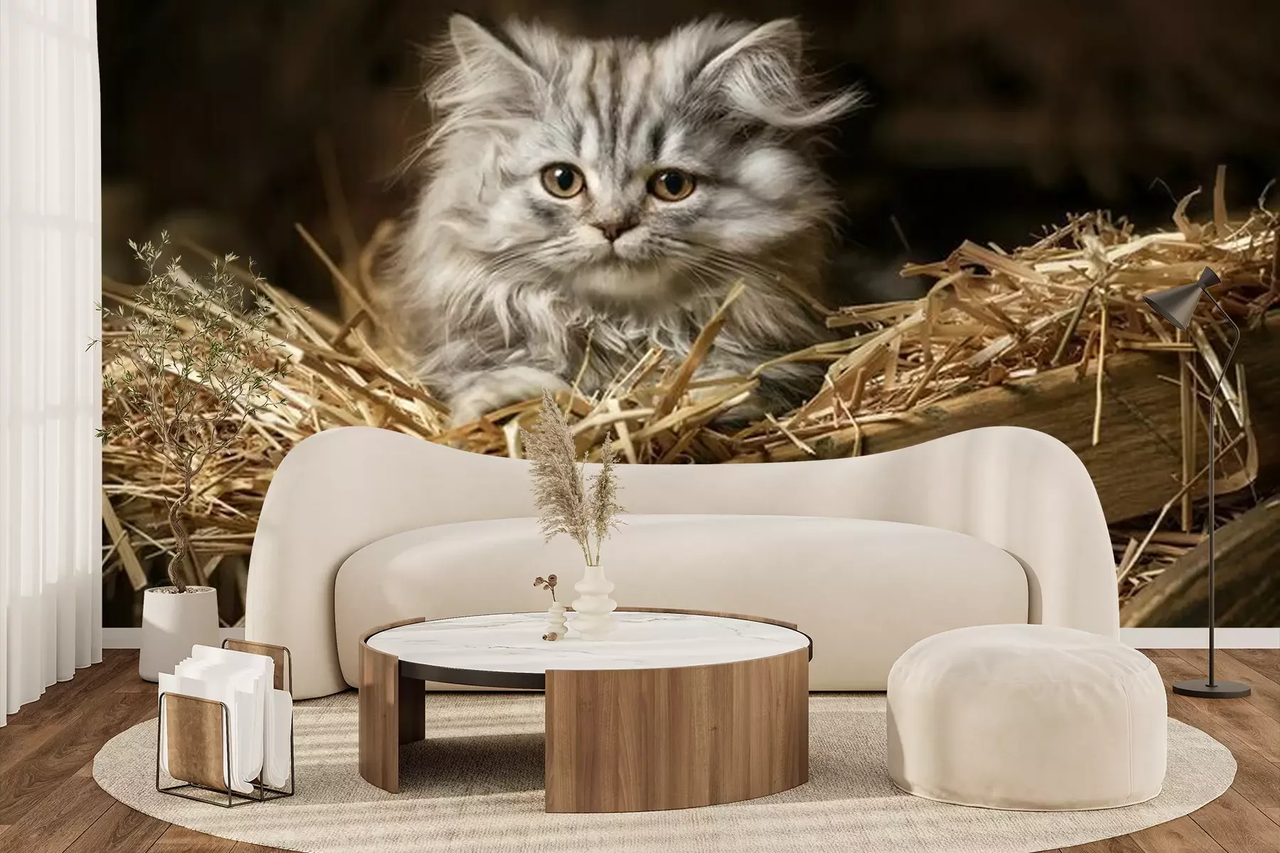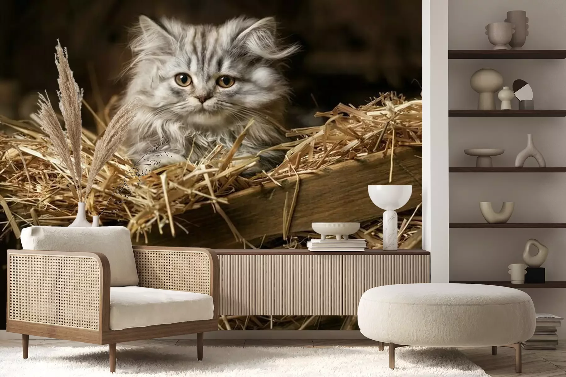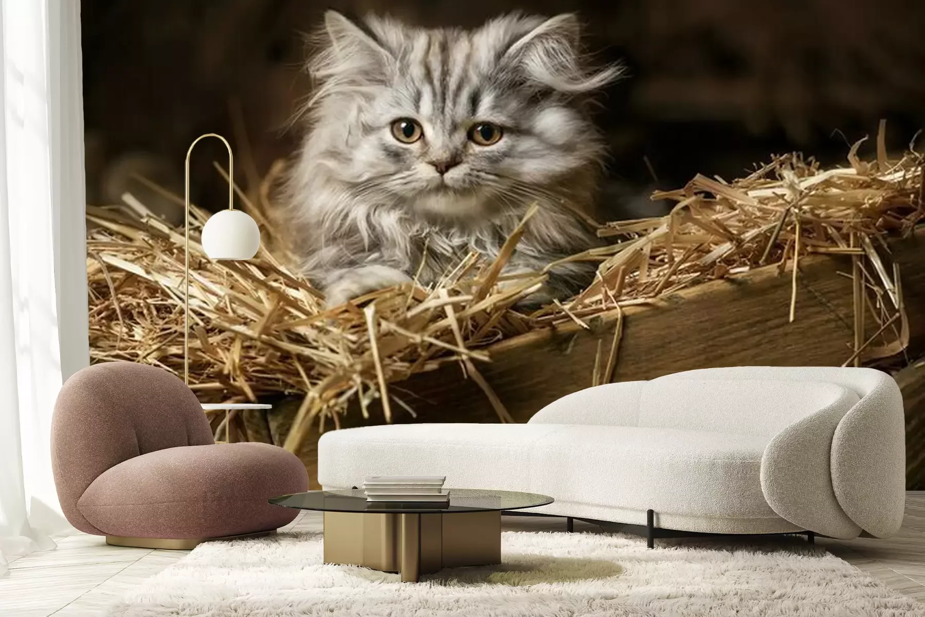 Papier peint  Striped fluffy kitten in an old wagon with straw