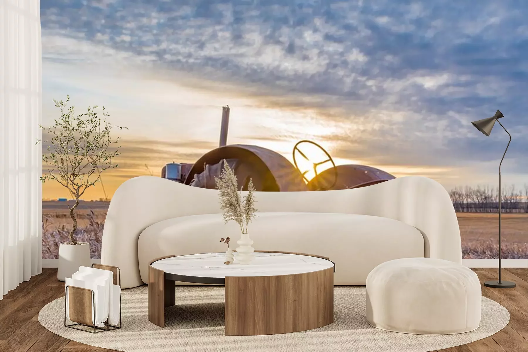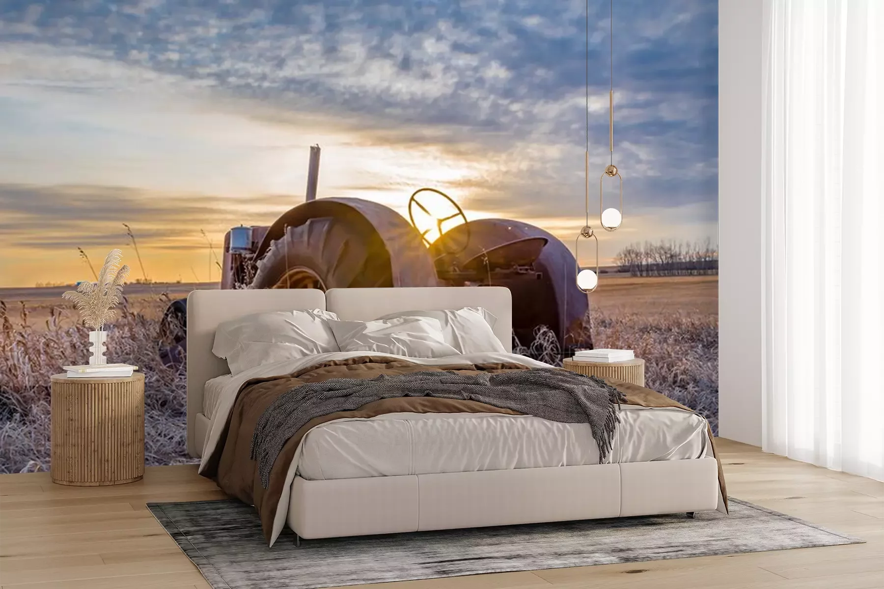 Papier peint  Sunburst at sunset over a vintage tractor abandoned in tall grass on the prairies in Saskatchewan