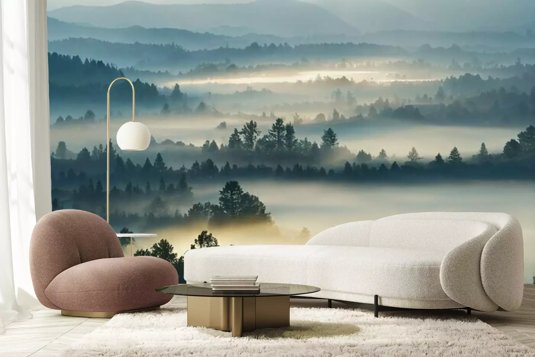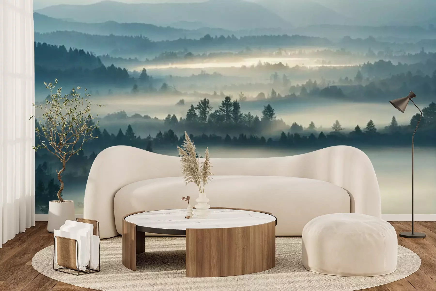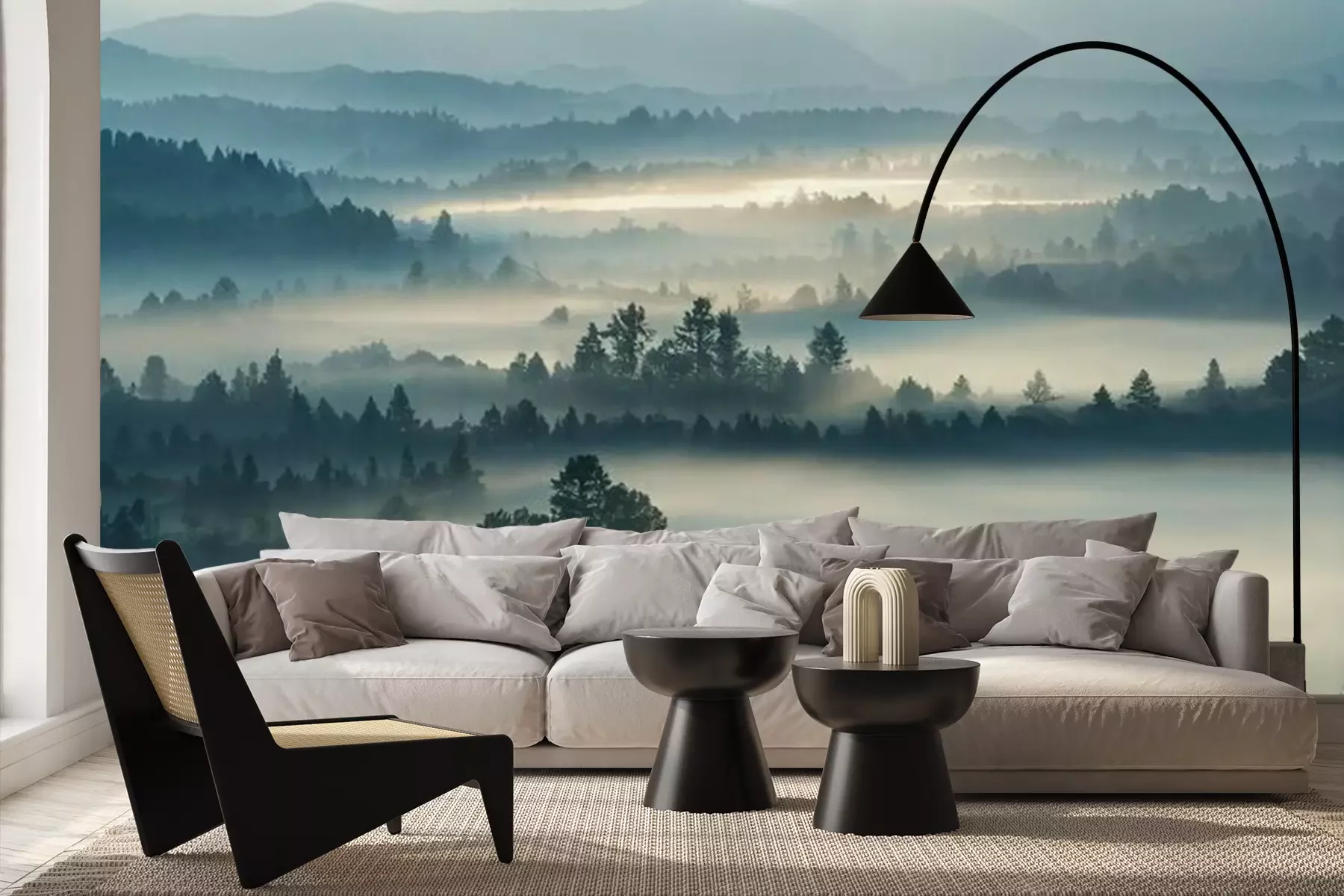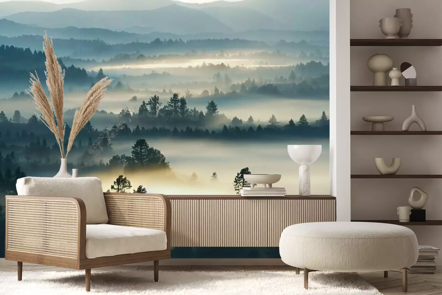 Paysage montagneux avec forêt au lever du soleilPapier peint