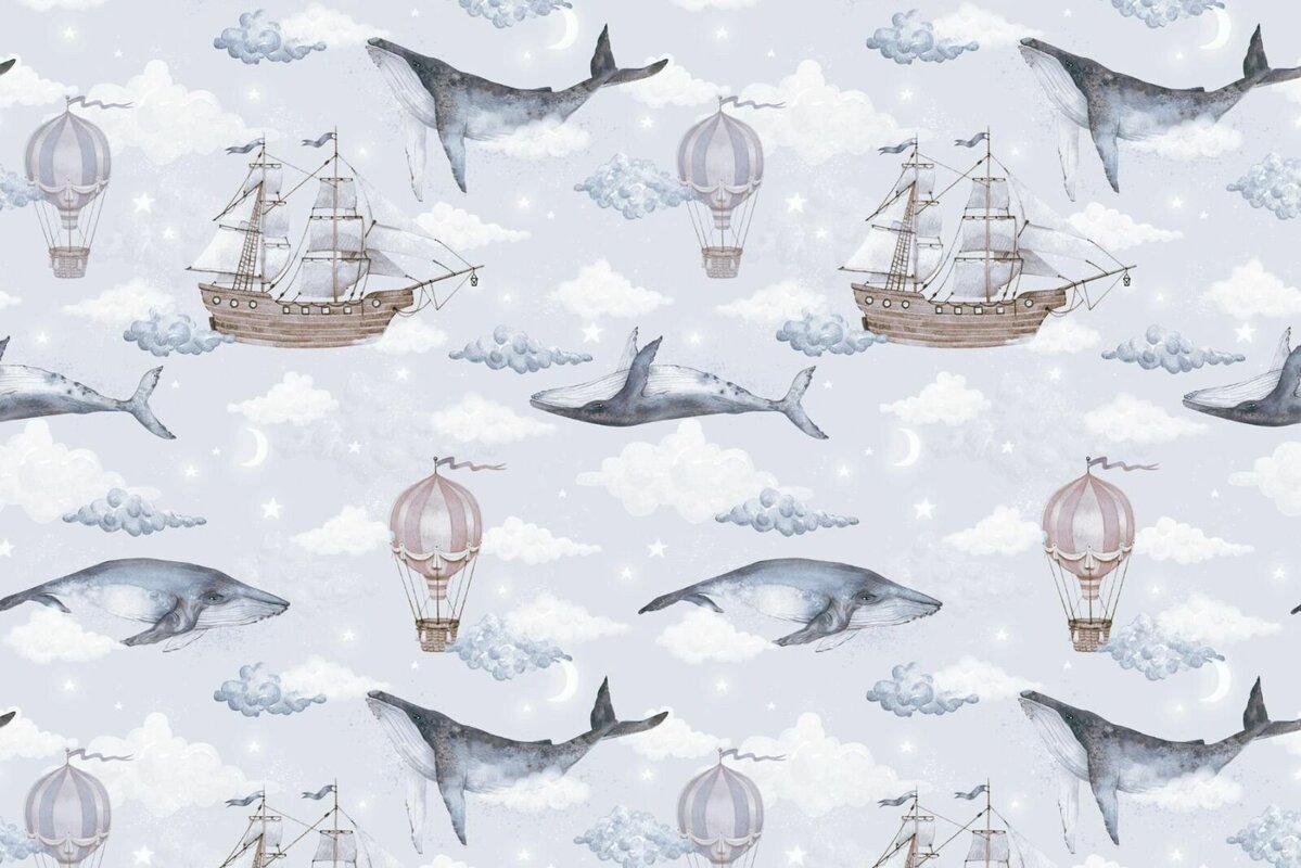 Papier peint : Thème aquarelle avec baleines bateaux et ballons sur fond de ciel