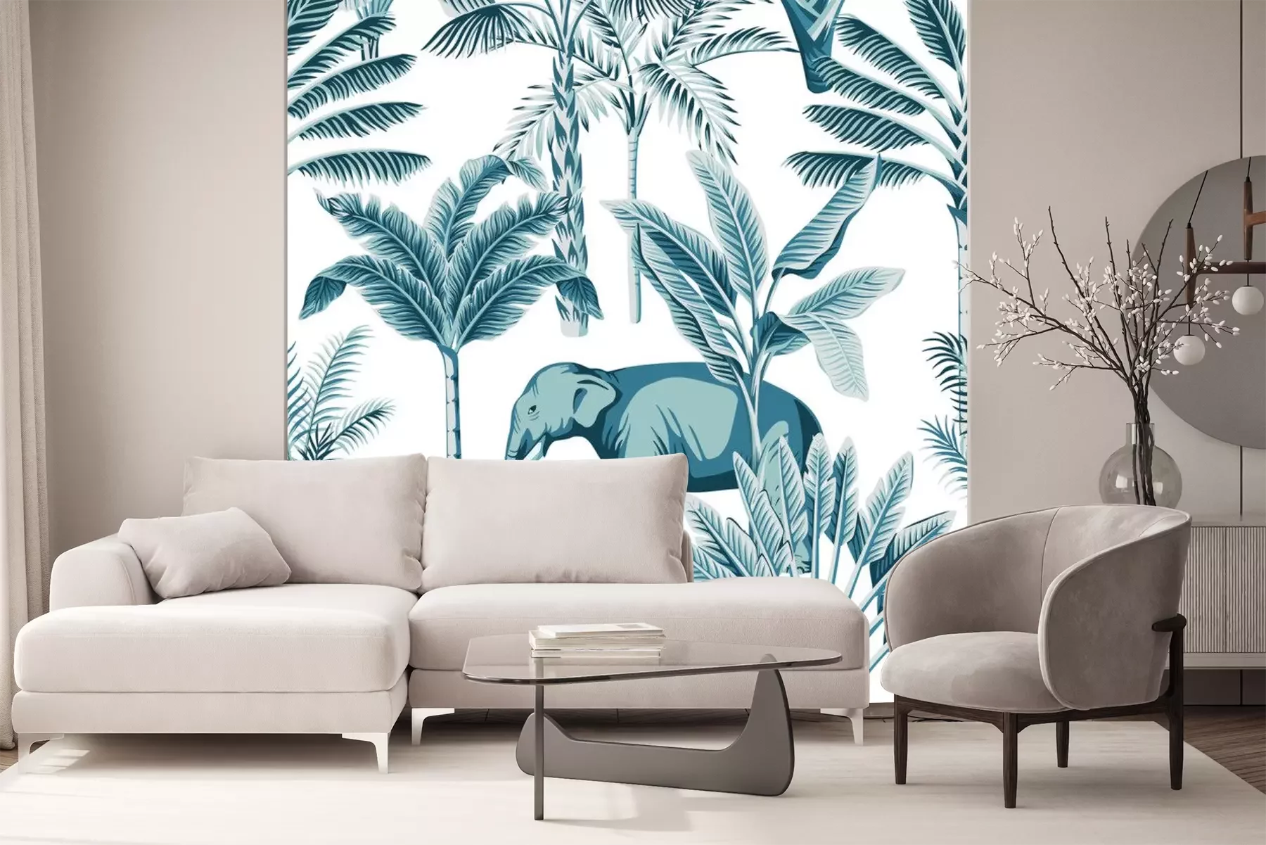 Papier peint  Thème bleu avec palmiers et éléphants