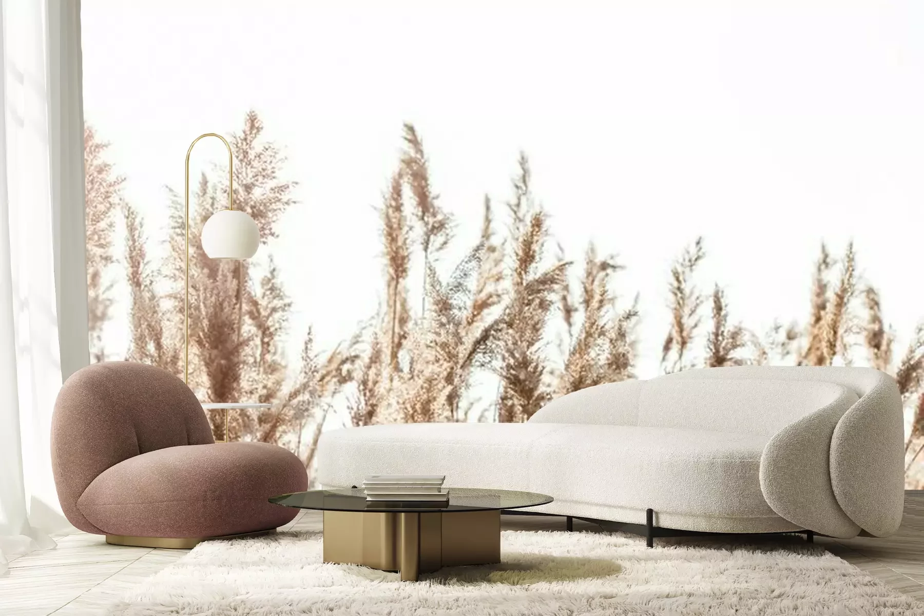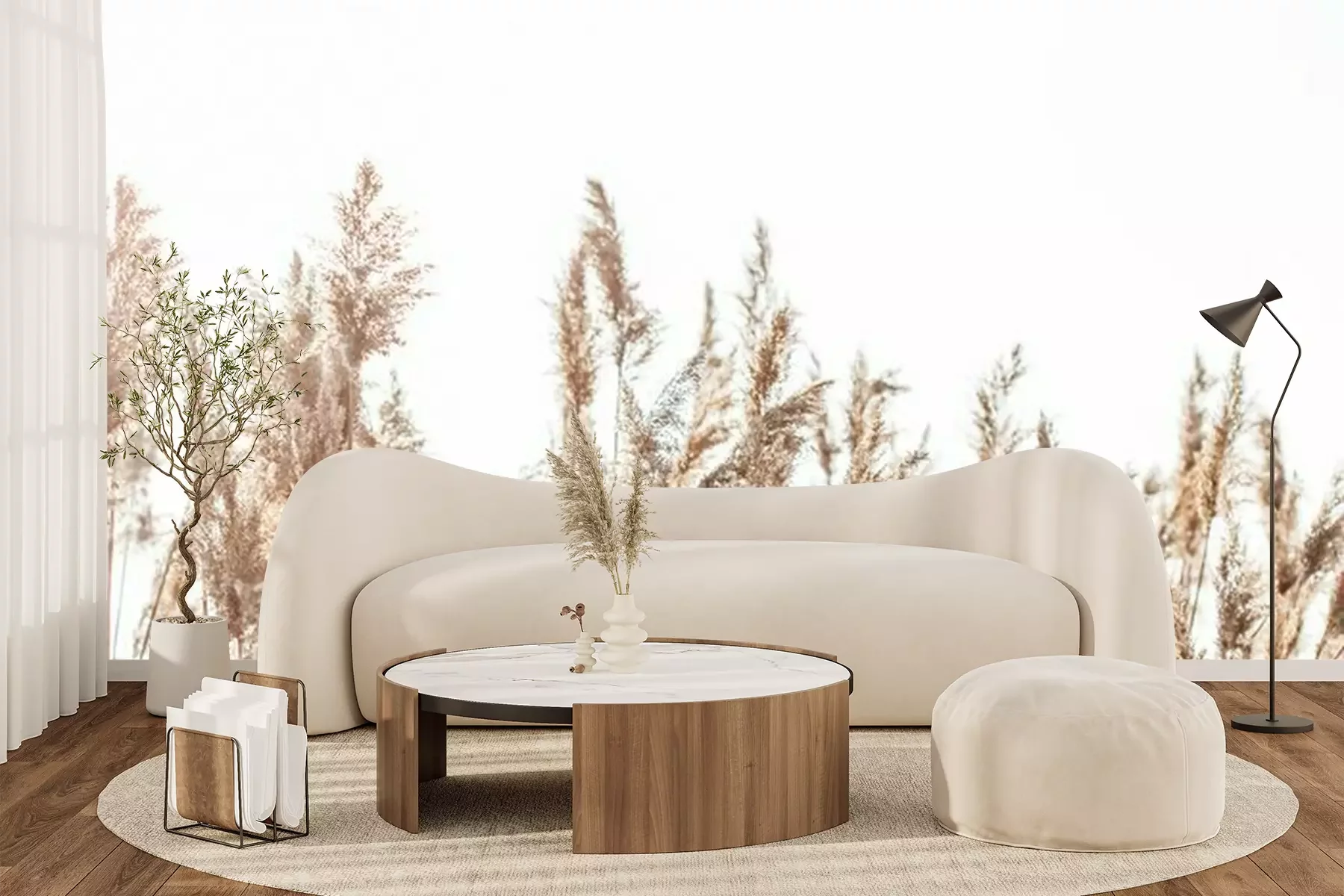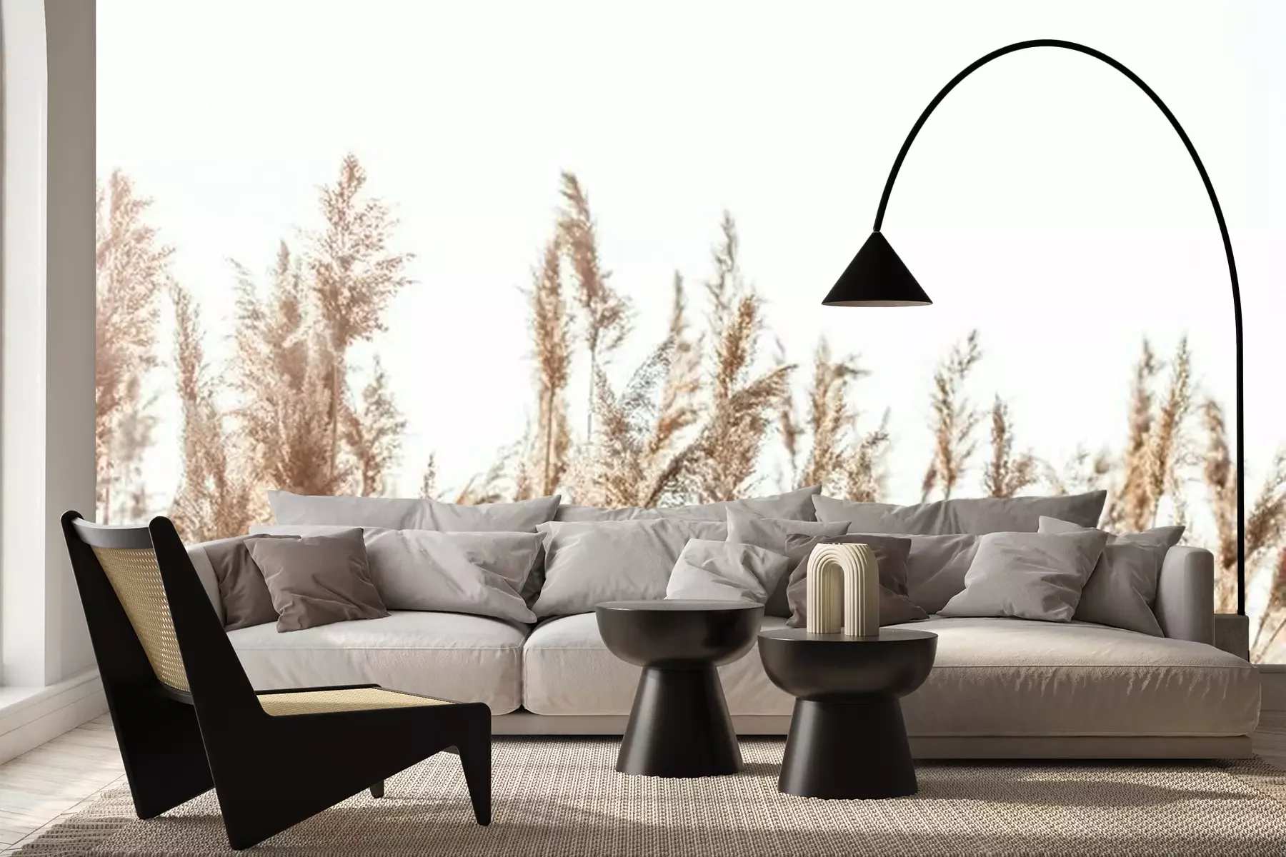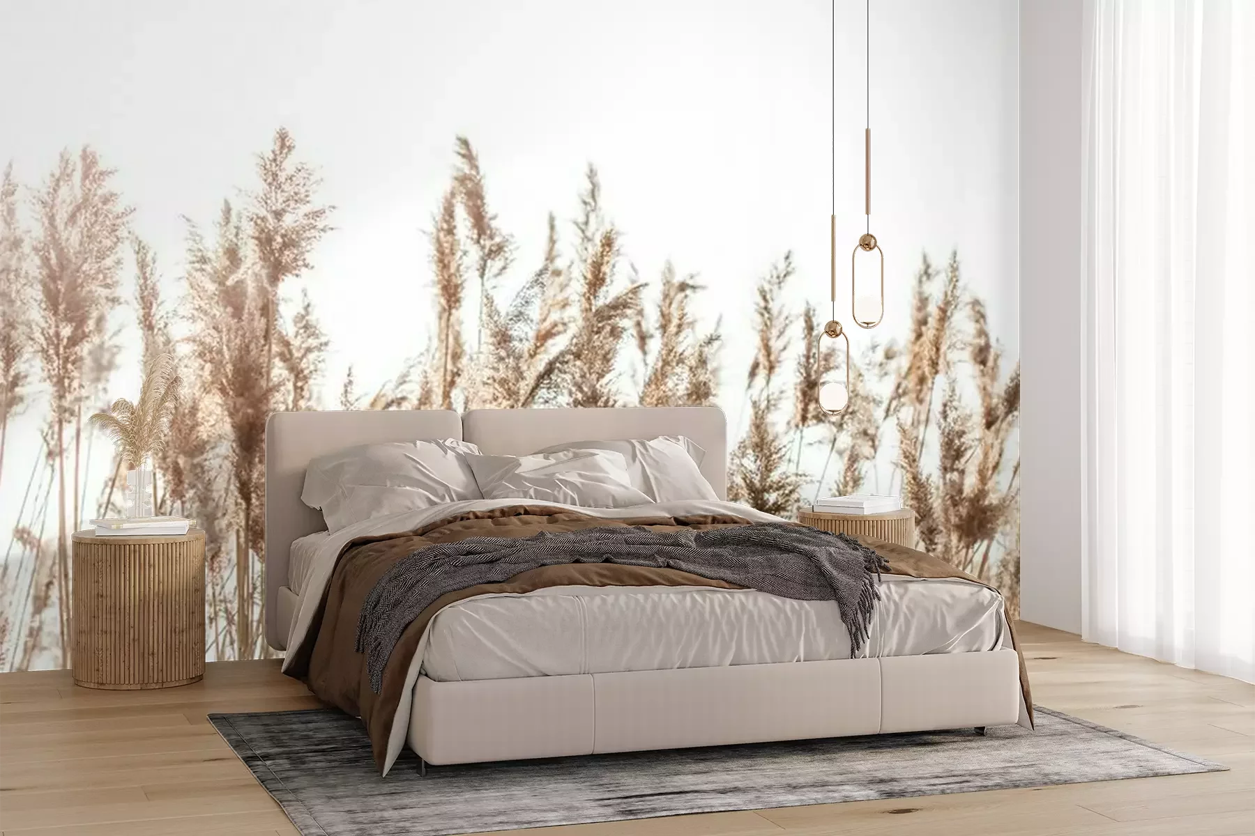 Des tiges d'herbes hautesSi vous rêvez de pouvoir profiter chez vous d’un vrai havre de paix, invitez la nature dans votre décoration intérieure. Ce papier peint roseaux vous permettra d’obtenir un tel résultat. Ces plantes qui poussent près de l'eau apporteront une ambiance chaleureuse et paisible à votre intérieur en lui donnant un visage agréable à contempler. Le caractère exceptionnel de ce papier peint plantes mérite une attention particulière. Avec un fond composé d’un ciel clair, ce modèle vous permettra de métamorphoser votre intérieur sans pour autant submerger la décoration grâce au côté délicat du motif photographié. Ces tiges beiges avec des extrémités plumeuses s'adapteront à de nombreux styles différents, ce qui vous permettra d'assortir facilement cette décoration murale à votre intérieur. Ce modèle conviendra certainement au style boho. Ce papier peint roseaux pourra parfaire une décoration d’intérieur composée de meubles en osier ou en rotin ainsi que de textiles ethniques aux couleurs naturelles. Vous obtiendrez d'excellents résultats également lorsque ce motif sera utilisé pour embellir une cuisine rustique. À quel point un tel papier peint plantes peut changer la donne ? Ce modèle pourra créer un fond idéal pour la préparation des repas, ou pour les partager en famille. Ce motif peut recouvrir entièrement l’un de vos murs, par exemple celui situé près de la table à manger, ou simplement l'espace entre le plan de travail et vos placards muraux. Cette proposition pourra également s’inviter dans un salon au design moderne inspiré par le style éco. Dans une telle ambiance, notre papier peint nature fera des merveilles. Les accents inspirés du monde de la nature représentent une tendance forte dans l’univers de la décoration d’intérieur. Encore une raison de plus confirmant le choix d’une telle solution décorative pour votre intérieur. Ce modèle pourra accompagner des meubles légers en bois et un ensemble de canapés aux formes arrondies. Une telle décoration favorisera la détente et le repos. Lors du choix d’une décoration murale, il est important de prendre en compte la polyvalence et l’intemporalité du motif. C'est précisément ce qui caractérise notre papier peint nature. Ce paysage subtil demeurera tout aussi magnifique au fil des ans et ce quelle que soit l’évolution de la mode. Il ne vous lassera pas, car il vous fera profiter d’une ambiance bucolique invitant la nature sous votre toit. Avec quels autres éléments décoratifs ce papier peint roseaux pourra-t-il être assorti ? Ces plantes évoquent les lacs et la nature sauvage, voilà pourquoi nous vous conseillons de l’accompagner de posters exposant des oiseaux aquatiques sous forme de peintures aquarelles ou de gravures rétro, ainsi que de vases avec des herbes de la pampa séchées.