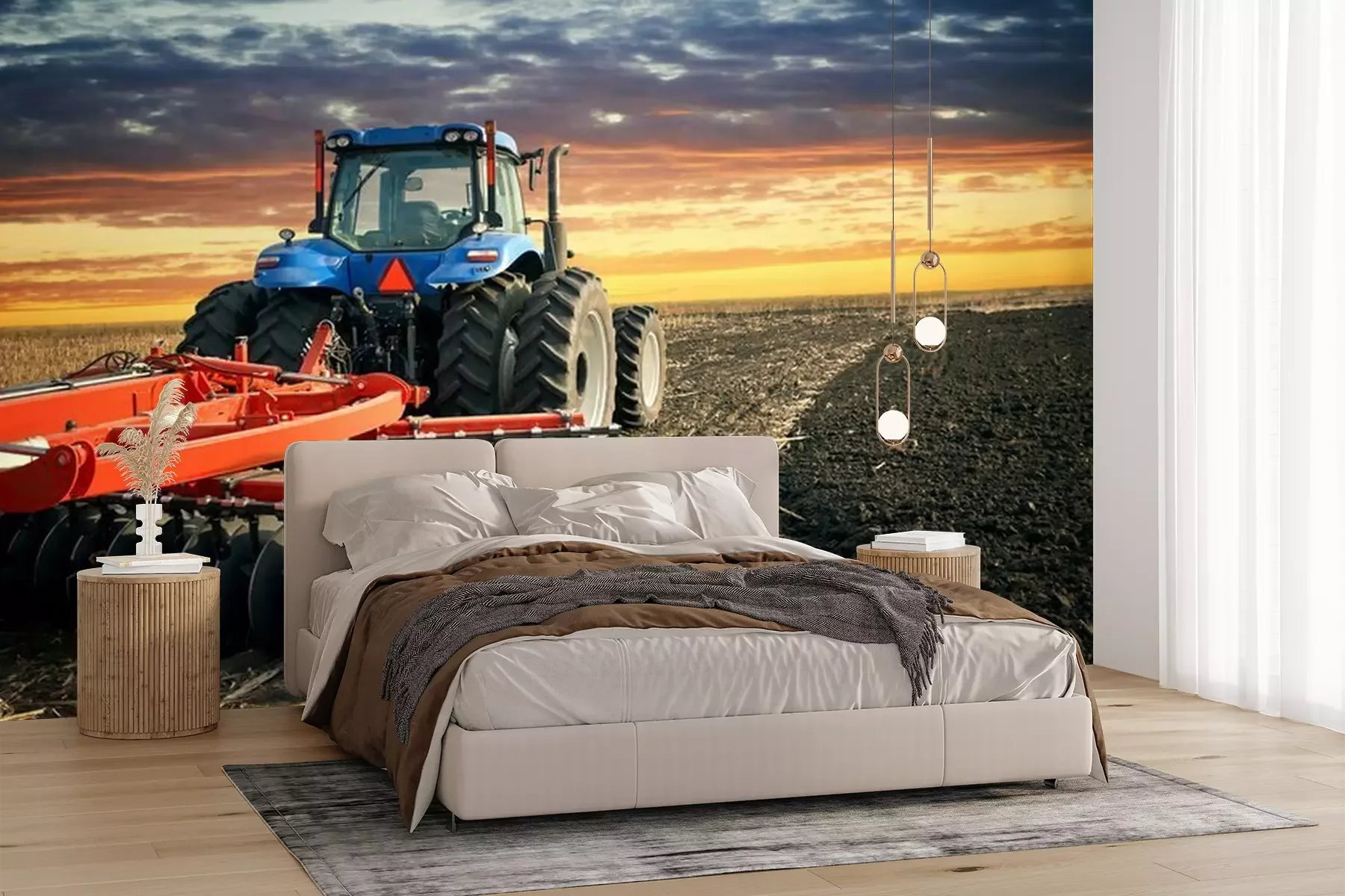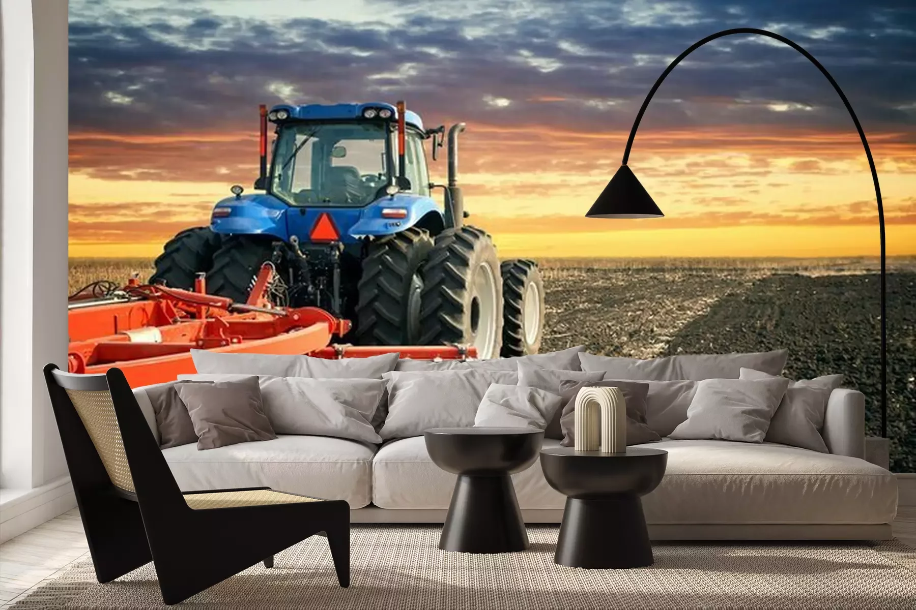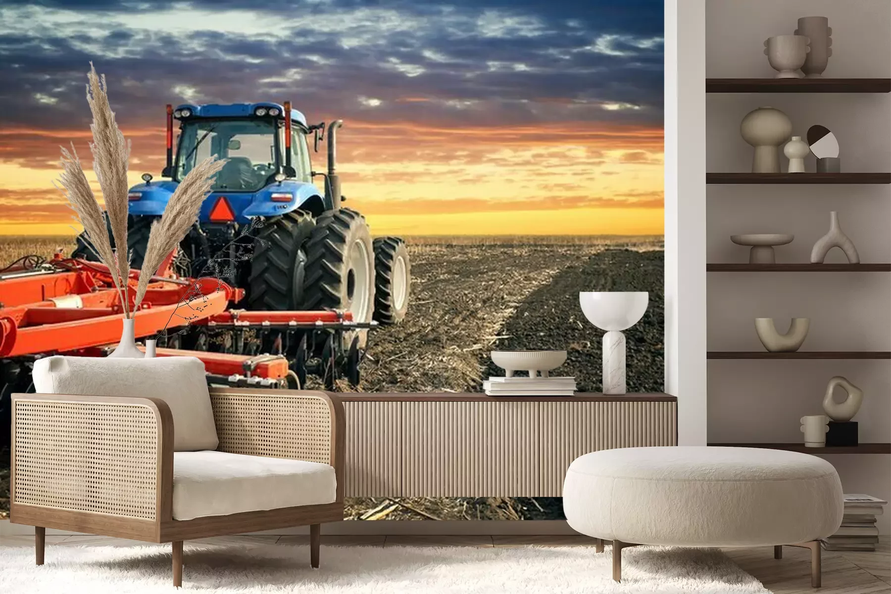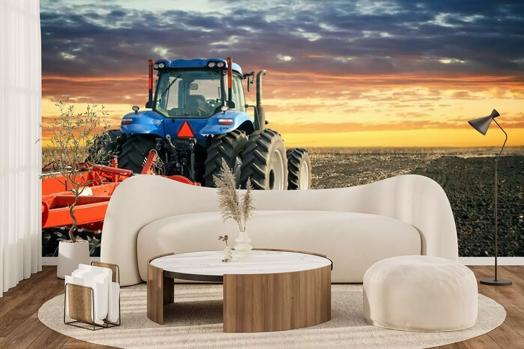 Tracteur bleu avec charruePapier peint