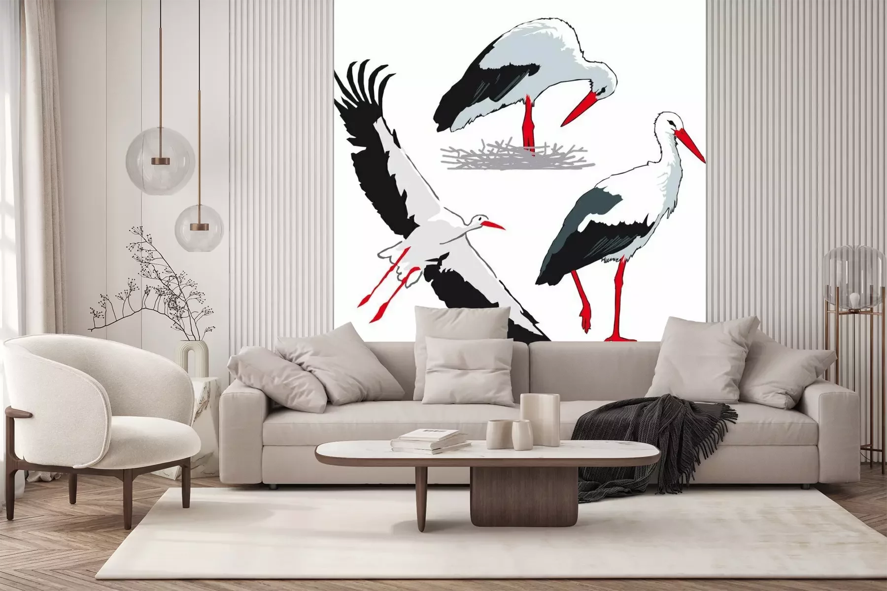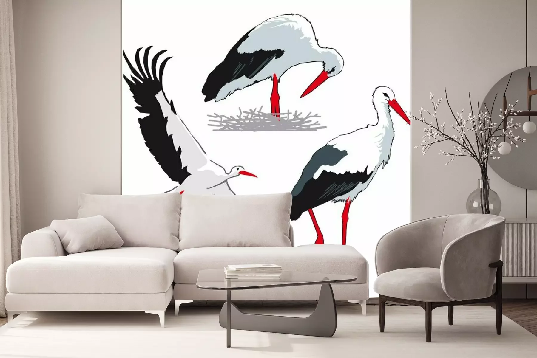 Papier peint  Trois cigognes sur fond blanc