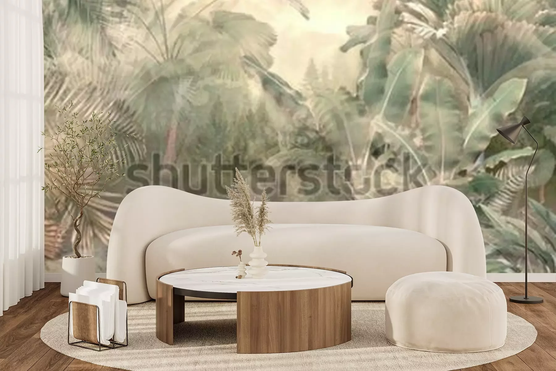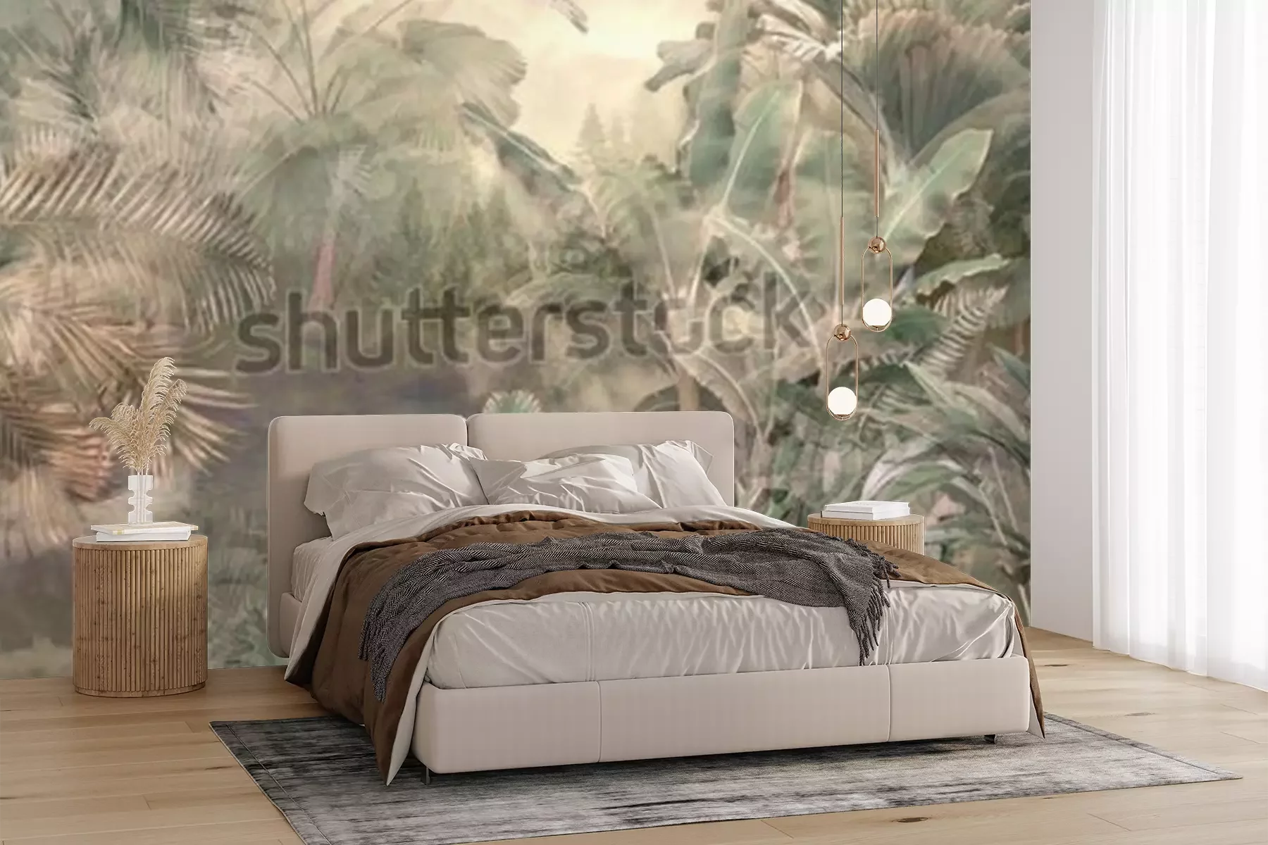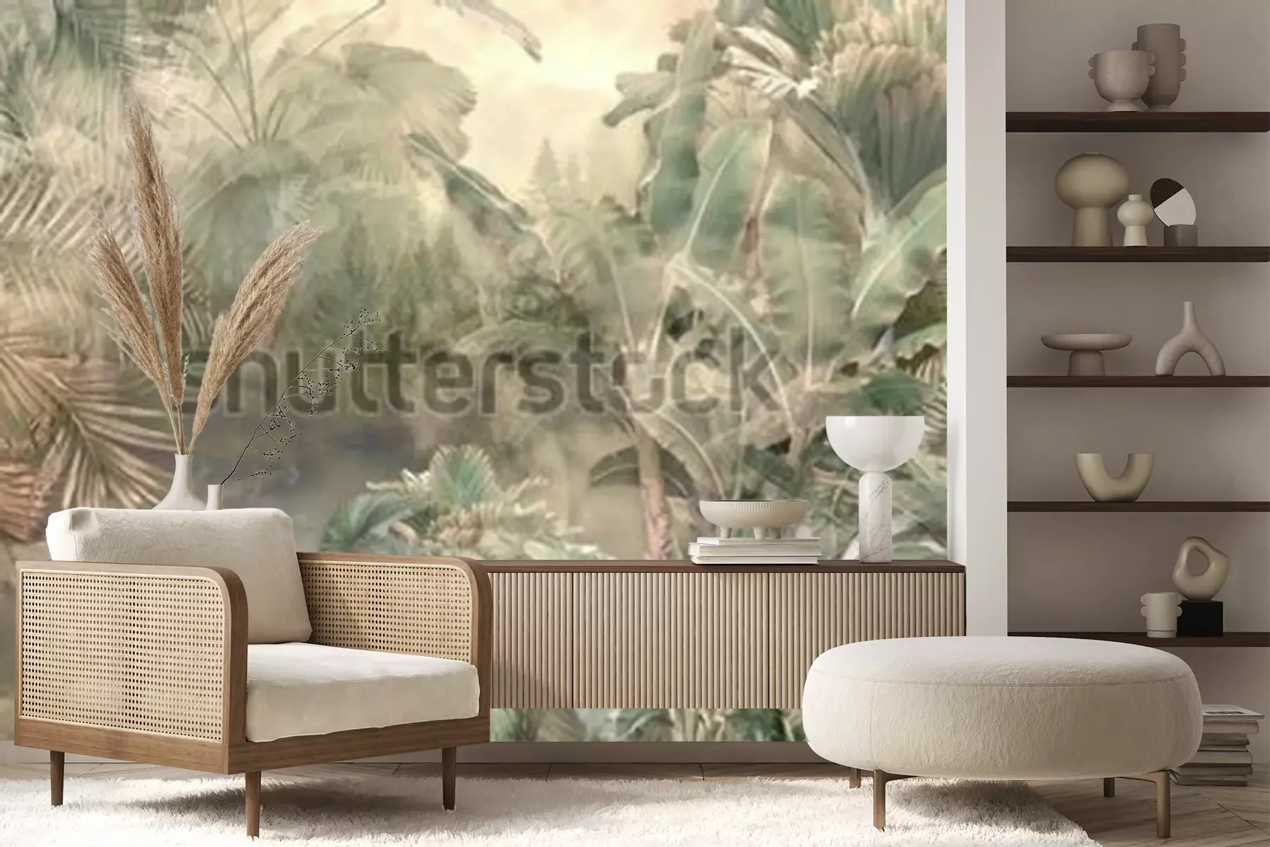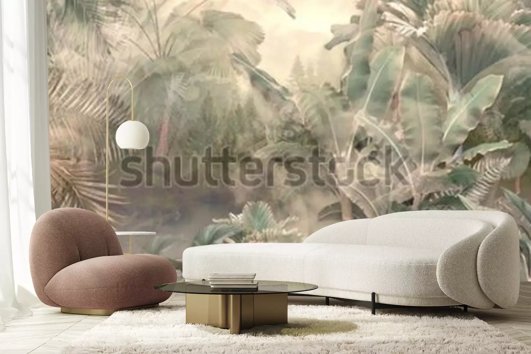 Papier peint  Tropical trees and leaves wallpaper design in foggy forest - 3D illustration