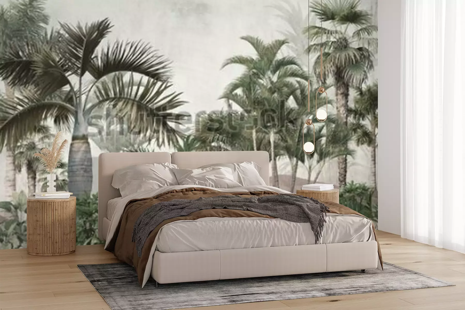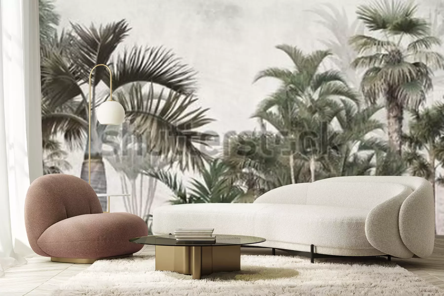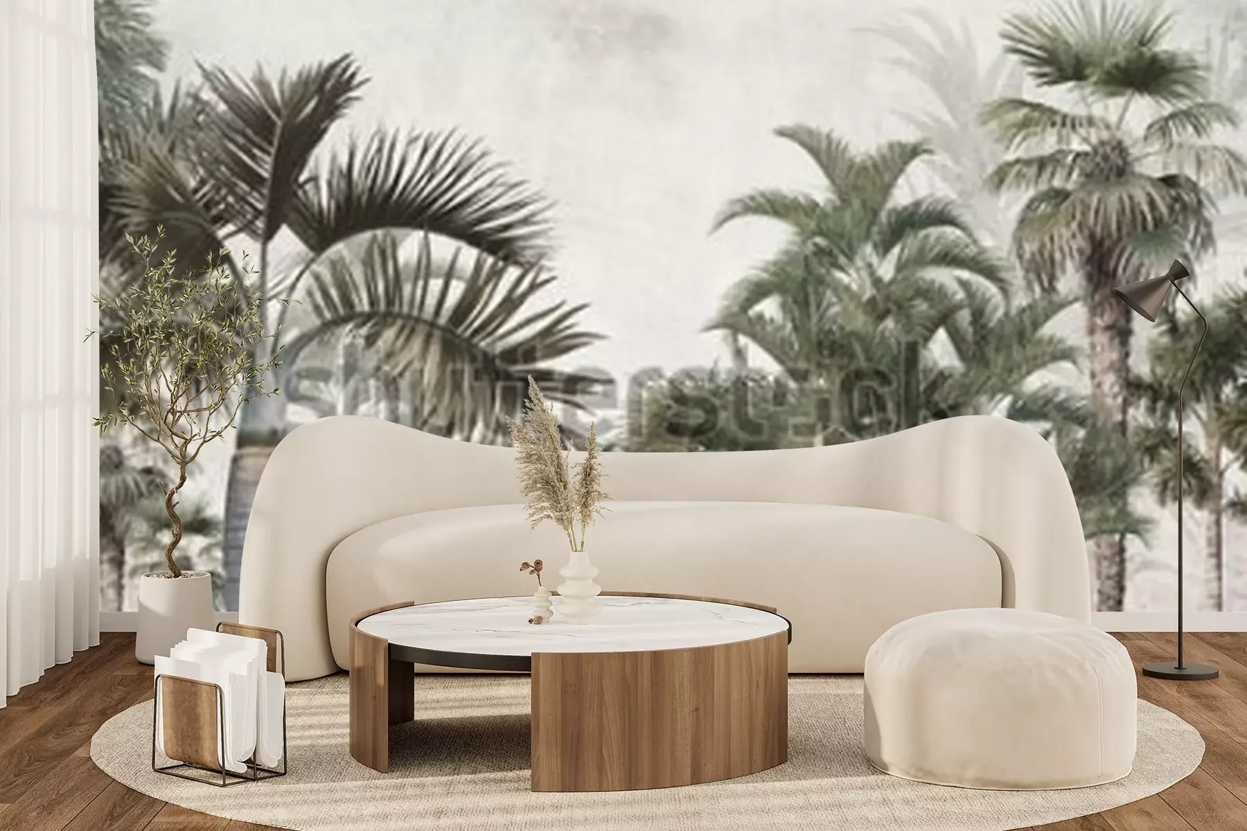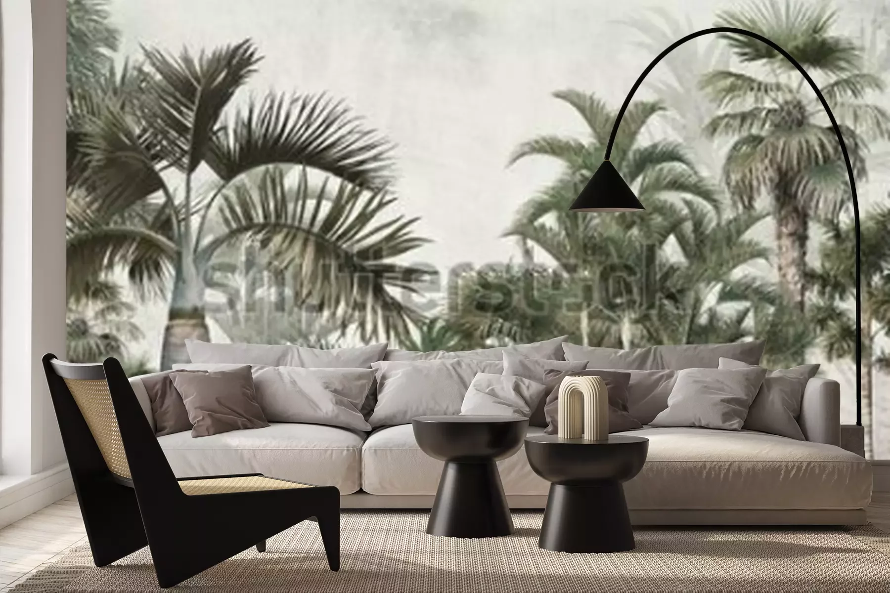 Papier peint  Tropical trees and leaves wallpaper design in foggy forest - 3D illustration