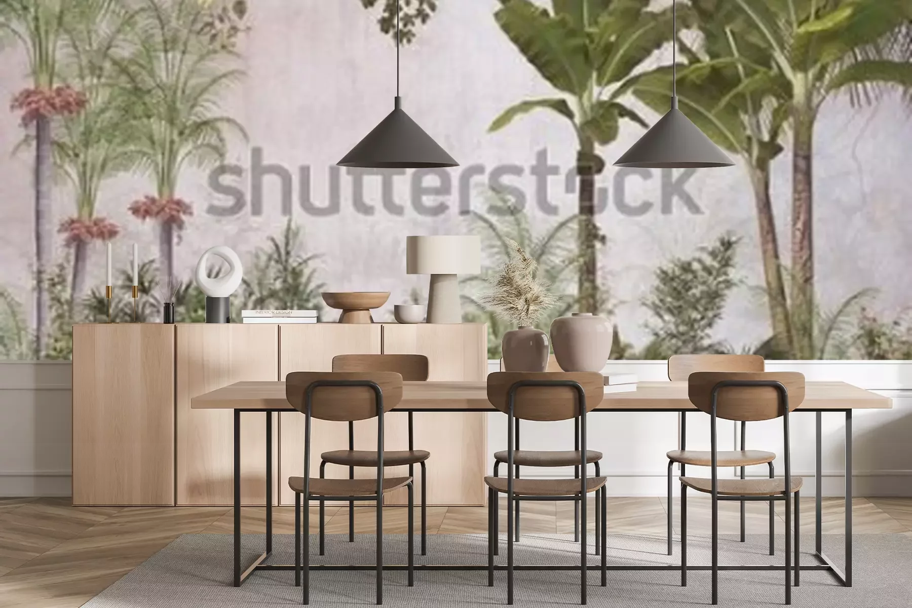 Papier peint  Tropical trees and leaves wallpaper design in foggy forest - 3D illustration