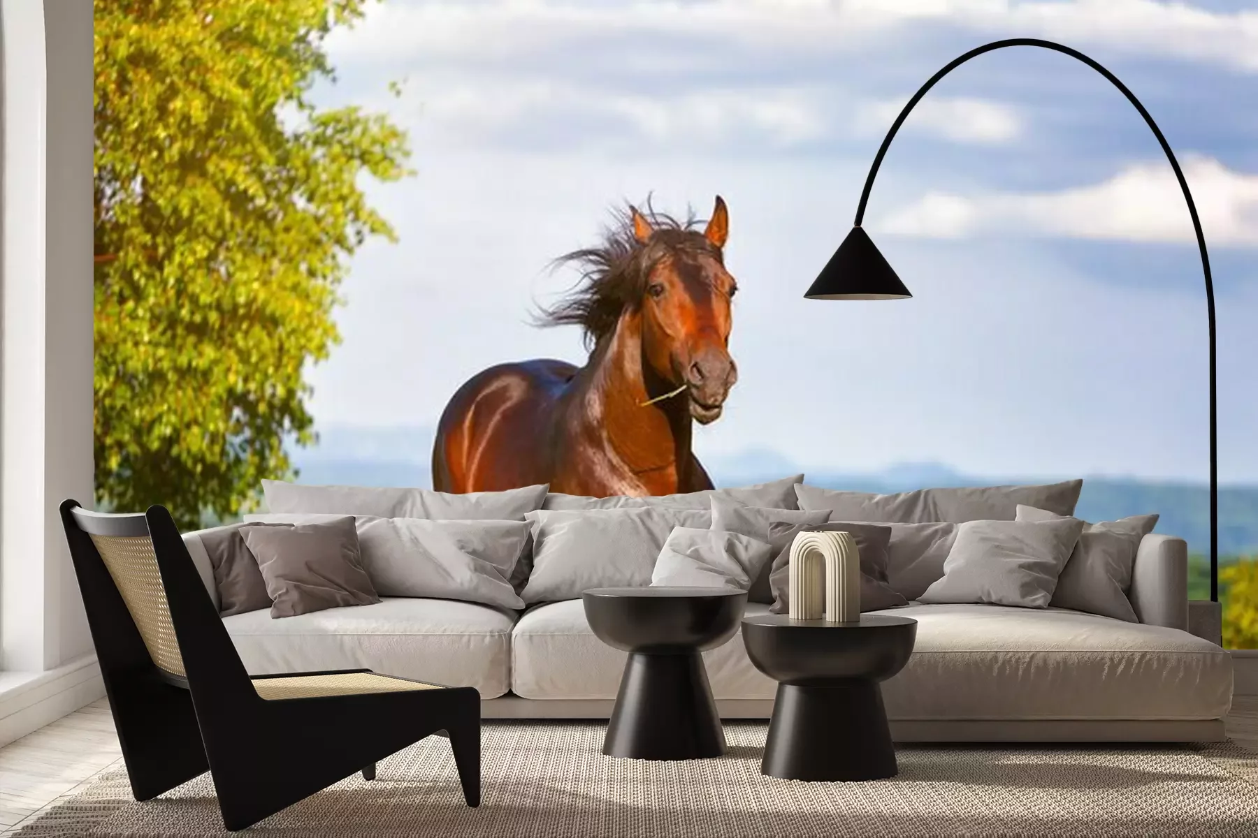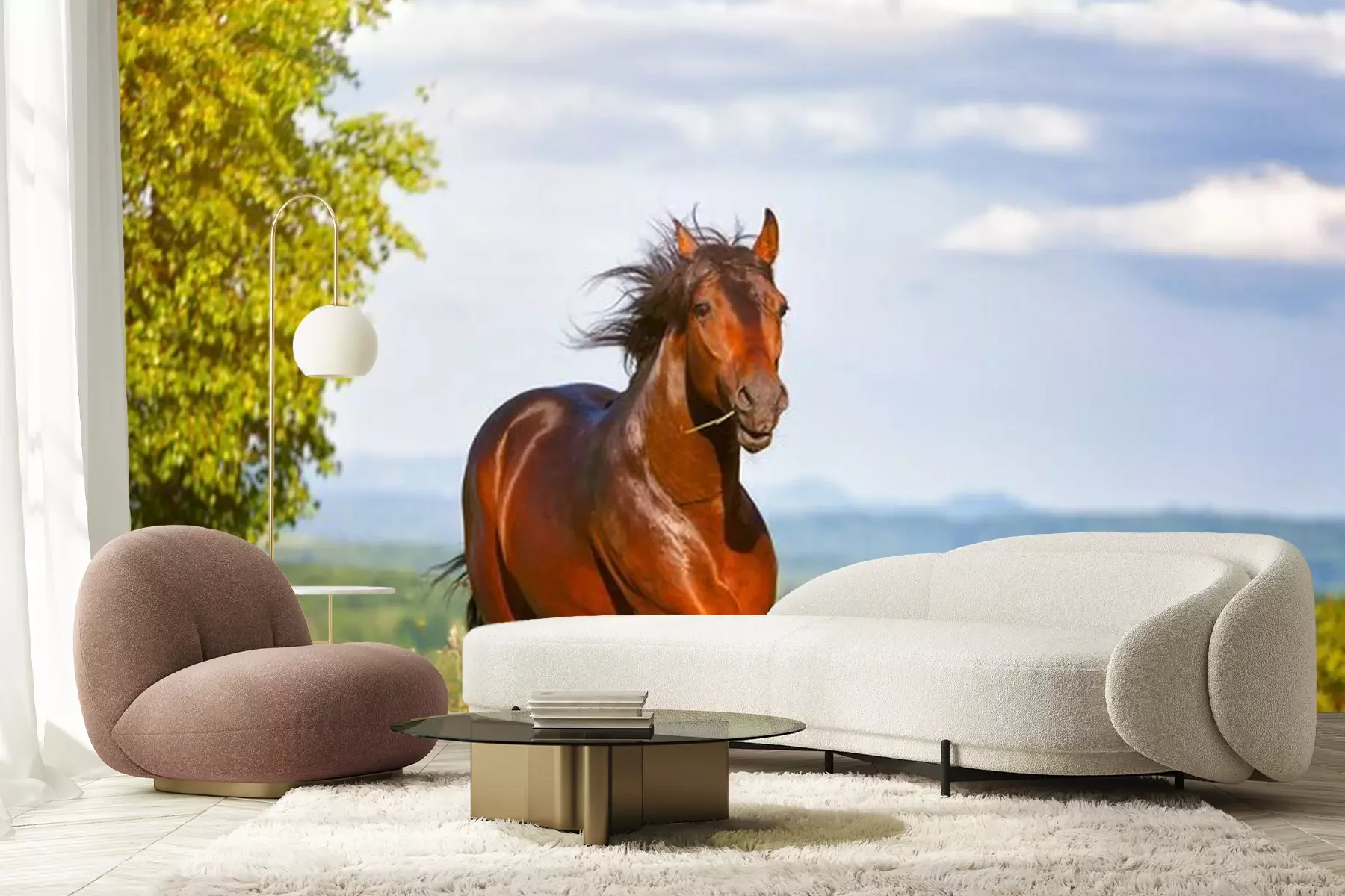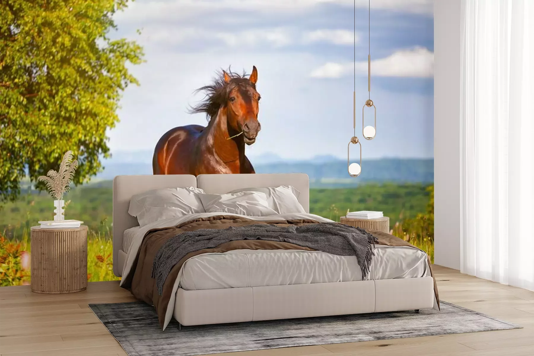 Papier peint  Un cheval galopant dans un pré par une journée ensoleillée