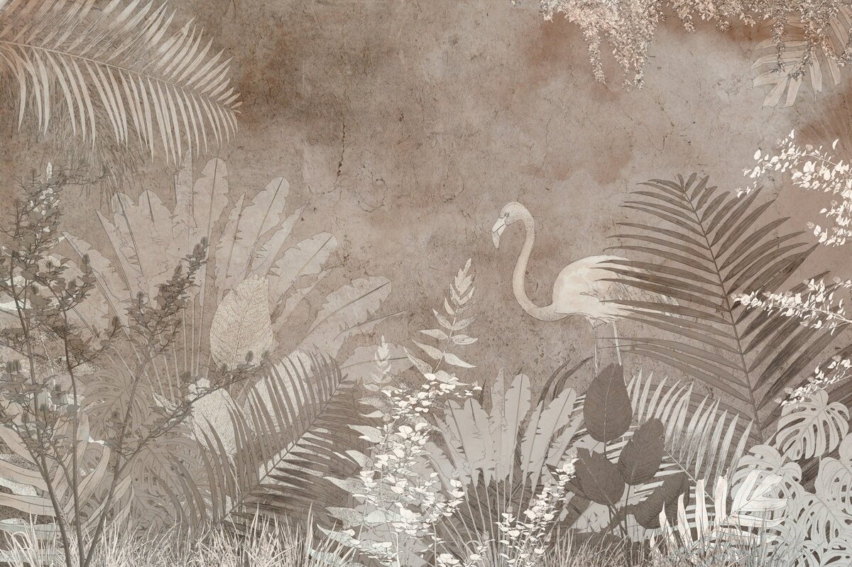 Papier peint : Une composition avec un flamant rose parmi la végétation tropicale