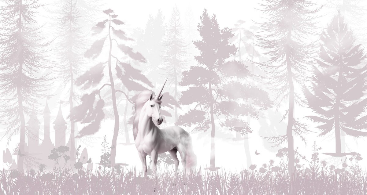 Papier peint : Une licorne et un château dans une forêt de conte de fées