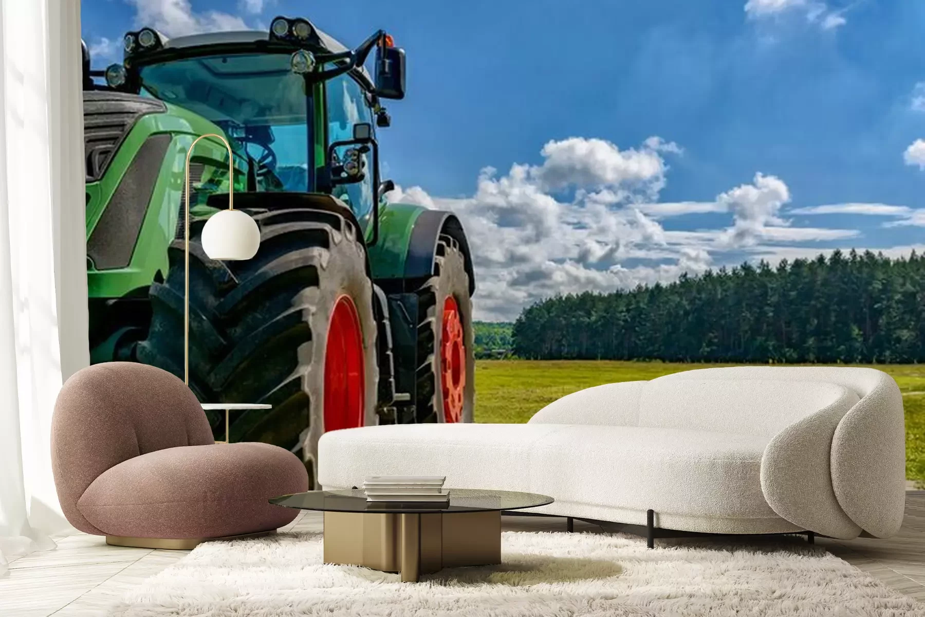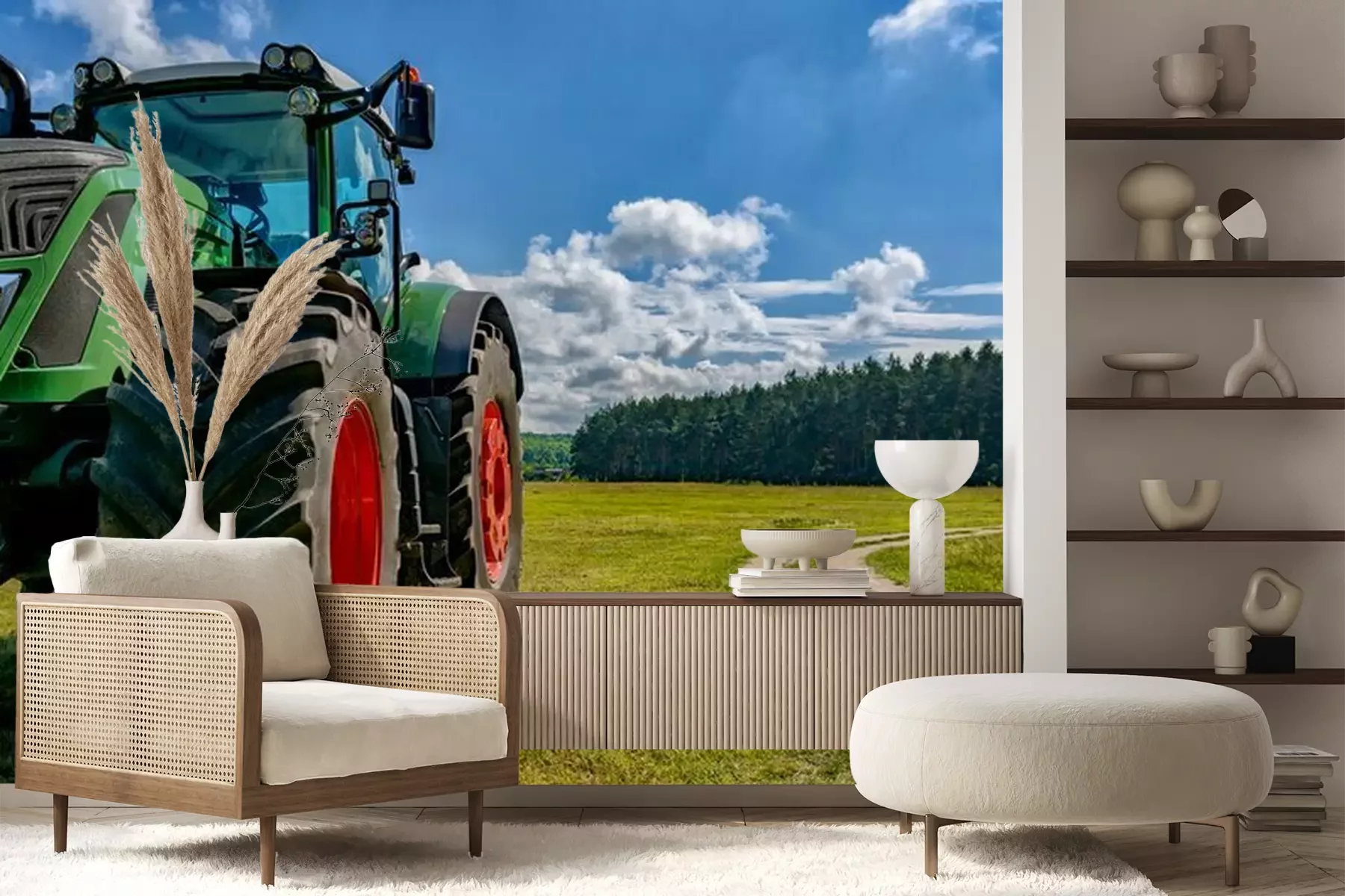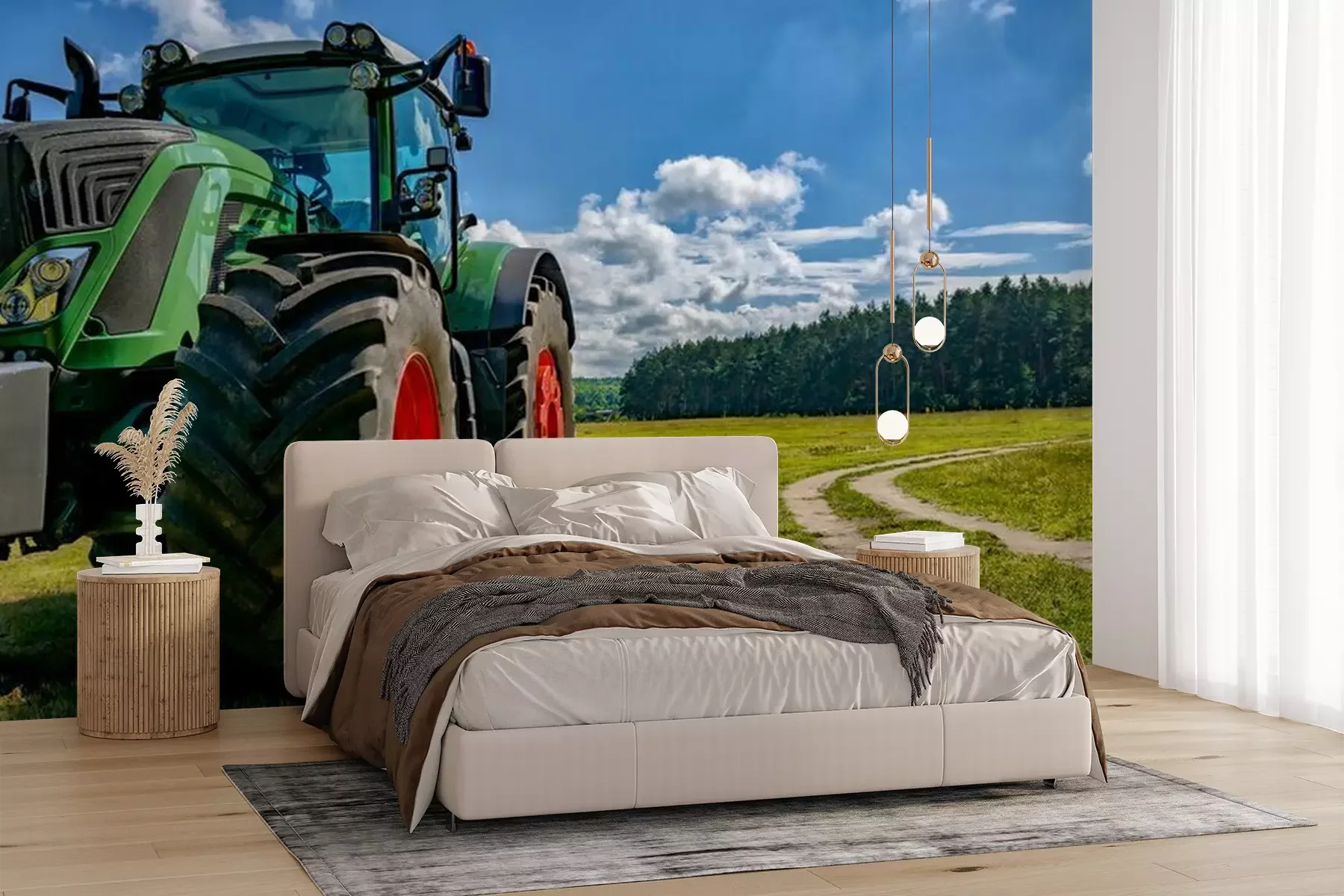 Papier peint  Une partie du tracteur debout dans un champ près de la route.