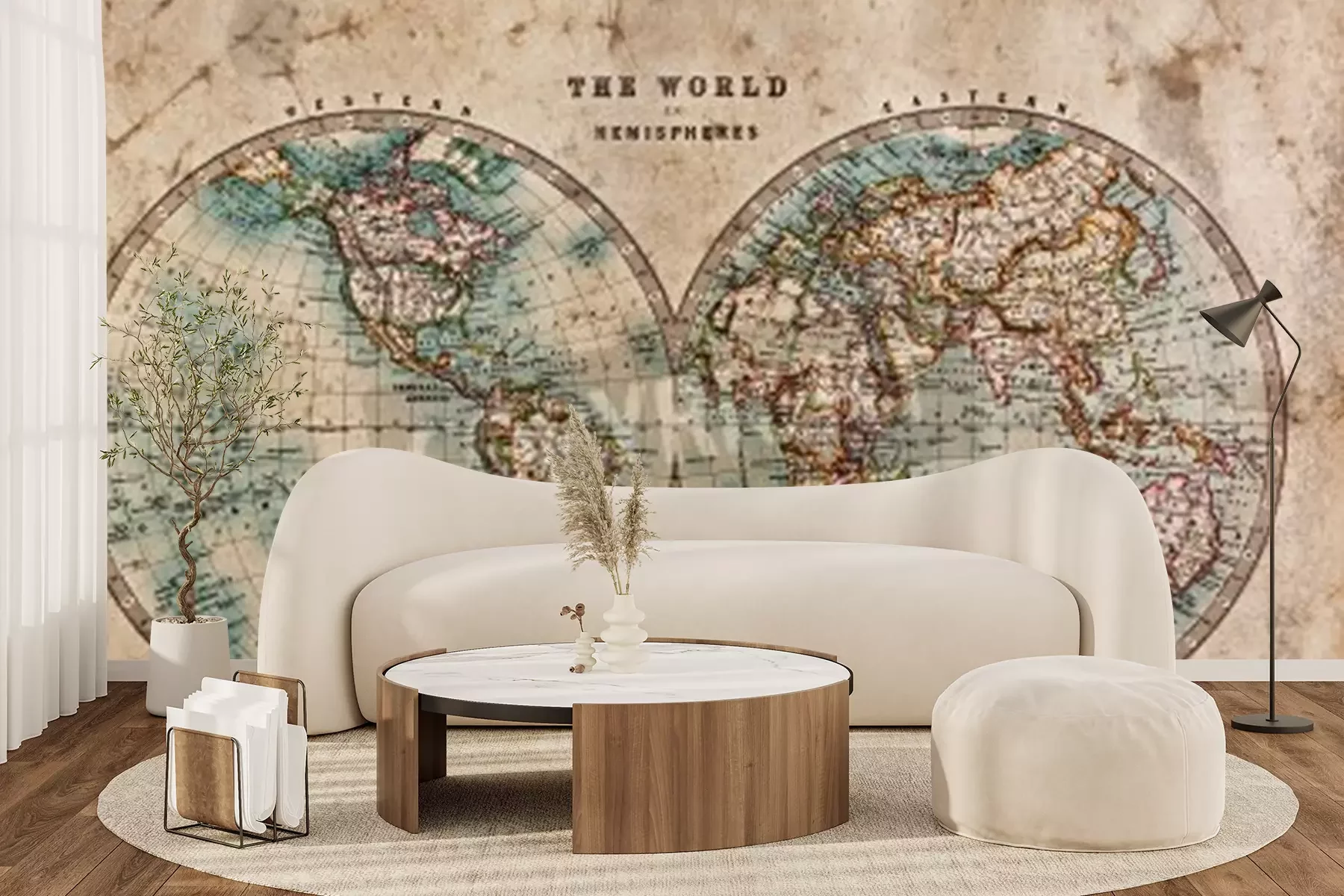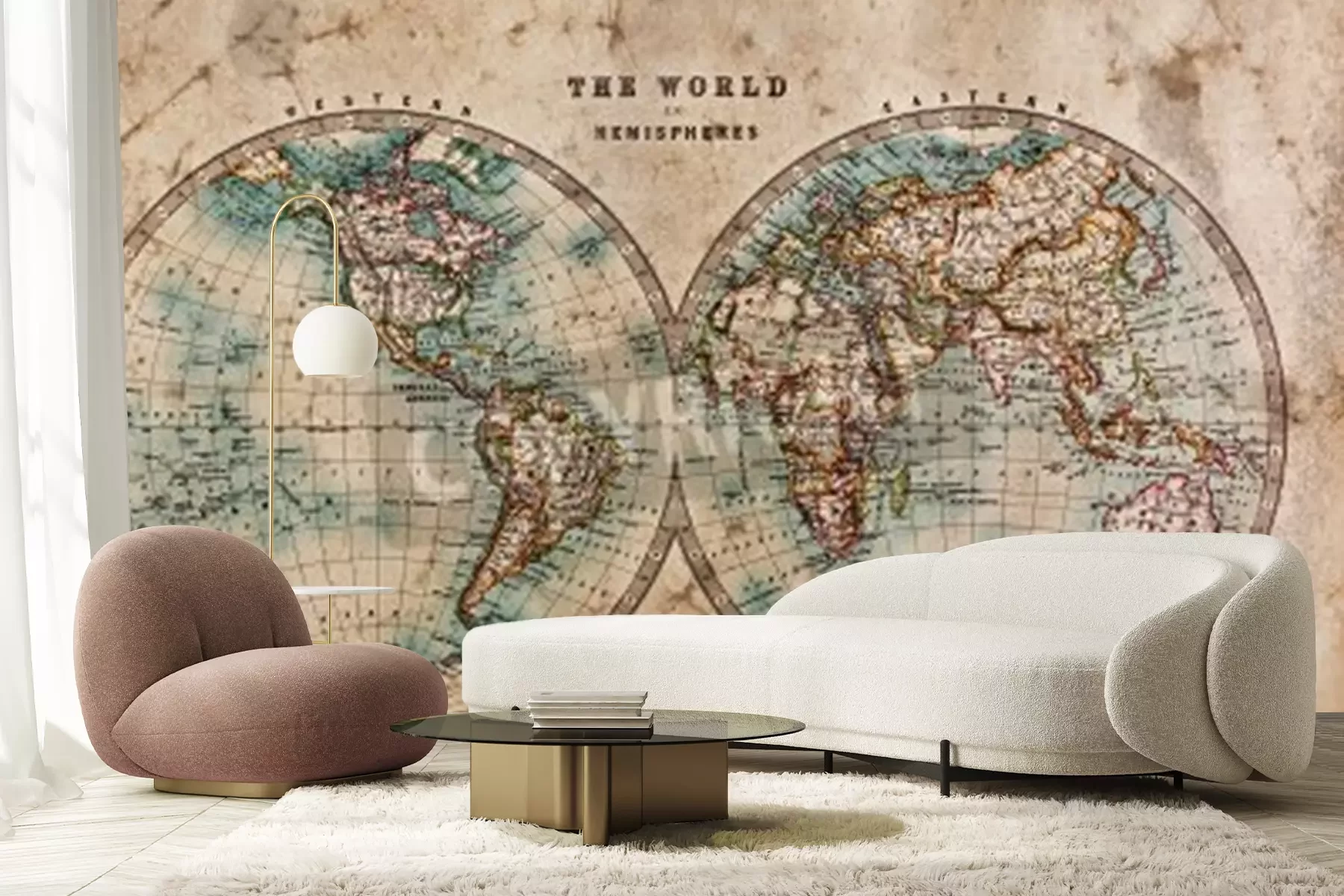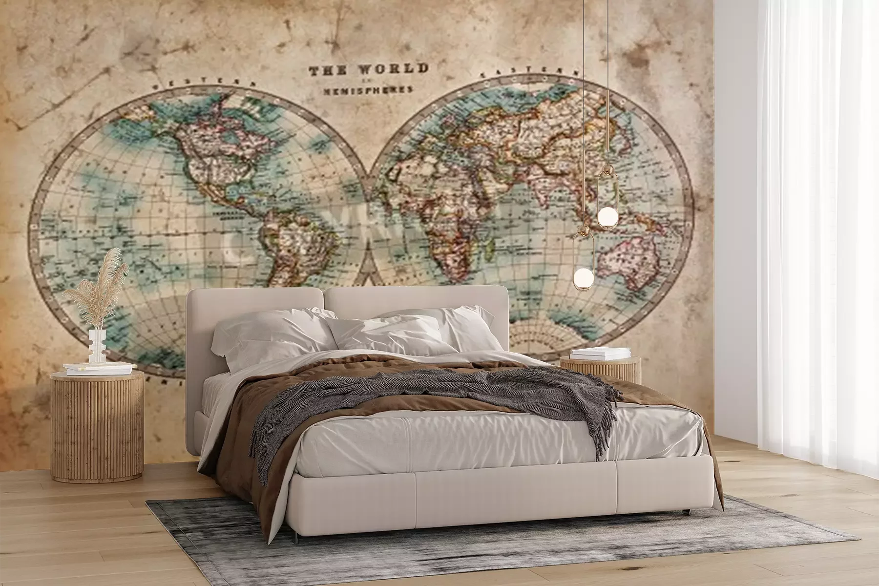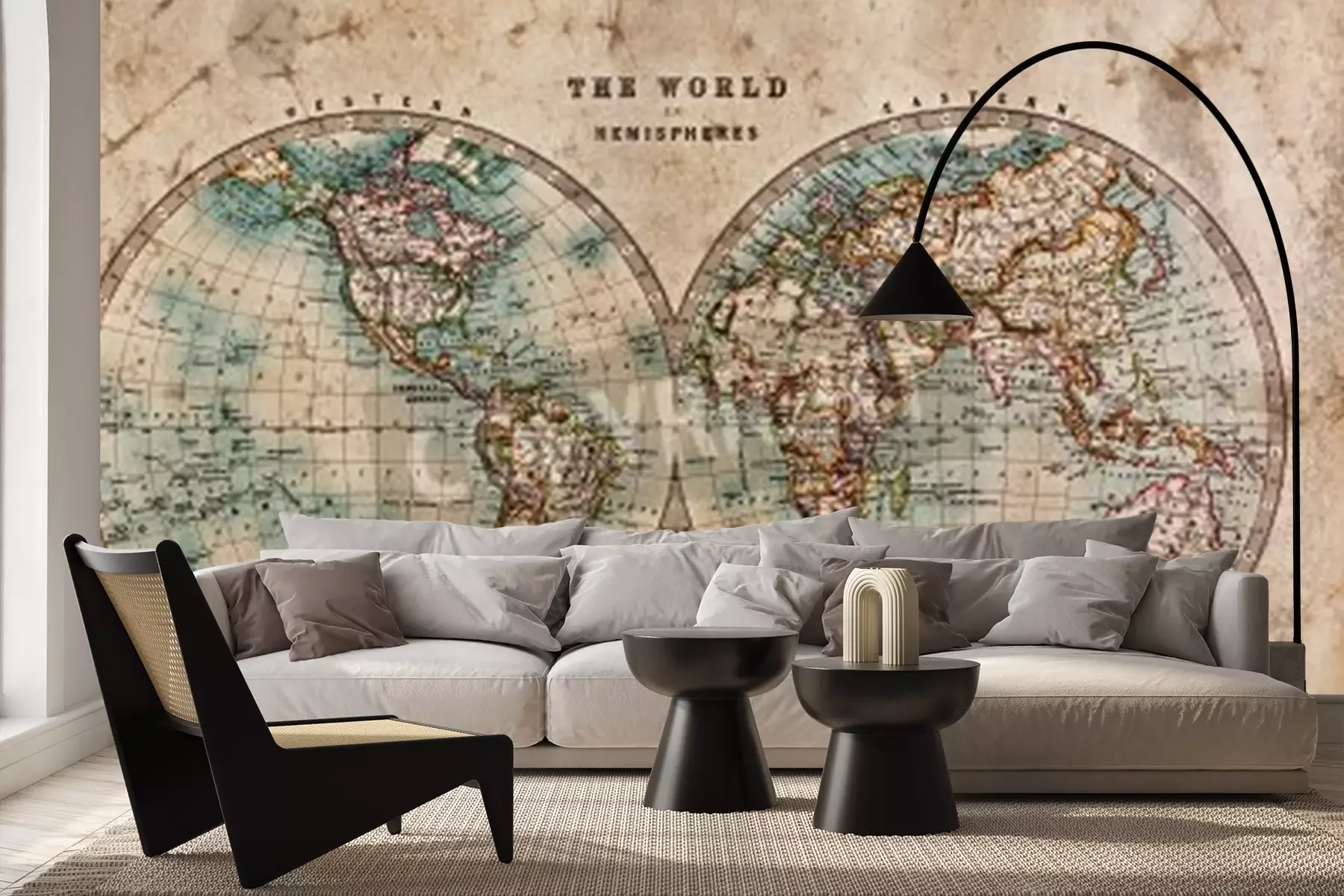 Papier peint  Une véritable vieille carte du monde teinté datant des années 1800 montrant milieu Hémisphères occidentale et orientale avec la coloration de la main.
