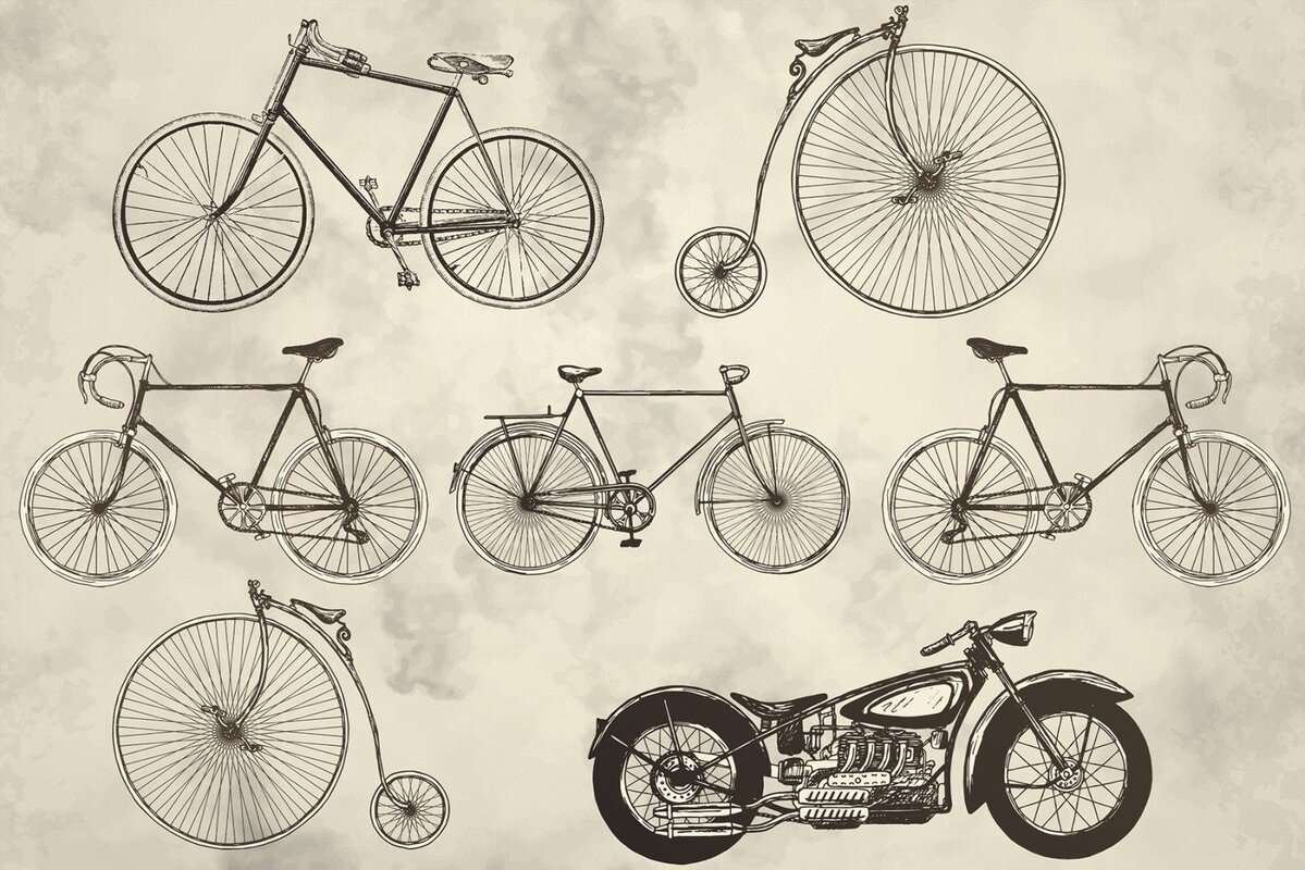 Papier peint : Vélos rétro et moto sur fond gris