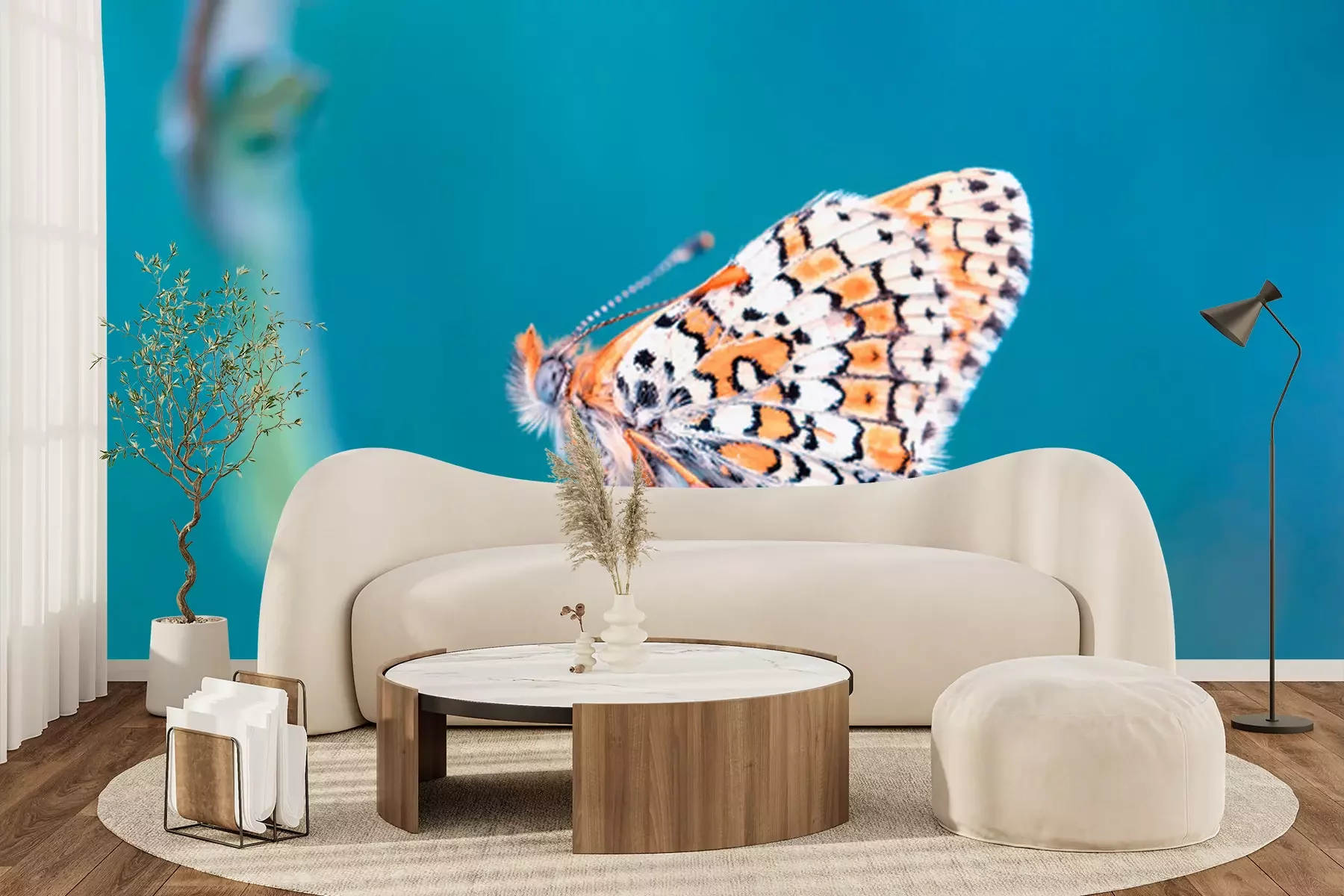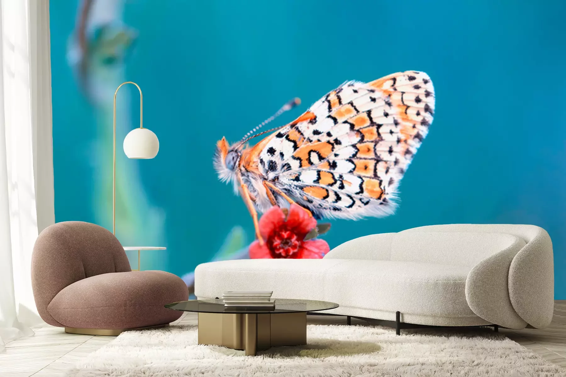 Papier peint  Vue macro d'un papillon assis sur des fleurs rouges