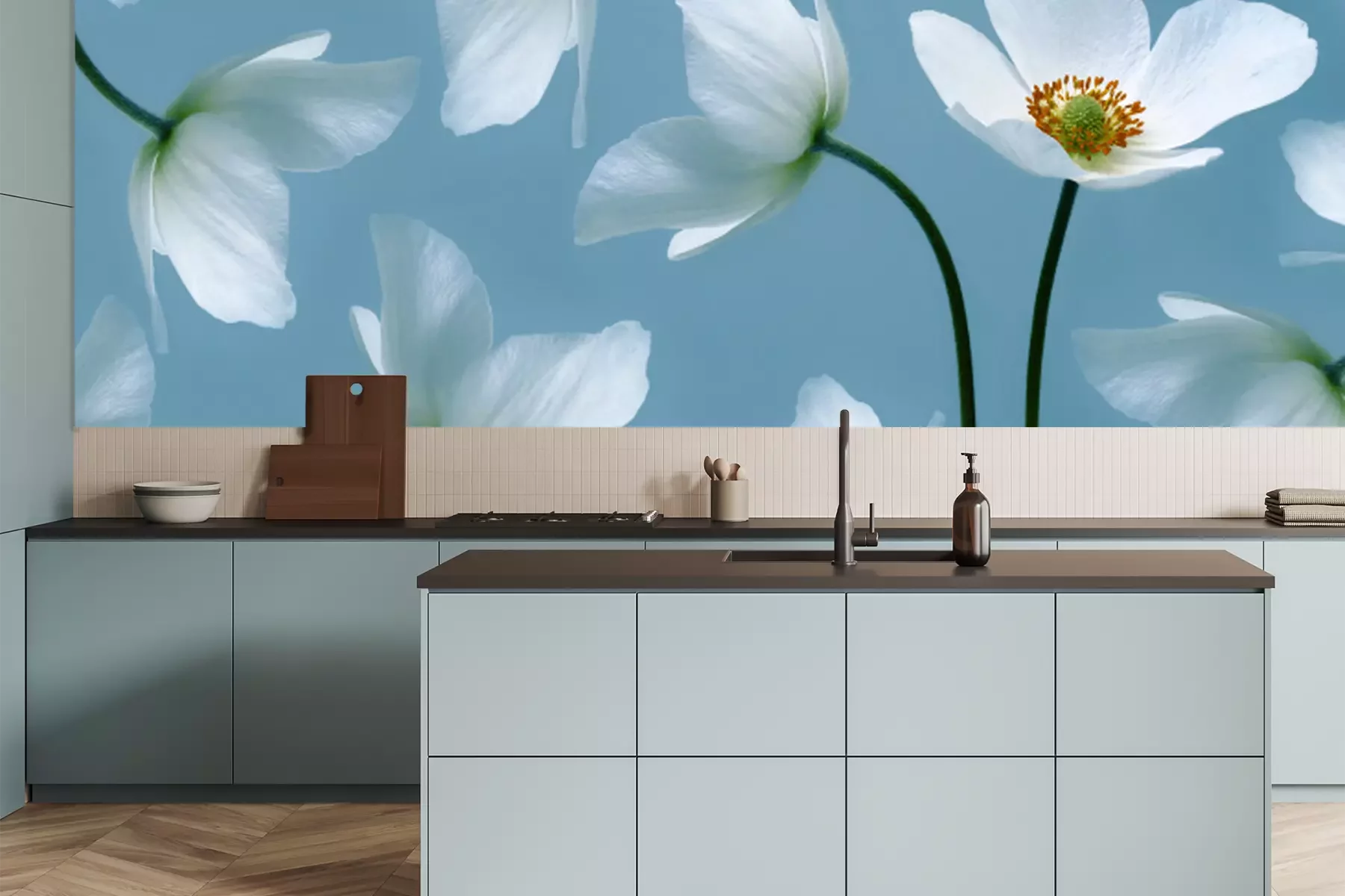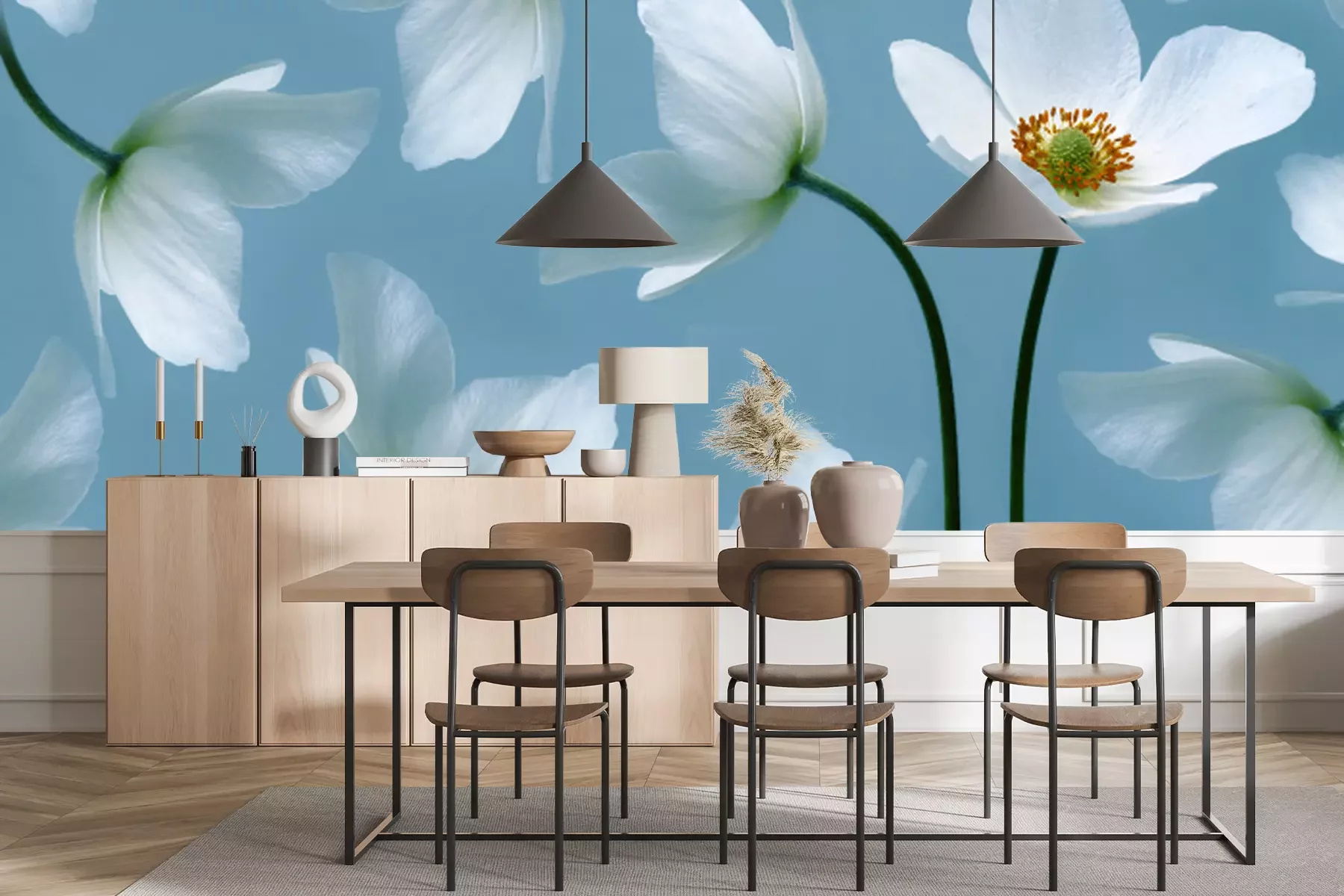 Papier peint  White beautiful primrose. Flowers on a green stem. Studio shot. Nature.