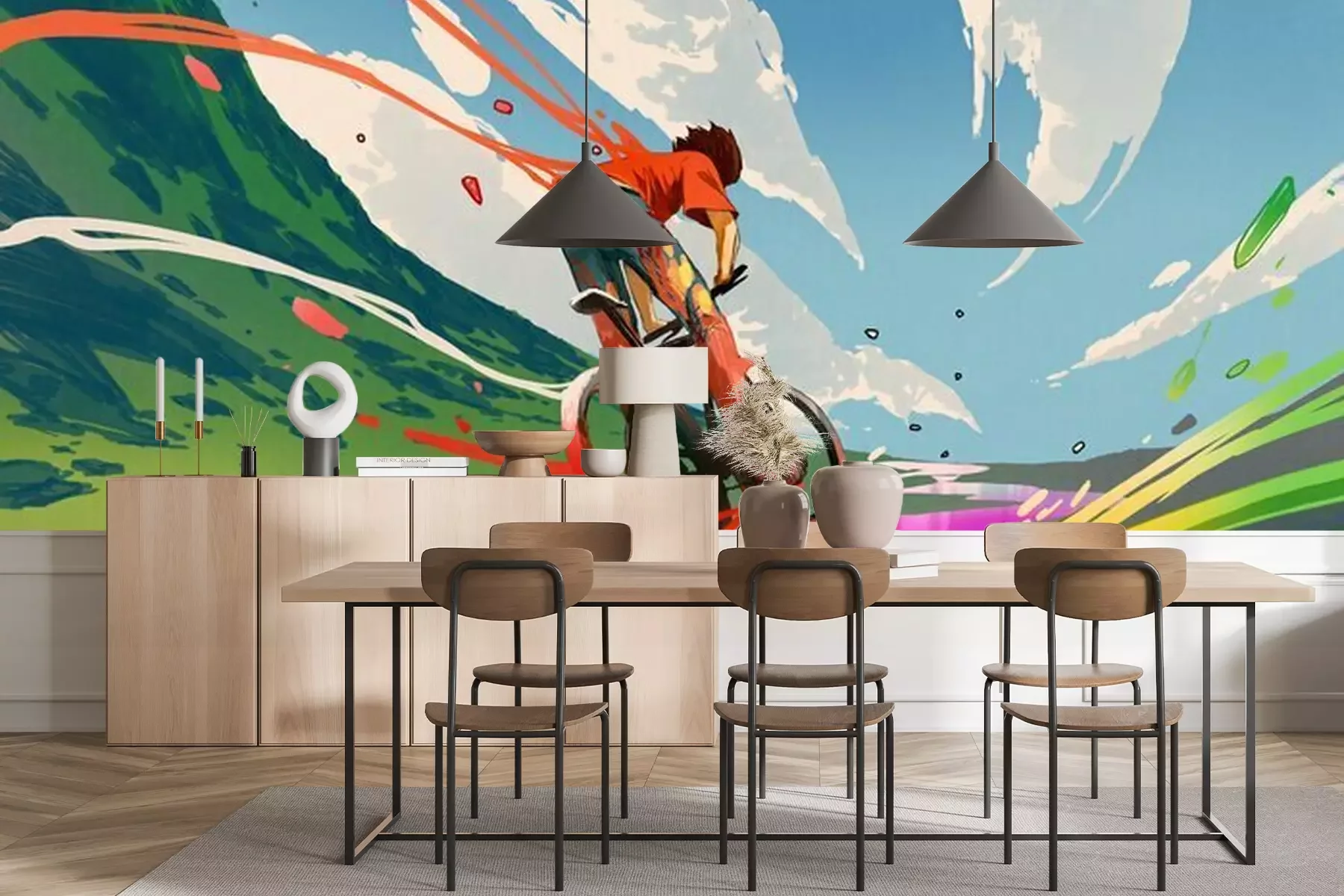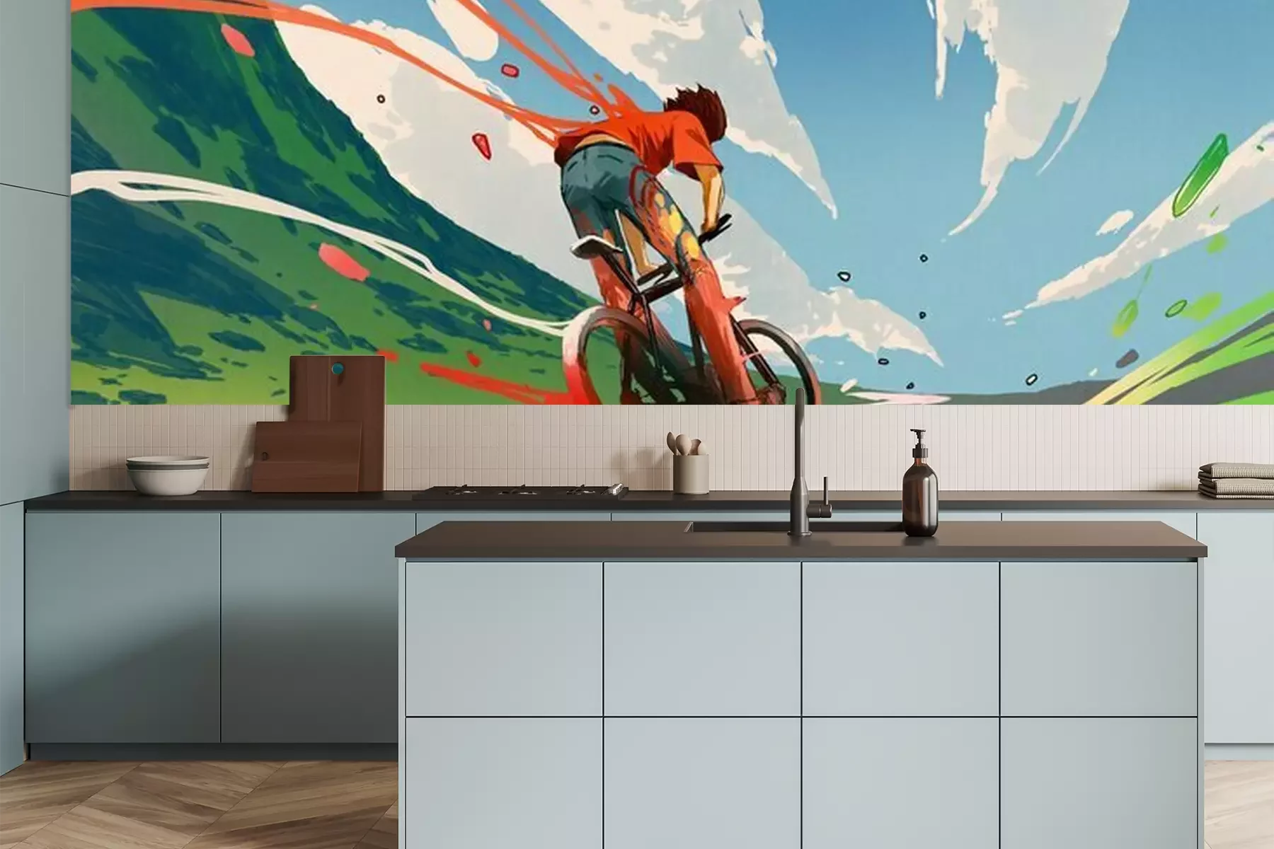 *Le rabais ne s'applique pas aux adhésifs, accessoires et cartes-cadeaux.Ce papier peint illustration exposant un garçon à vélo correspond à une solution idéale qui ravira à la fois les amateurs de cyclisme et les fans d'anime, à savoir les films d'animation japonais. Cette proposition se distingue notamment par son caractère particulièrement dynamique. La disposition des nuages et la trace multicolore laissée par le cycliste forment une composition créant une superbe impression de mouvement. Ainsi, ce papier peint coloré pourra animer une décoration d’intérieur tout en lui donnant du caractère. Puisqu’il s'agit d'une illustration colorée, un tel motif pourra être utilisé pour la décoration d’une chambre d'enfant. Si votre enfant aime faire du vélo, il appréciera certainement ce papier peint vélo. Sur ce motif, le cycliste se dirige vers une vallée s'étendant entre des collines verdoyantes, ce qui permettra d'introduire un accent naturel dans la pièce. Ce modèle constitue une excellente solution pour rendre instantanément la décoration beaucoup plus conviviale et chaleureuse. Il convient également de mentionner que ce type de papier peint coloré apportera une ambiance joyeuse à cette partie de la maison. Grâce à sa palette de couleurs équilibrée, aucun ne risque de créer une impression chaotique ou d’alourdir la décoration. Ce modèle peut devenir bien plus qu’une simple décoration murale. En optant pour un motif exposant une discipline sportive, dans ce cas le cyclisme, il encouragera l'enfant à passer son temps libre de manière active et lui permettra de mettre en valeur sa passion pour le vélo. Ce papier peint conviendra également à la décoration d’une chambre d'adolescent. Le style anime de cette l'illustration ne manquera pas de ravir un adolescent intéressé par la culture pop japonaise. Comme tout fan d'anime le sait, bien qu'il s'agisse d'un motif dessiné, ce style n’est pas forcément infantile. Si ce papier peint vélo est utilisé pour former la dominante décorative d’une chambre d’adolescent, il la transformera complètement, même si les meubles et les autres éléments de la pièce demeurent inchangés.