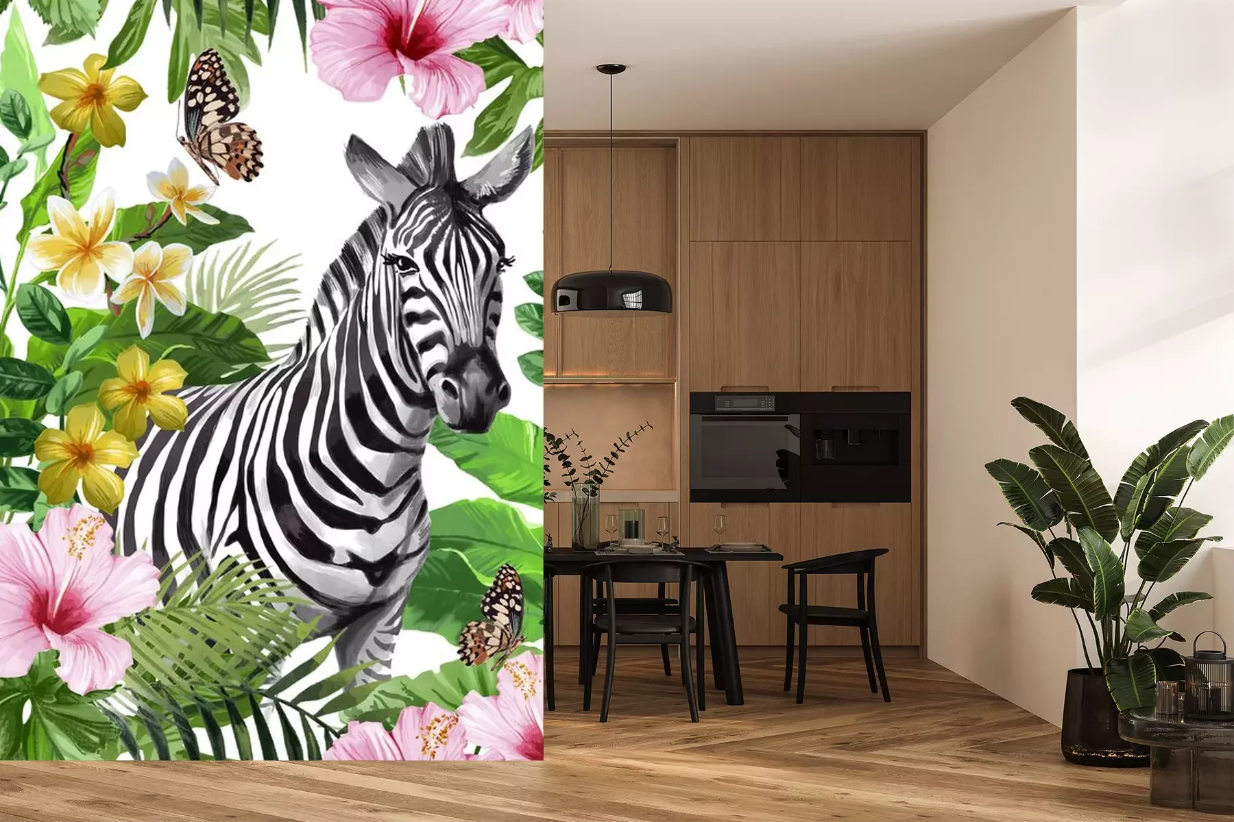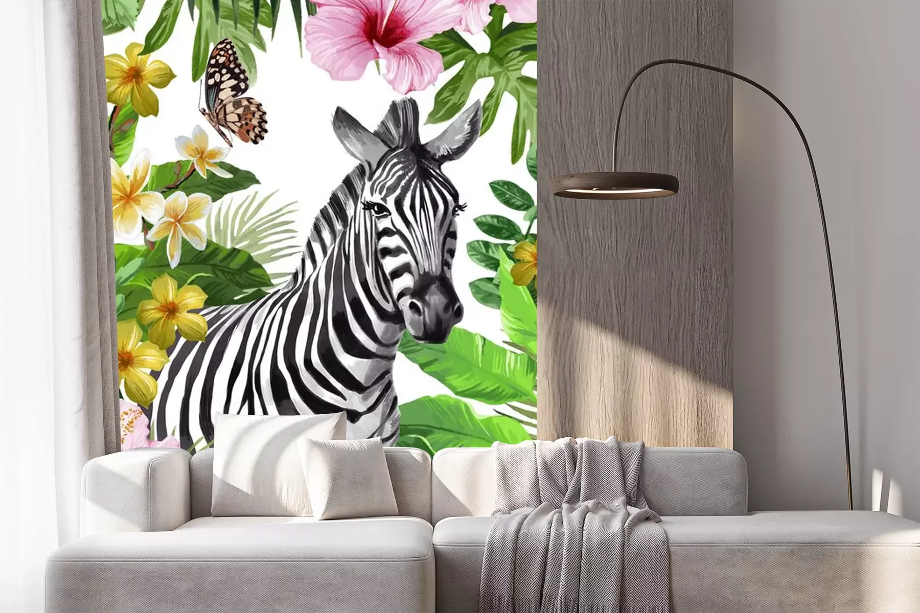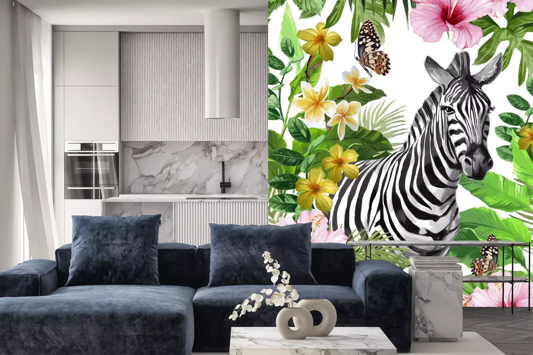 Papier peint  Zèbre au milieu de fleurs tropicales colorées