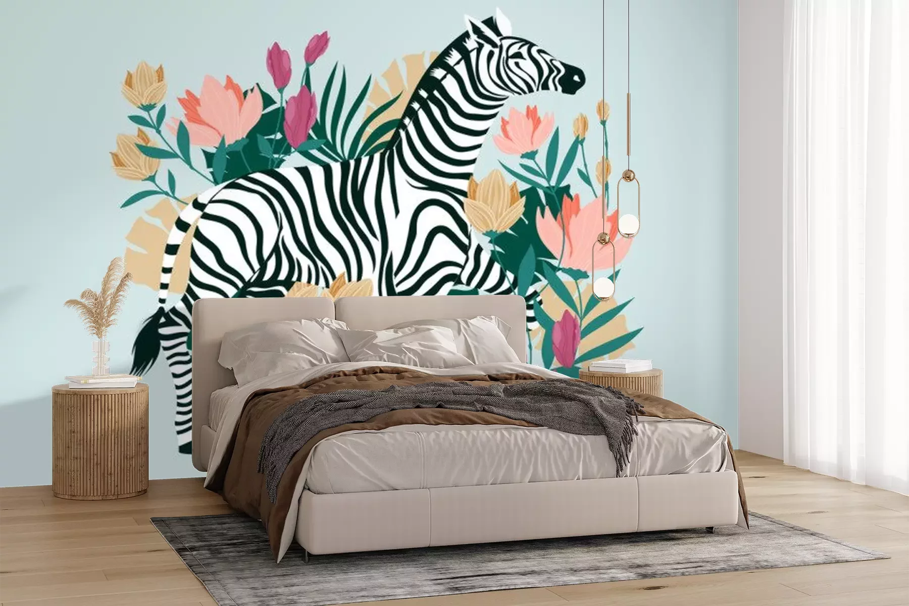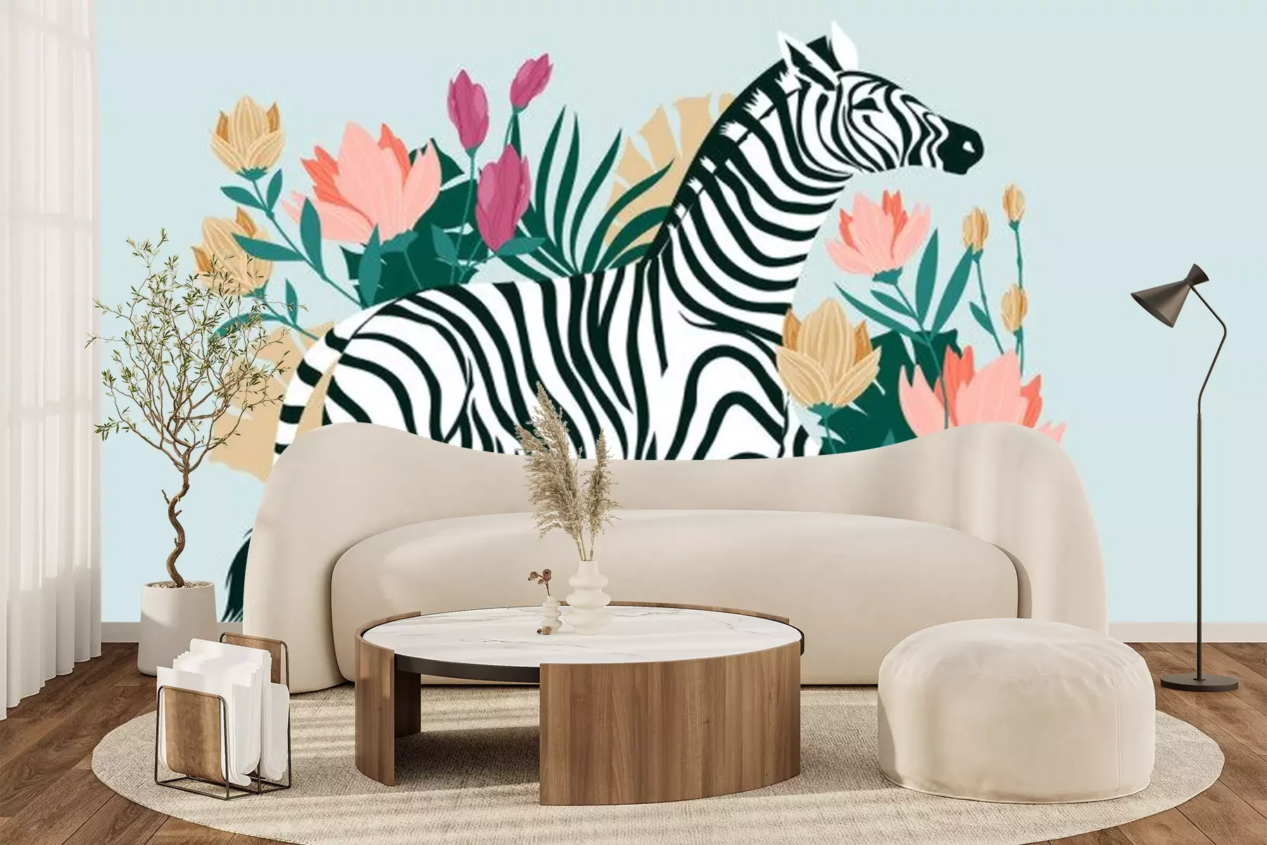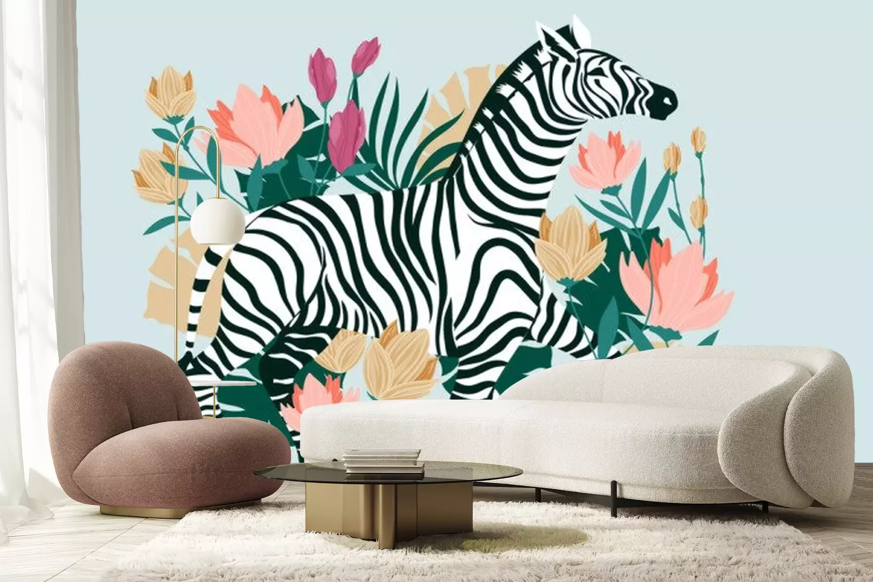 Papier peint  Zèbre sauvage au milieu de fleurs tropicales