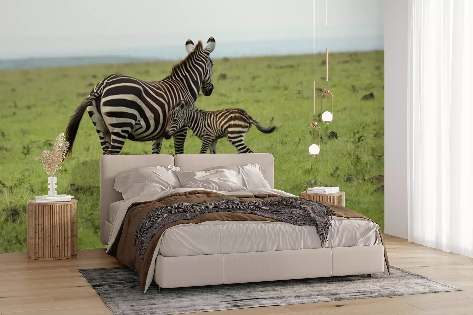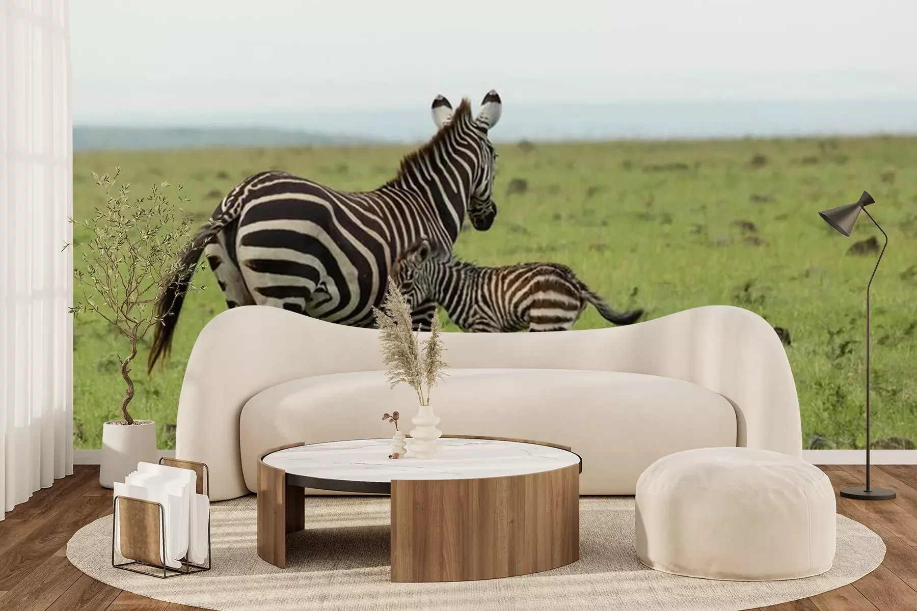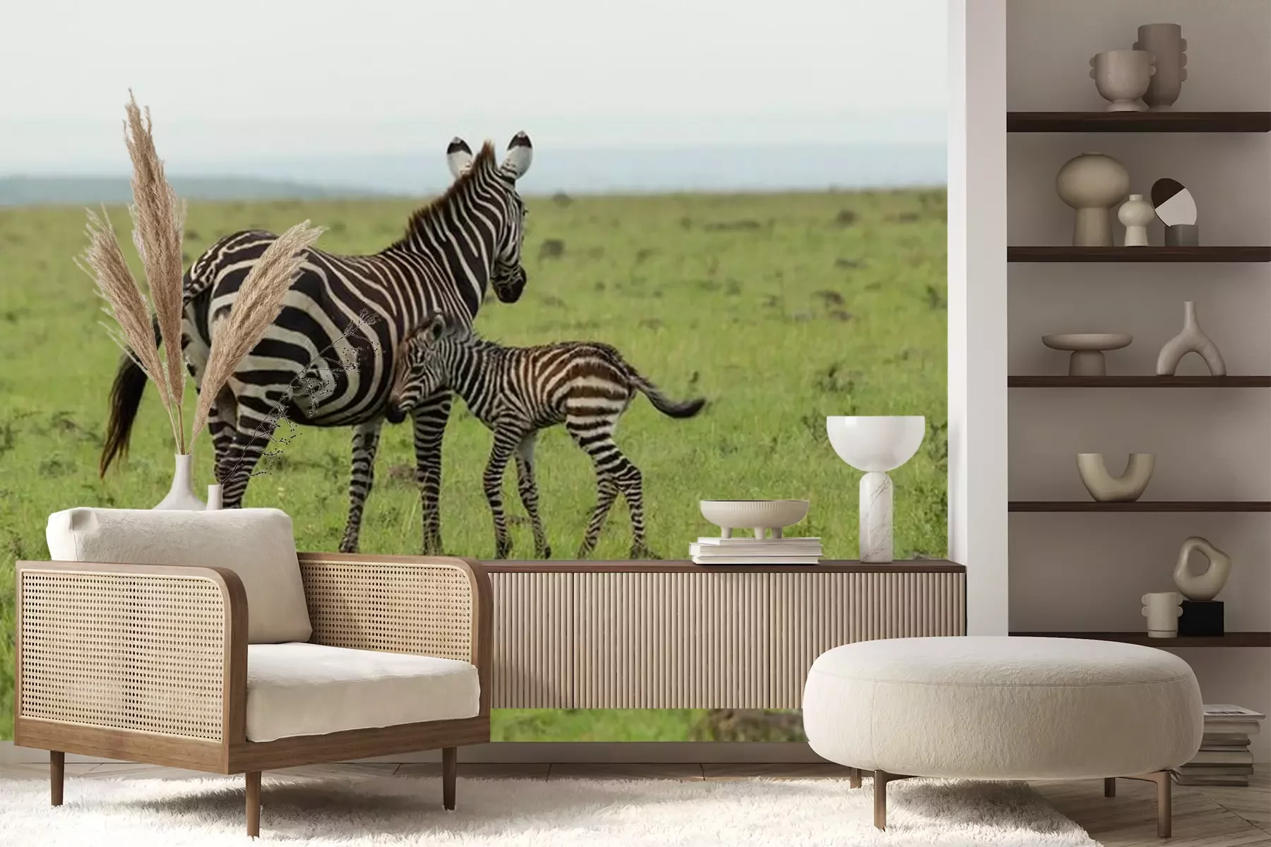 Papier peint  Zèbres qui marchent sur l'herbe verte