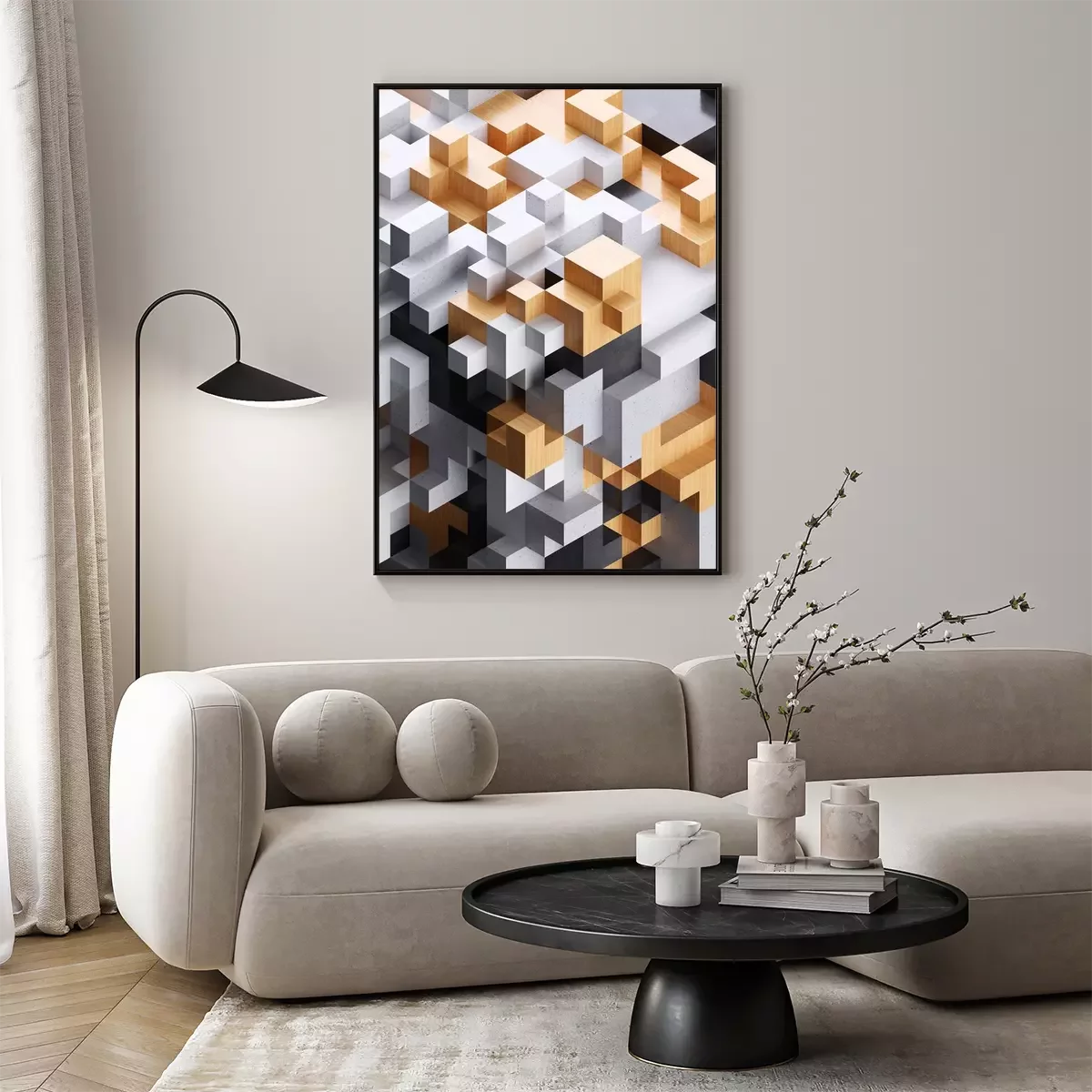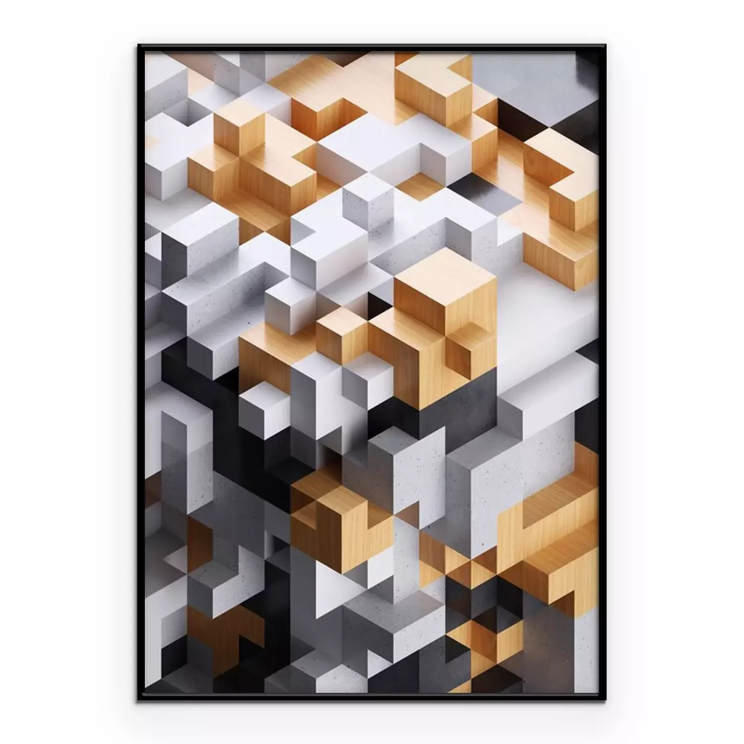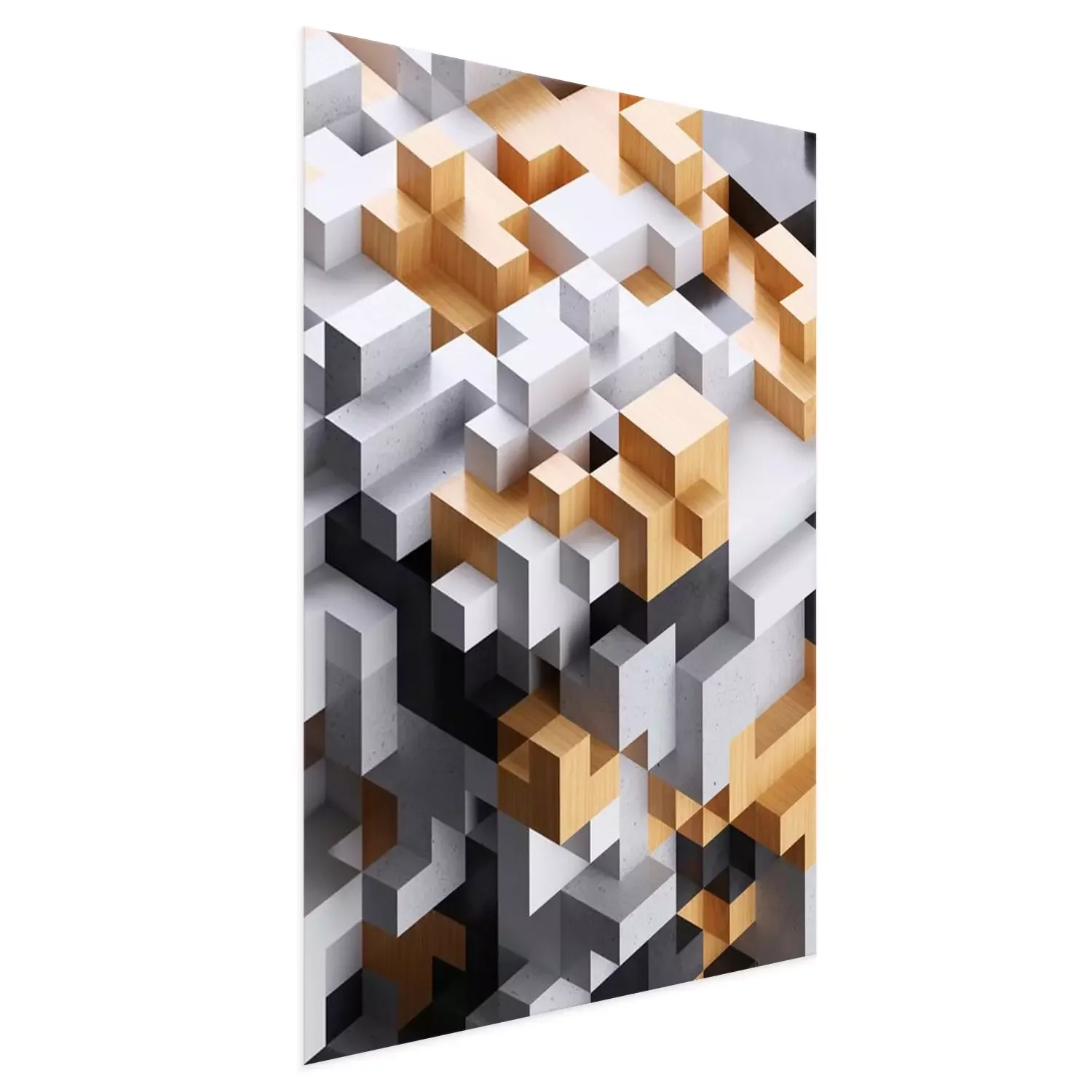 Poster  3d rendering, abstract cube background, voxel mosaic, geometric shapes, modern construction materials, wood and stone texture