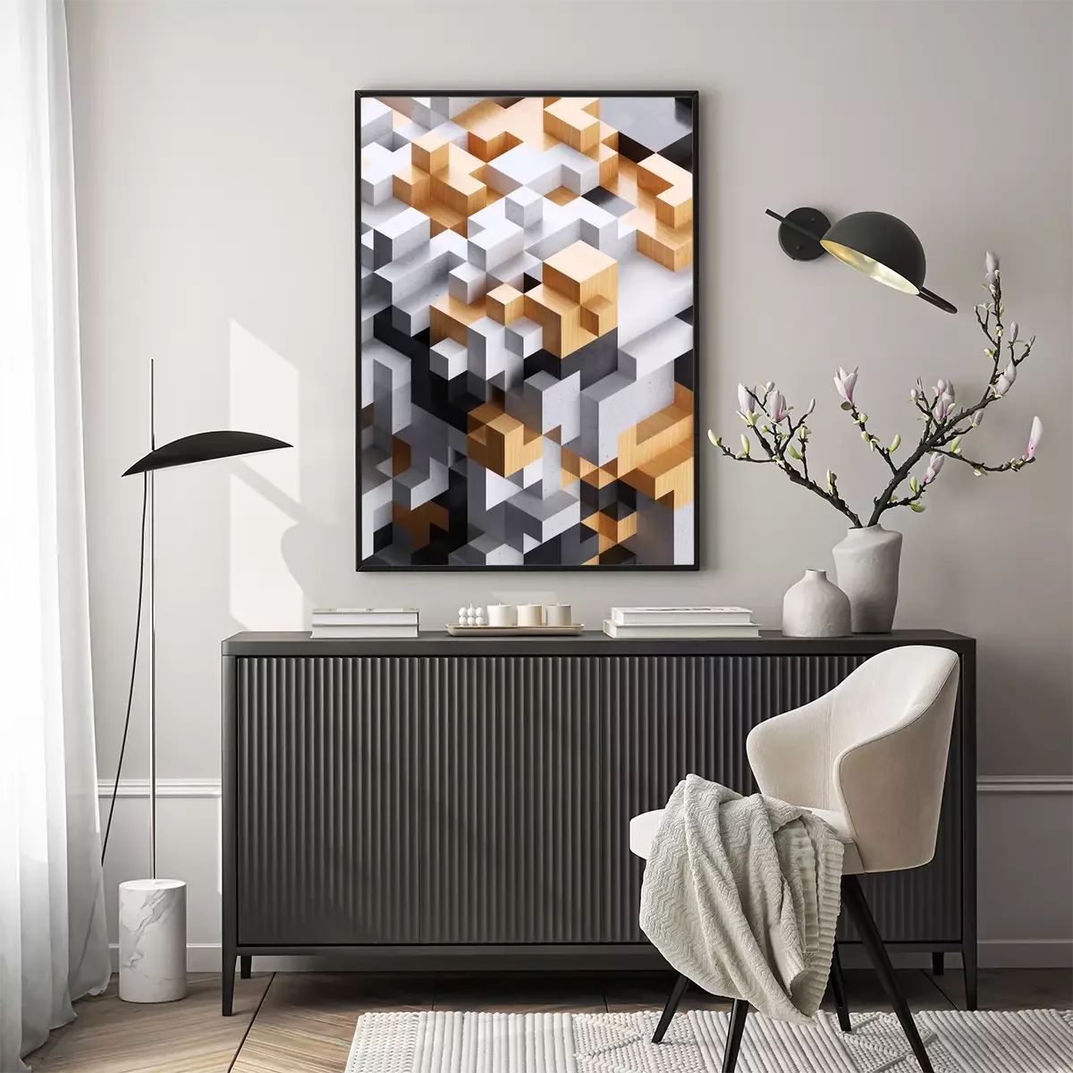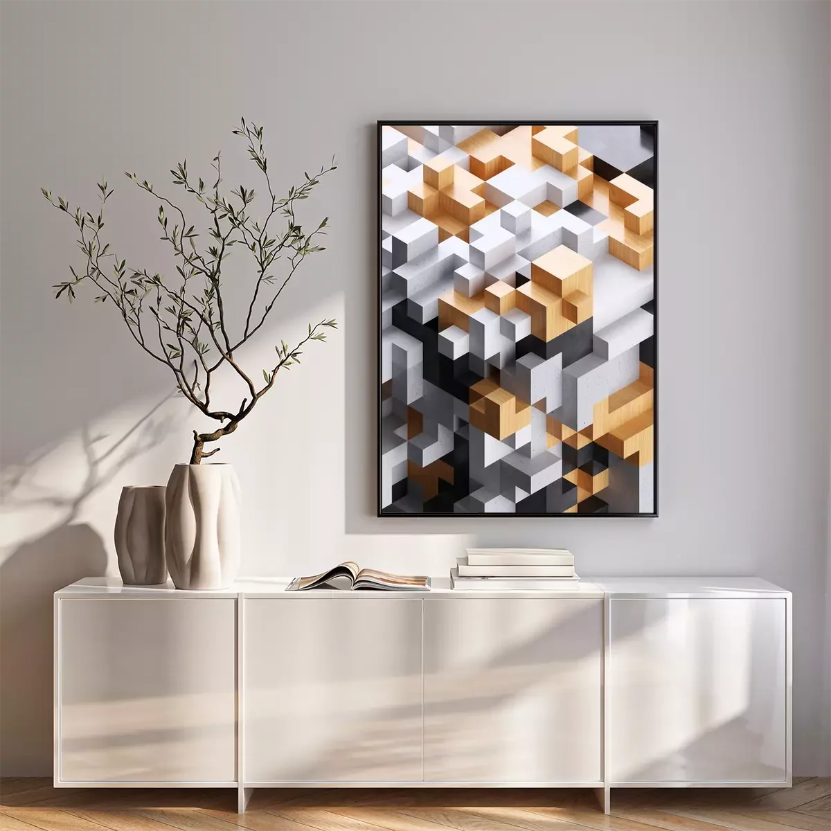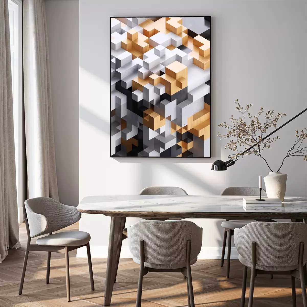 Poster  3d rendering, abstract cube background, voxel mosaic, geometric shapes, modern construction materials, wood and stone texture